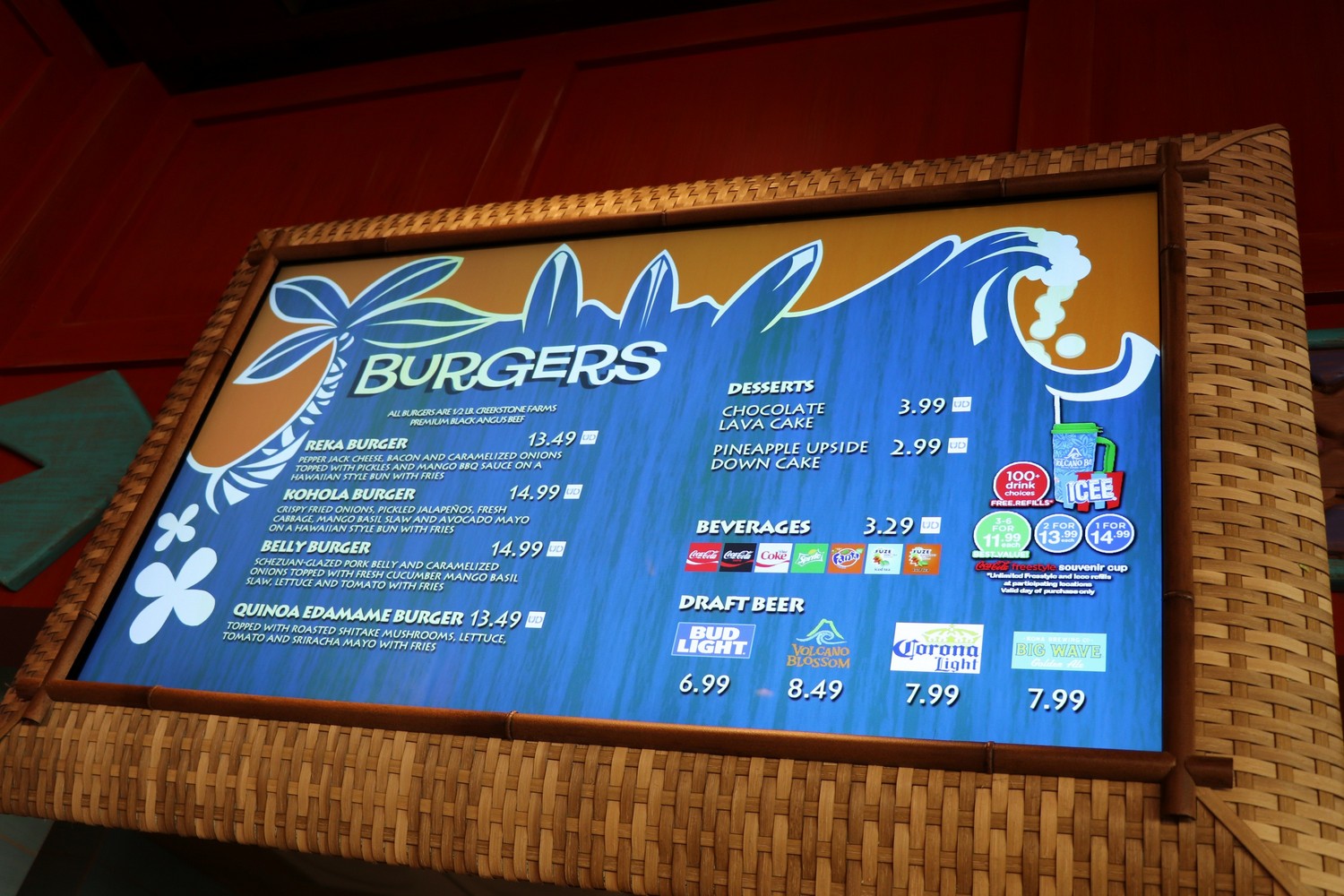 The menu featured at Volcano Bay is probably as unique of a menu you’ll find at a theme park, offering a variety of items that should satisfy any taste bud. The park offers 4 different restaurants, but we suggest Kohola Reef Restaurant and Social Club for your lunch and/or dinner spot. Their menu features BBQ, burgers, chicken, flatbreads, and more – so there is enough of a selection if your party is in the mood for different items. During our