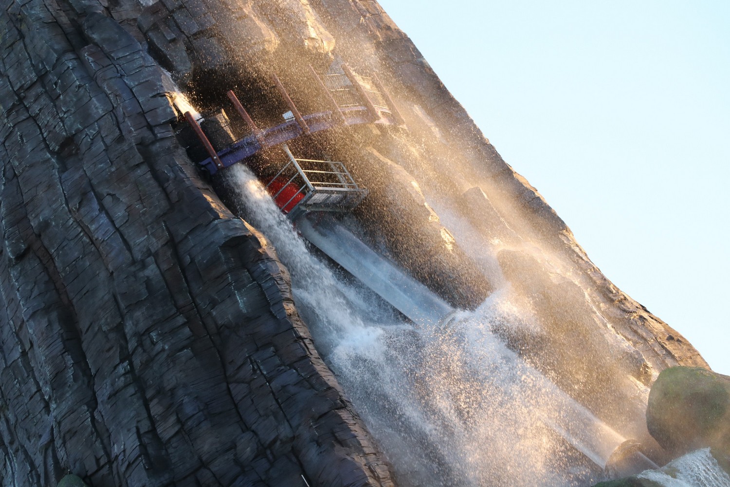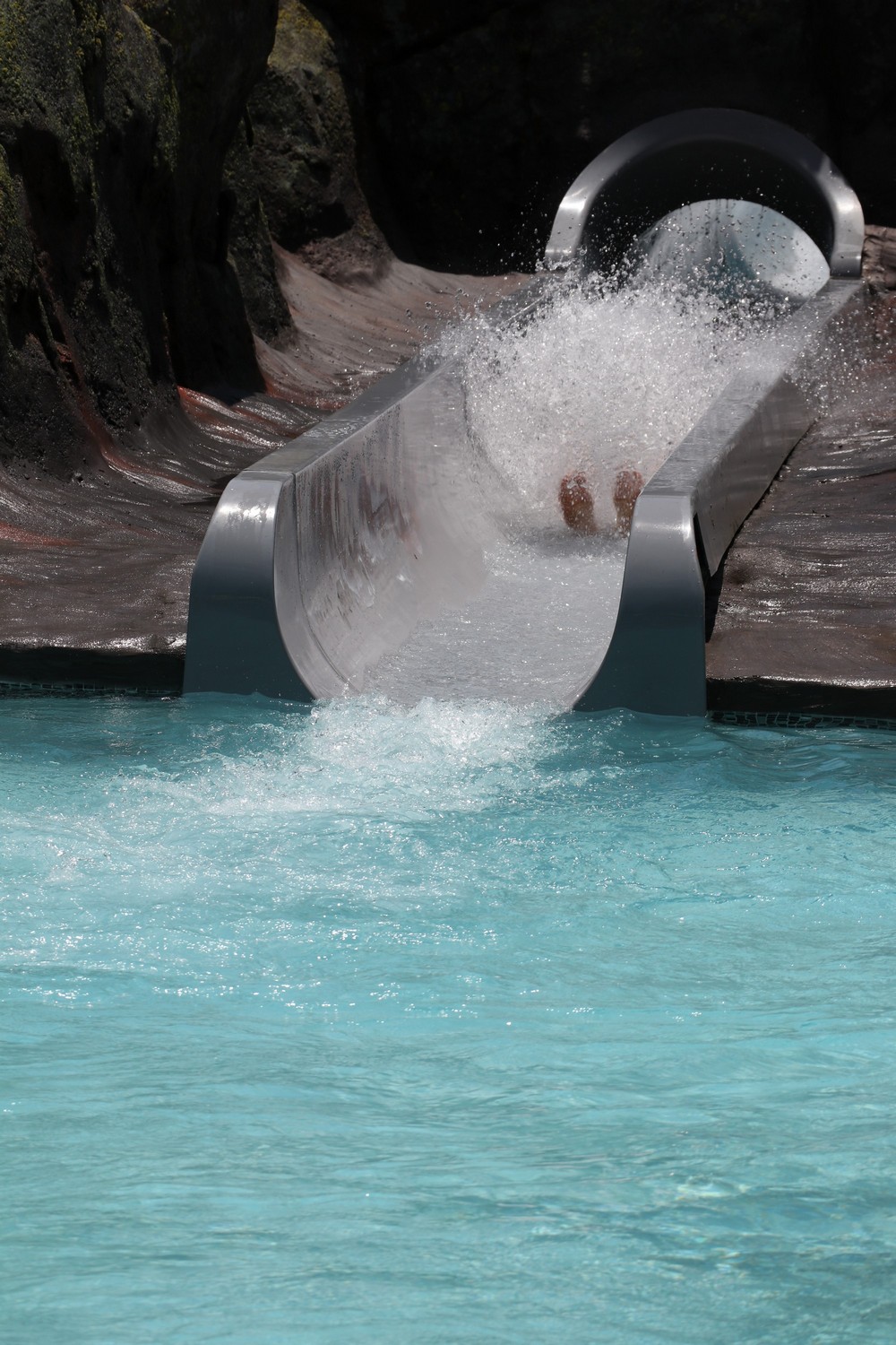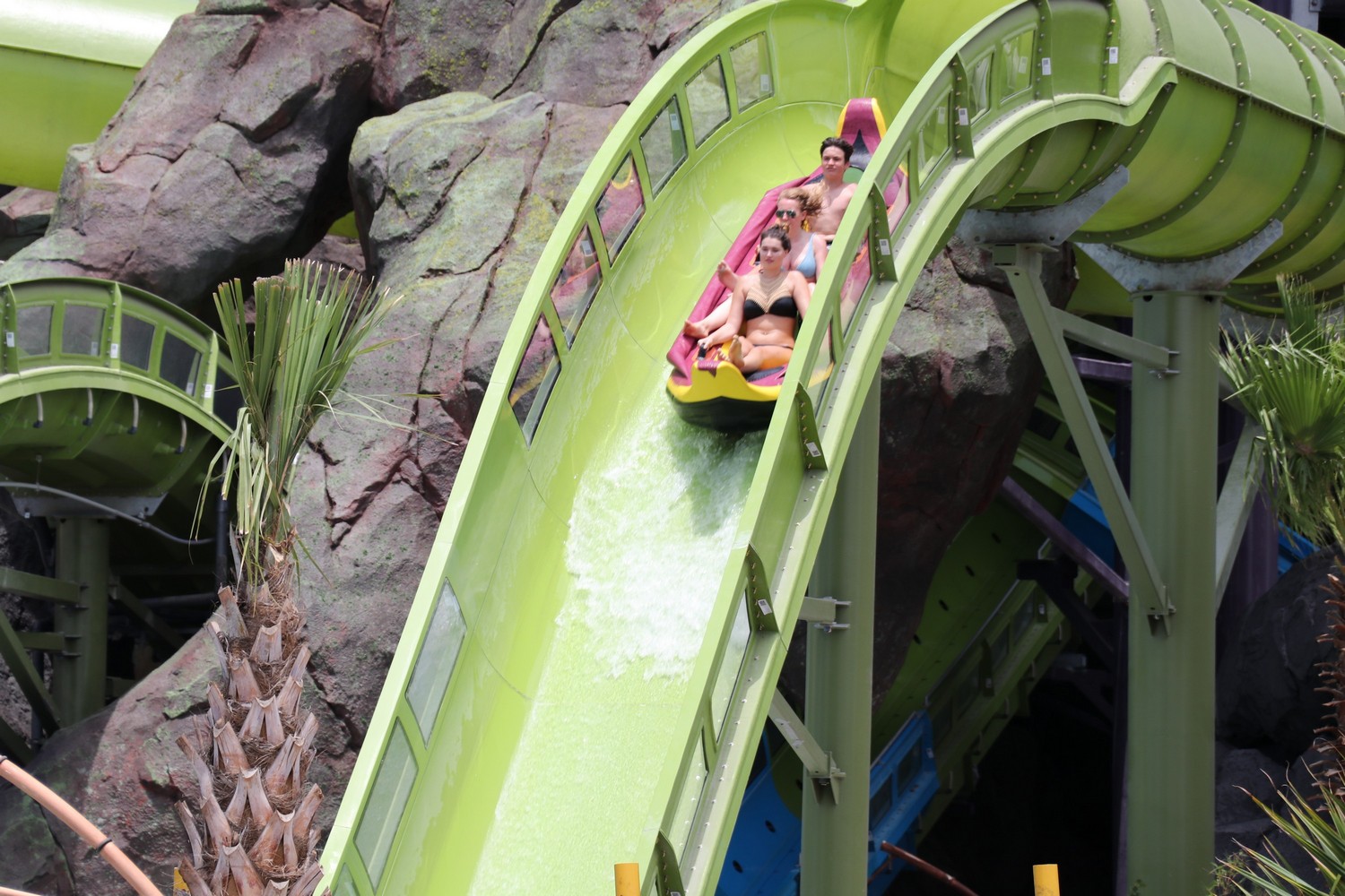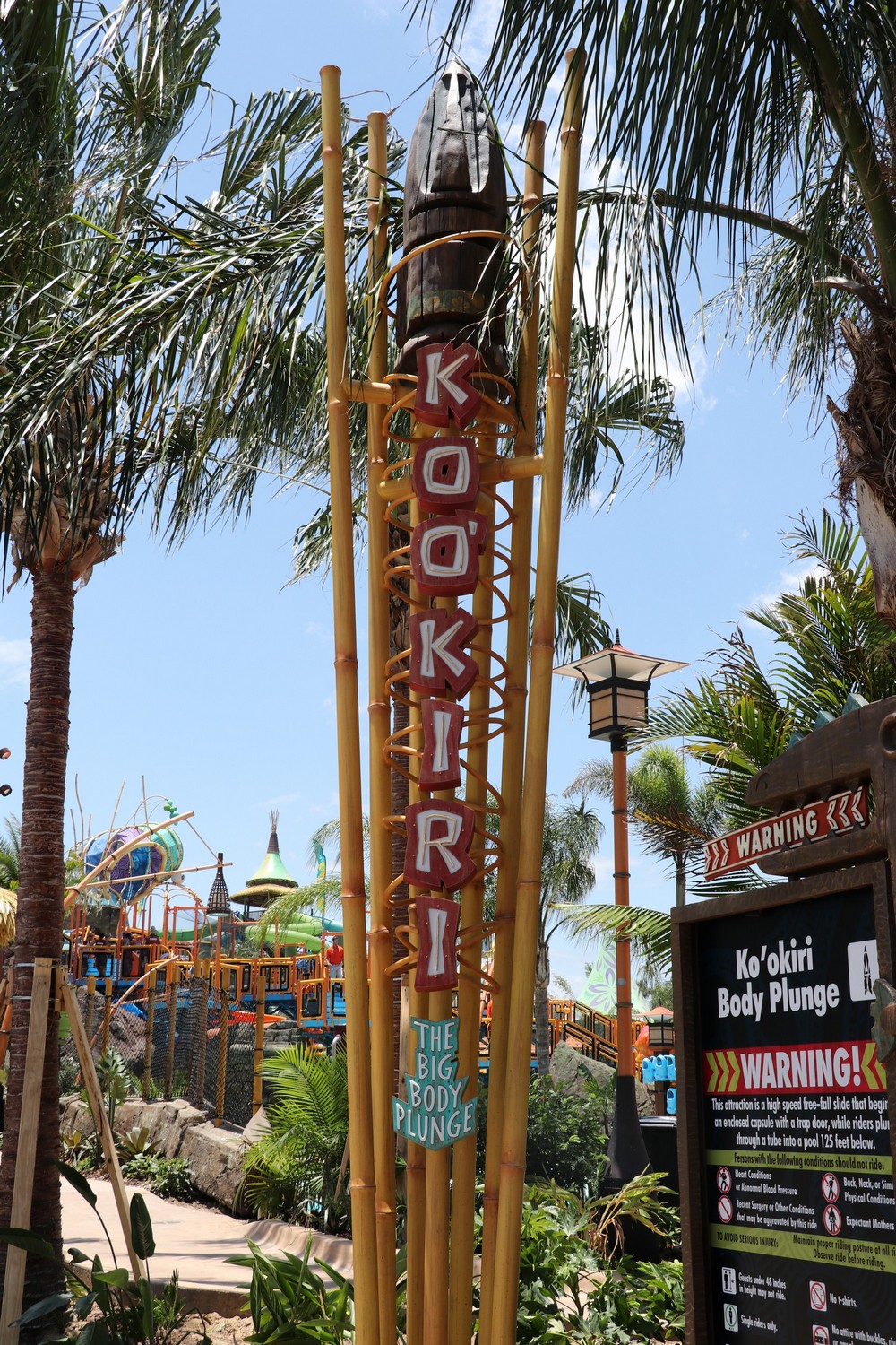 At the top of Volcano are the 3 trap-door body slides. We opted to ride Ko’okiri Body Plunge, the slide that drops you straight down the heart of the volcano and into the pools immediately below. The slide drops guests 125 feet at a 70 degree angle through a clear tube where guests in wadding in Waturi Beach can spectate as you make your descent.