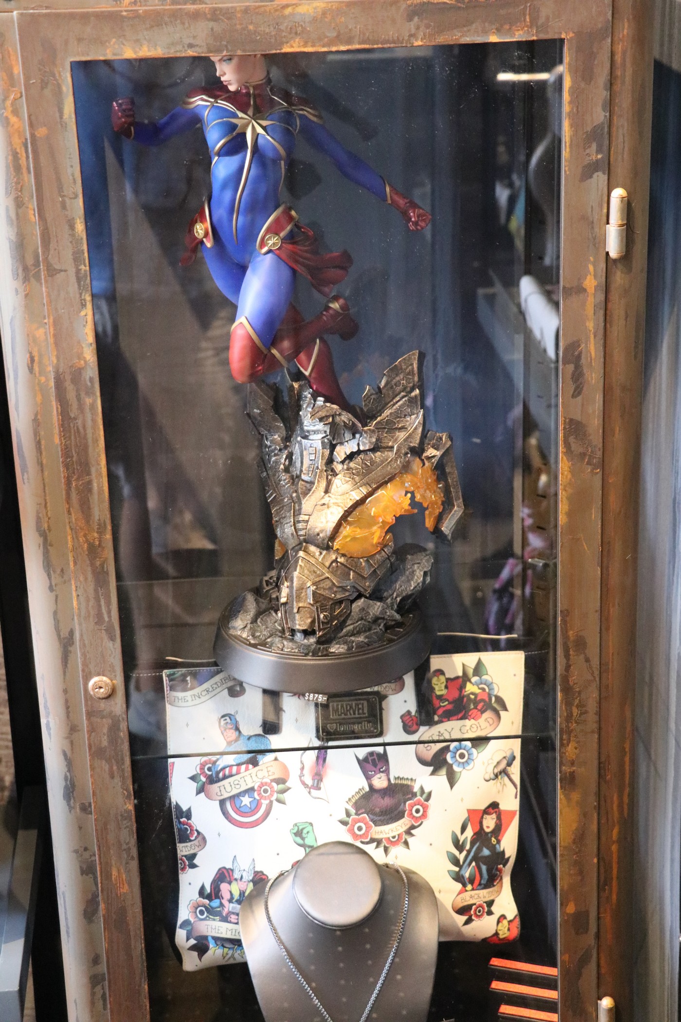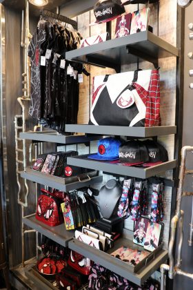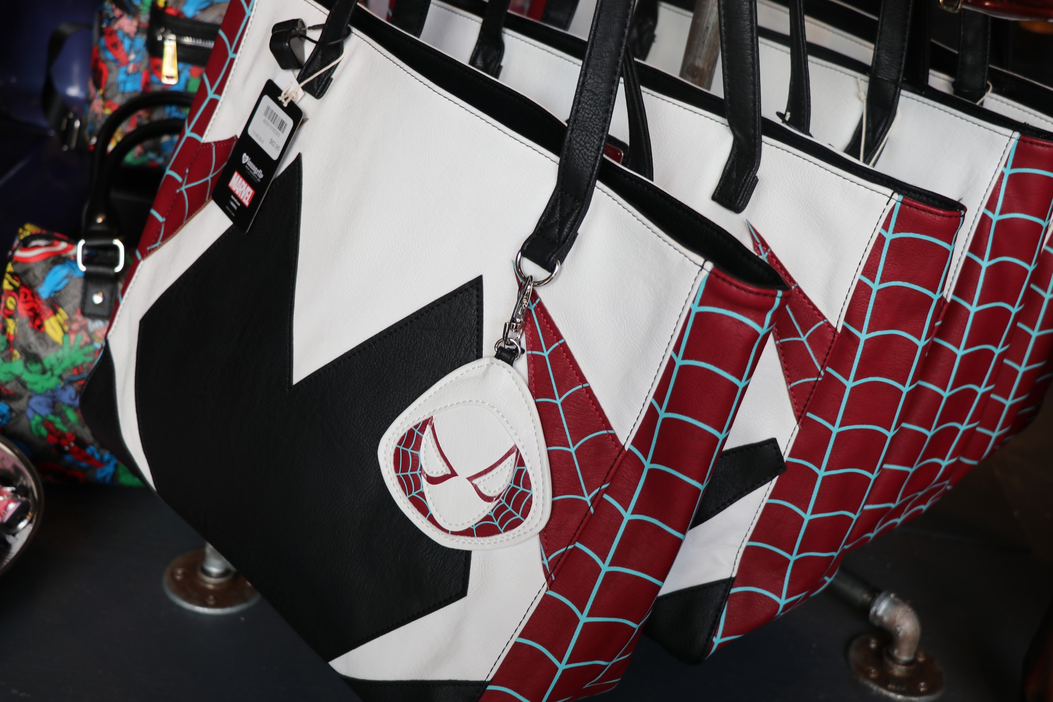 The store features merchandise – such as shirts, purses, and other accessories – based on popular woman heroes, including Captain Marvel, Black Widow, and Spider-Gwen. Merchandise featuring other popular characters – like Deadpool, and the X-Men – are also available.