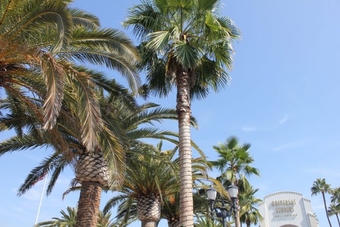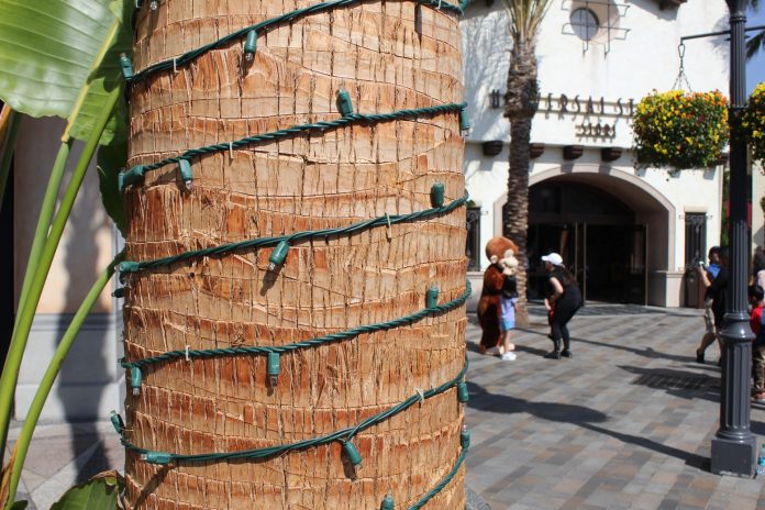 As we posted last week, Universal announced some new offerings in their re-branded holiday offerings – Holidays at Universal Studios Hollywood. Be sure to check out our article detailing the new options, including Christmas in the Wizarding World. Since the event begins November 24, Universal is well underway preparing for the holiday event as lighting has begun to appear on trees near the main entrance as well as on Universal Boulevard.
