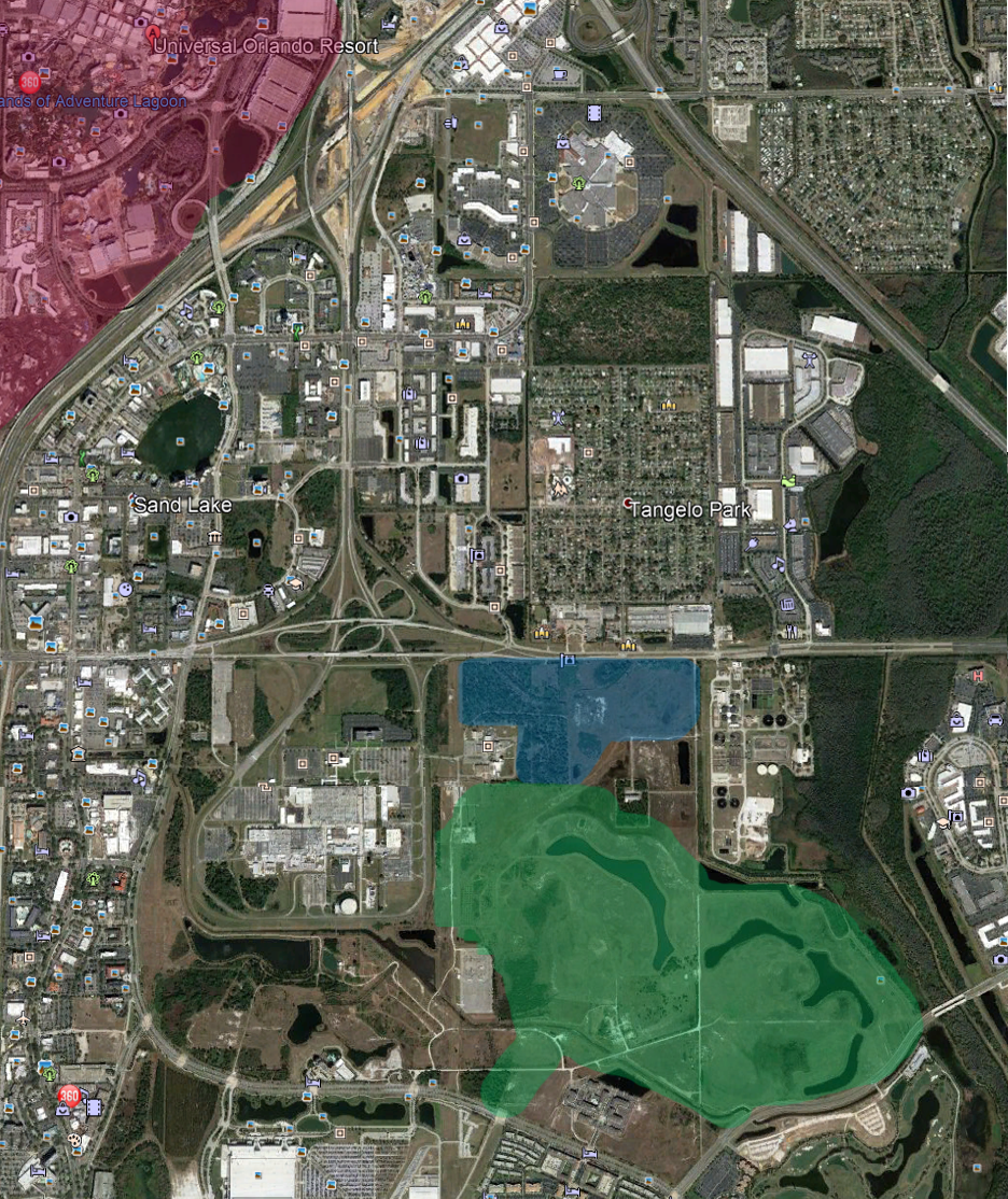 The map below shows what Universal currently owns, and what was recently purchased. The blue shaded area is the new 100 acre purchase; which is located adjacent to the 475 acres that were purchased in 2015 – which is shaded green. The red on the upper right corner is the main Resort; including the three parks, CityWalk, and the hotels.