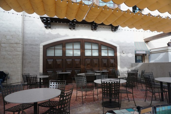 This is where the theater transitions to New York Street. The planters here are temporary.