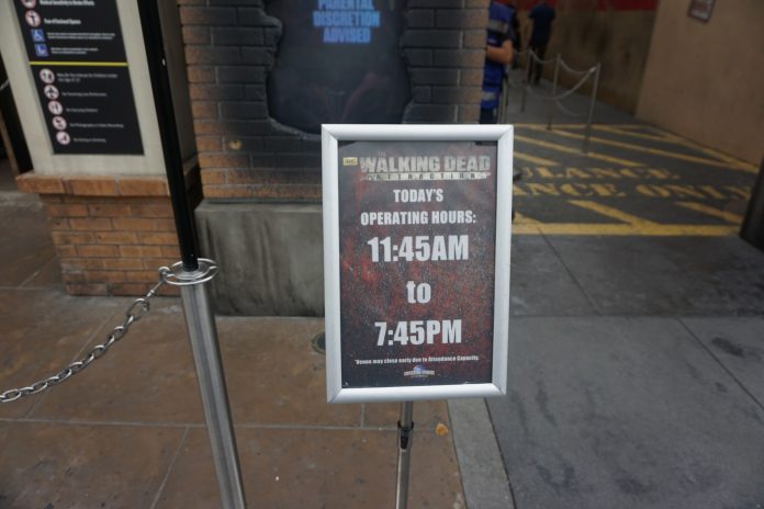 Walking Dead still closes a fair bit before the rest of the park. This day, the park closed at 9PM, so this went down well before then. It rarely has a long line, though, so going whenever you feel bravest is fine.