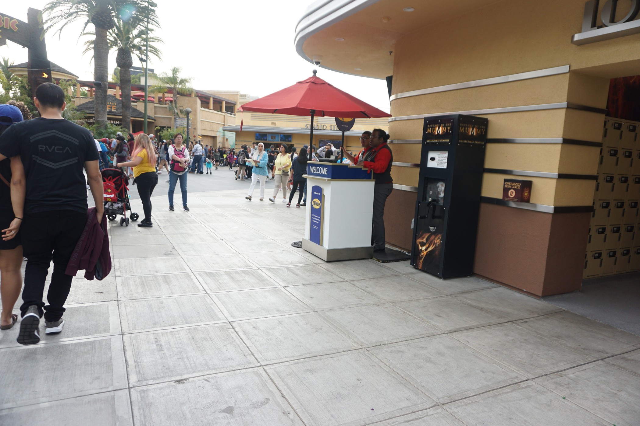 If you need assistance on the lower lot, look for this kiosk near the Mummy lockers. No more podium near the base of the Starway.