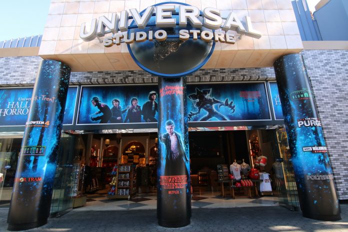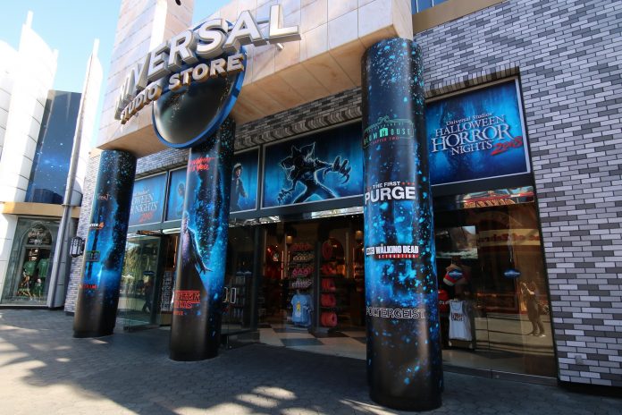 The Universal Studio Store located in Universal CityWalk has removed its previous Jurassic World themed exterior in favor of a Halloween Horror Nights design.