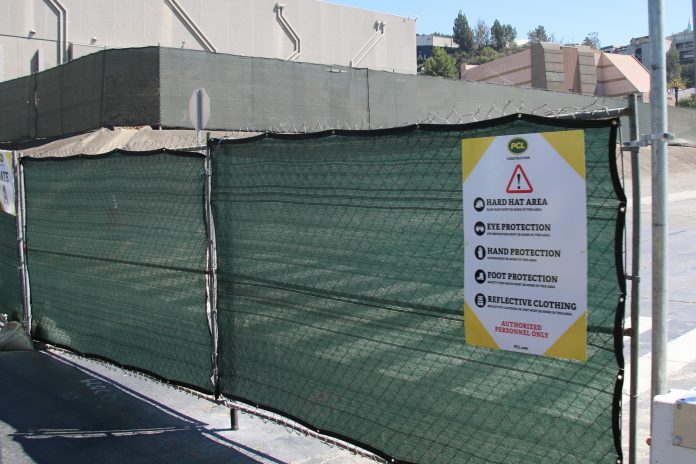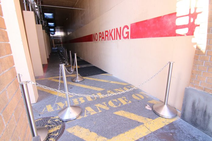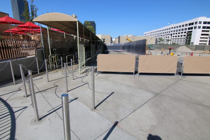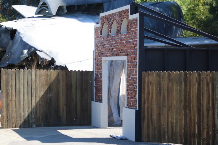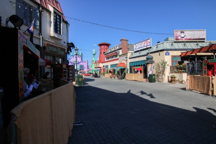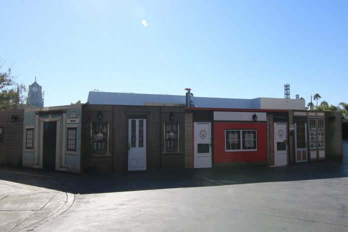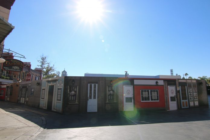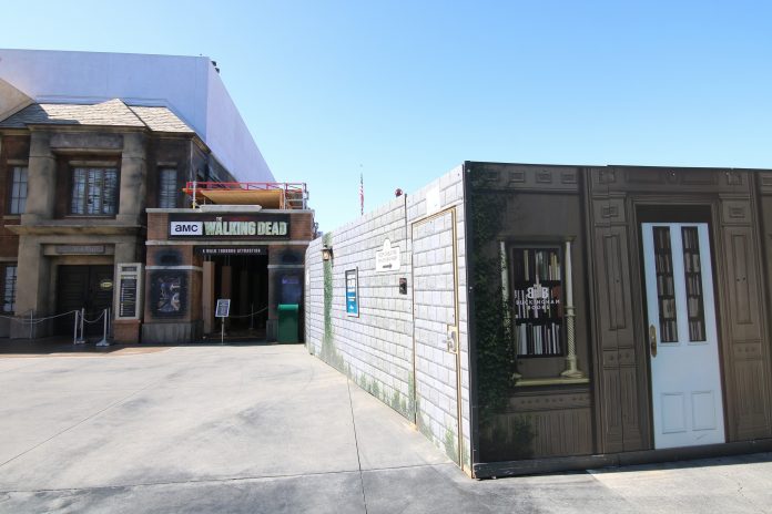 A construction wall matching the original wall engulfing the walkway at the entrance of The Walking Dead Attraction – with the words “no parking” on it – has replaced the previous beige and blank construction wall located there, marking the appearance of an additional theming element in the very much stripped-down exterior queue.