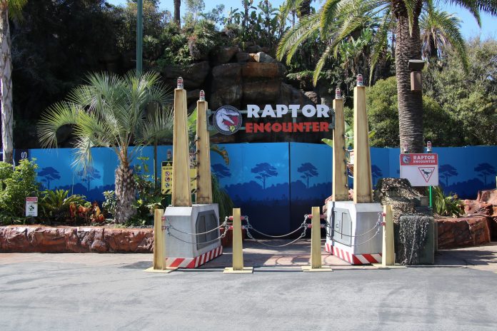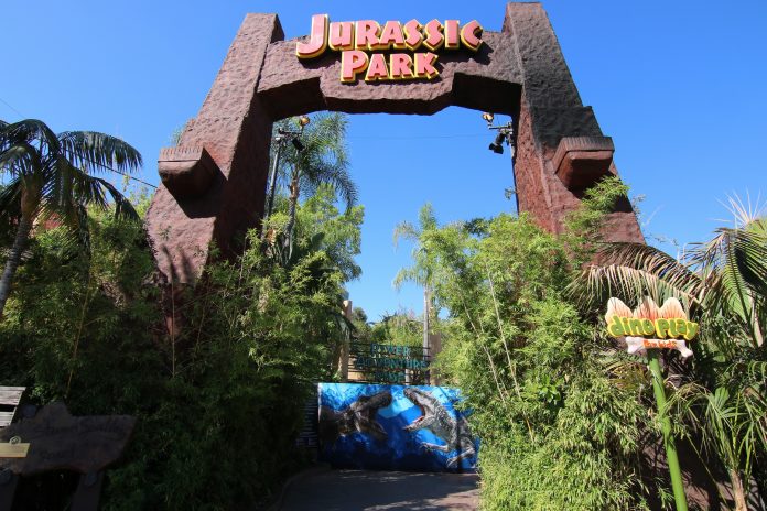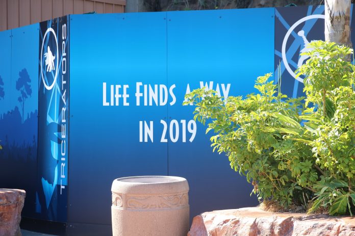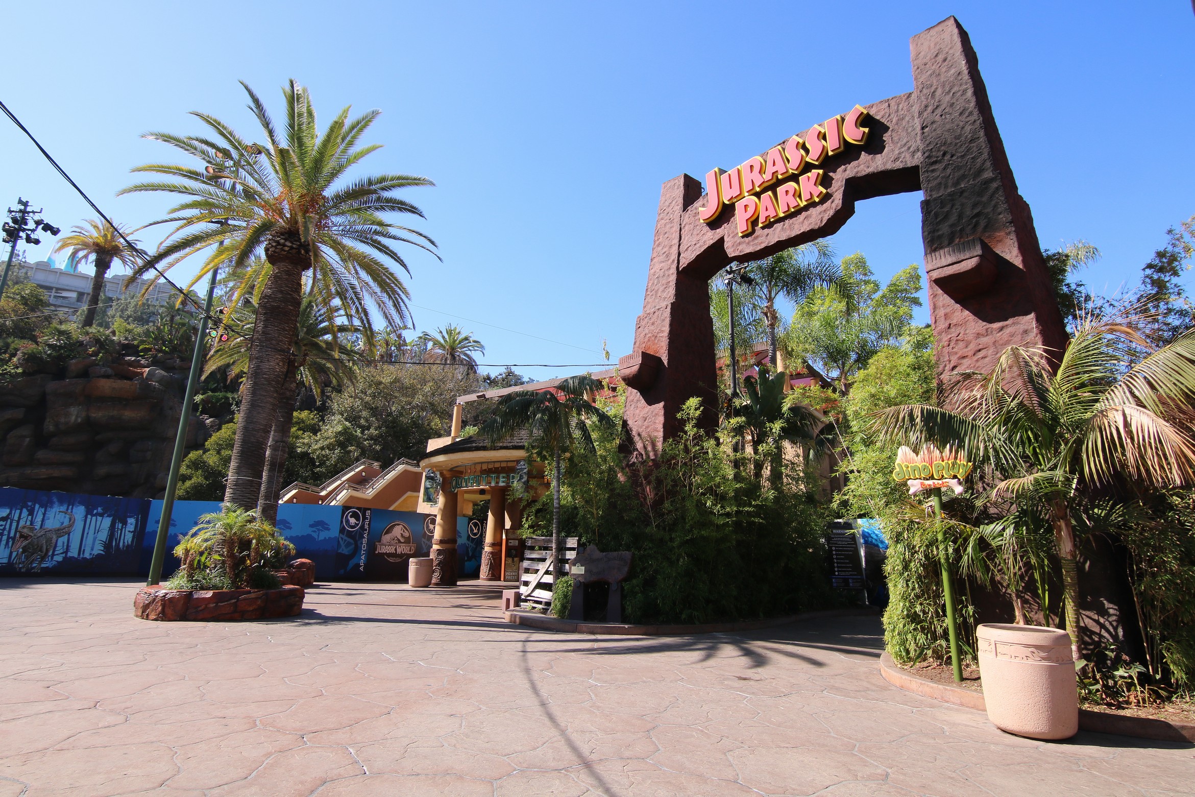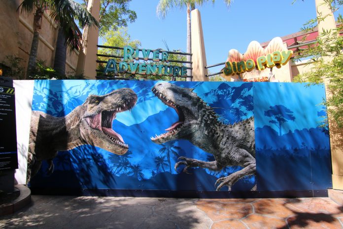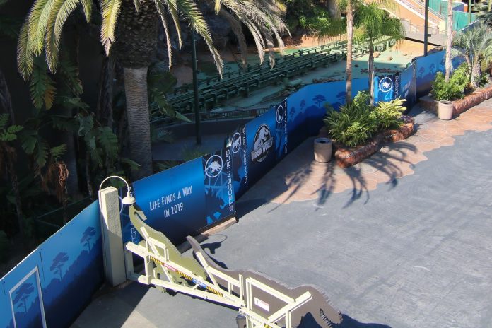 Immediately following the closing day of Jurassic Park: The Ride, blue construction walls themed to Jurassic World have appeared as construction crews quickly begin work on the ride’s 9-month transformation. As a result, the lagoon has been completely drained, and the noise of construction echoes through the air if one ventures close enough to the walls.