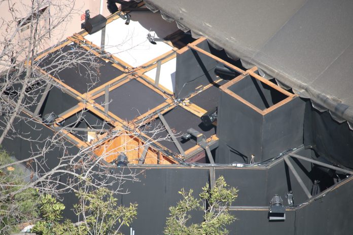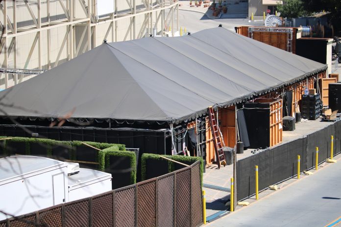 Although the facade remains hidden from public view, signage for the entrance of the Trick r’ Treat maze has gone up just next to the Transformers Supply Vault store, as well as the framing for a banner that will display the mazes located in the Universal backlot. No other visible changes have occurred since our last update from an aerial view of the maze itself.