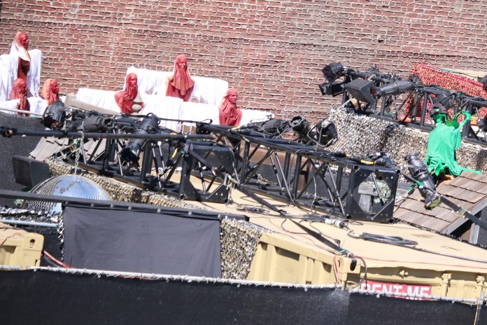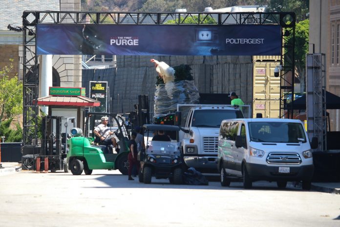 Although we have not managed to get an up-close look at the mazes located in the Metro sets of the Universal backlot, some setup of the Poltergeist and Horrors of Blumhouse: Chapter 2 mazes, the Holidays in Hell scare zone, and other decorations and details for Halloween Horror Nights are visible even from afar.