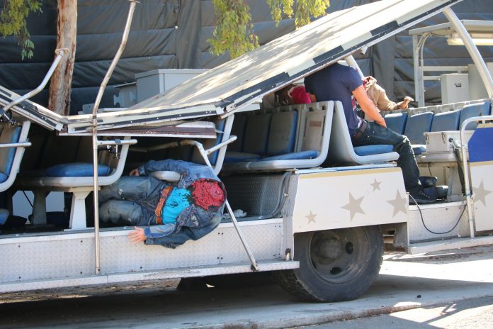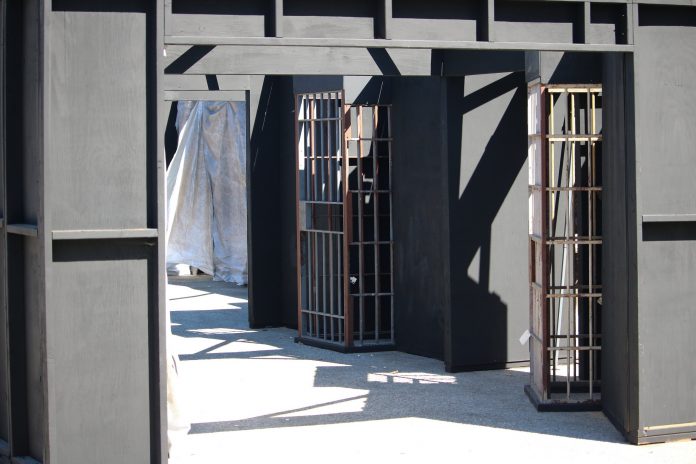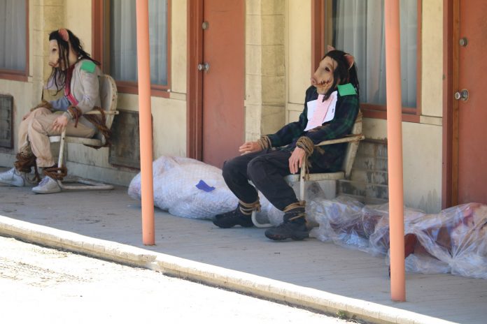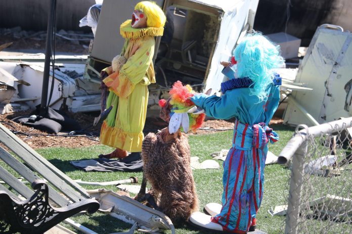 Construction and setup for the Terror Tram featuring Hollywood Harry’s Dreadtime Storiez has significantly progressed since our last update, with decorations and props appearing along the path of the Whoville set, through the Bates Motel, and all the way to the end of the War of the Worlds set.