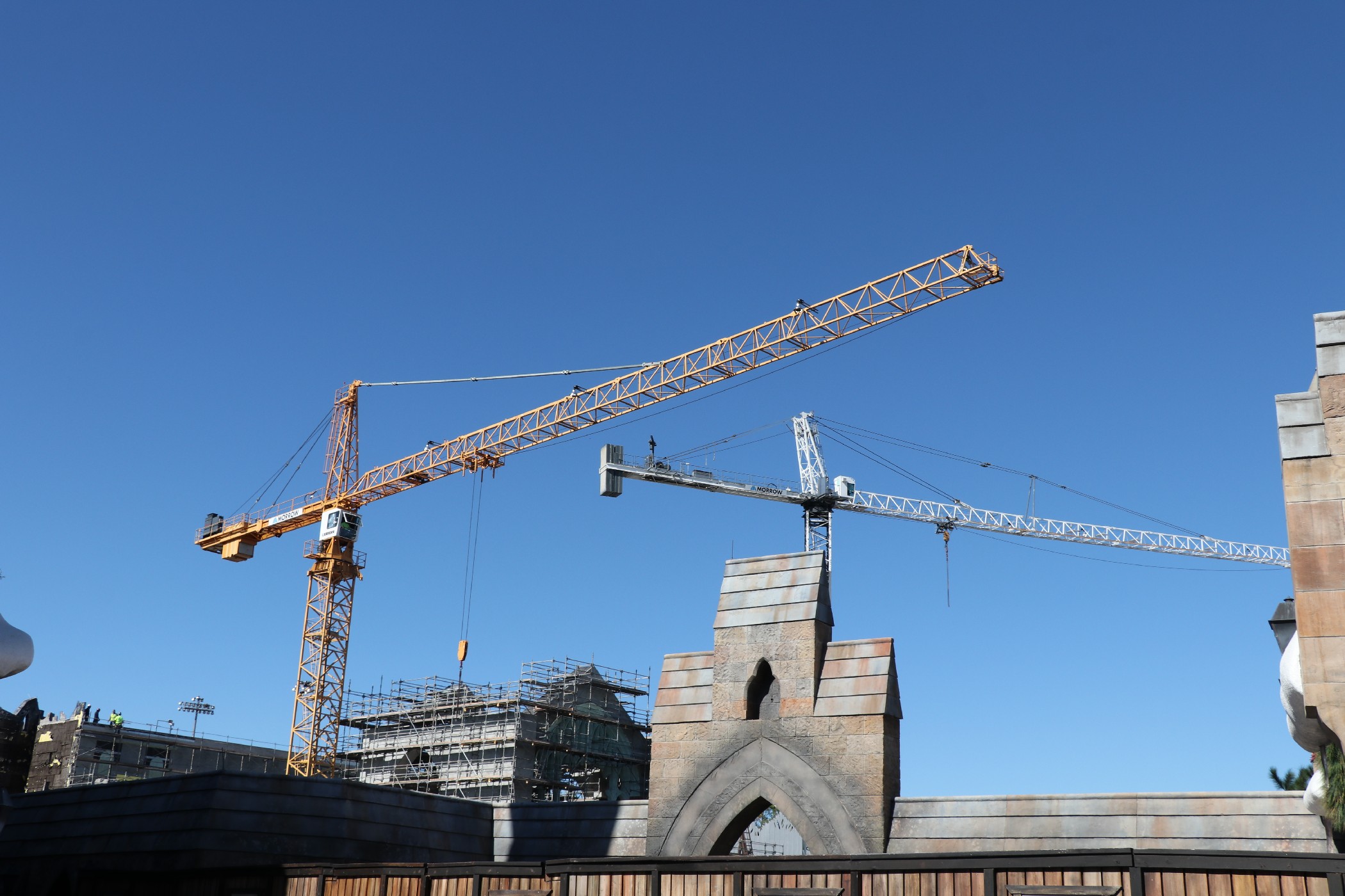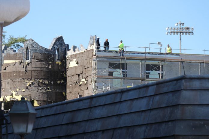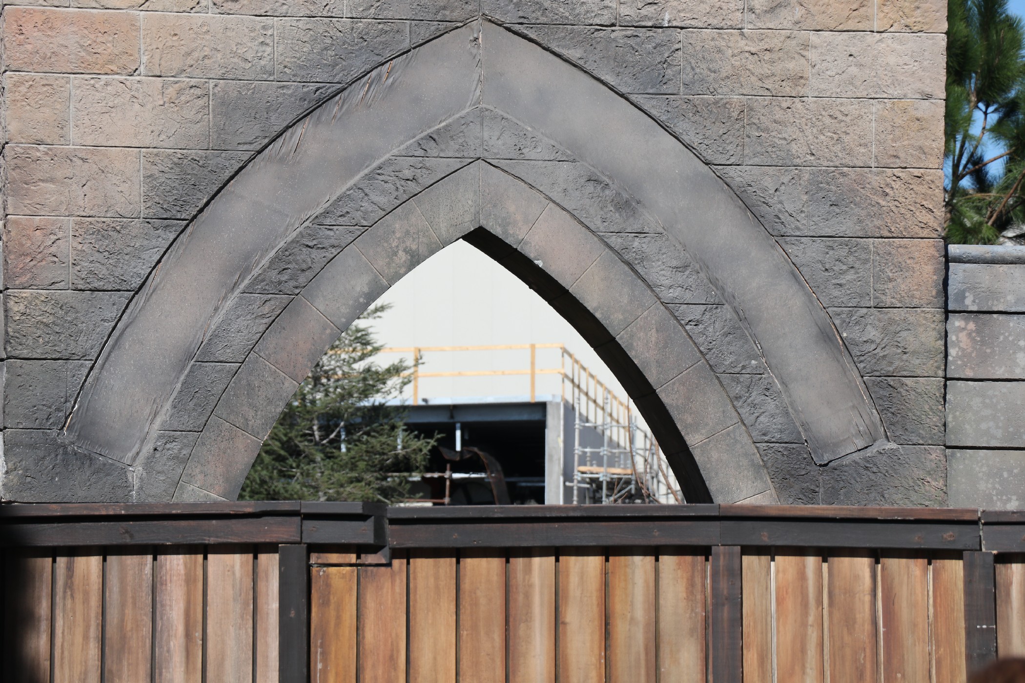 The new attraction is coming along, slowly, but steadily. Most of the construction is blocked off by trees now, so the only bits of progress we can see is the former castle queue, the new abbey, and the hut.