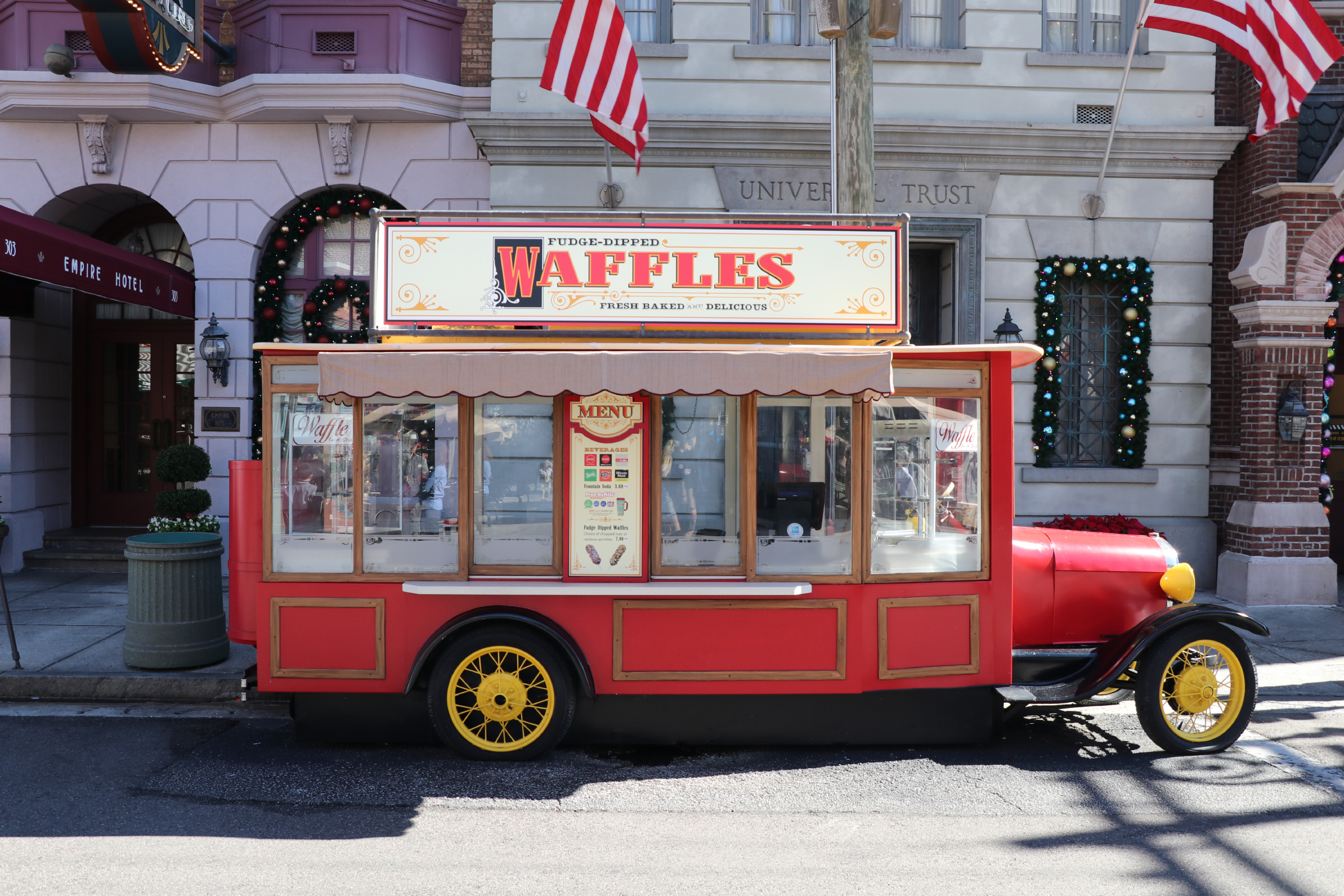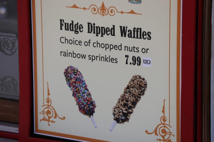 The snack cart in New York has been converted to sell Fudge-Dipped Waffles, the popular treat sold during this year’s Halloween Horror Nights. Before the switch, the cart sold snacks and craft beer.