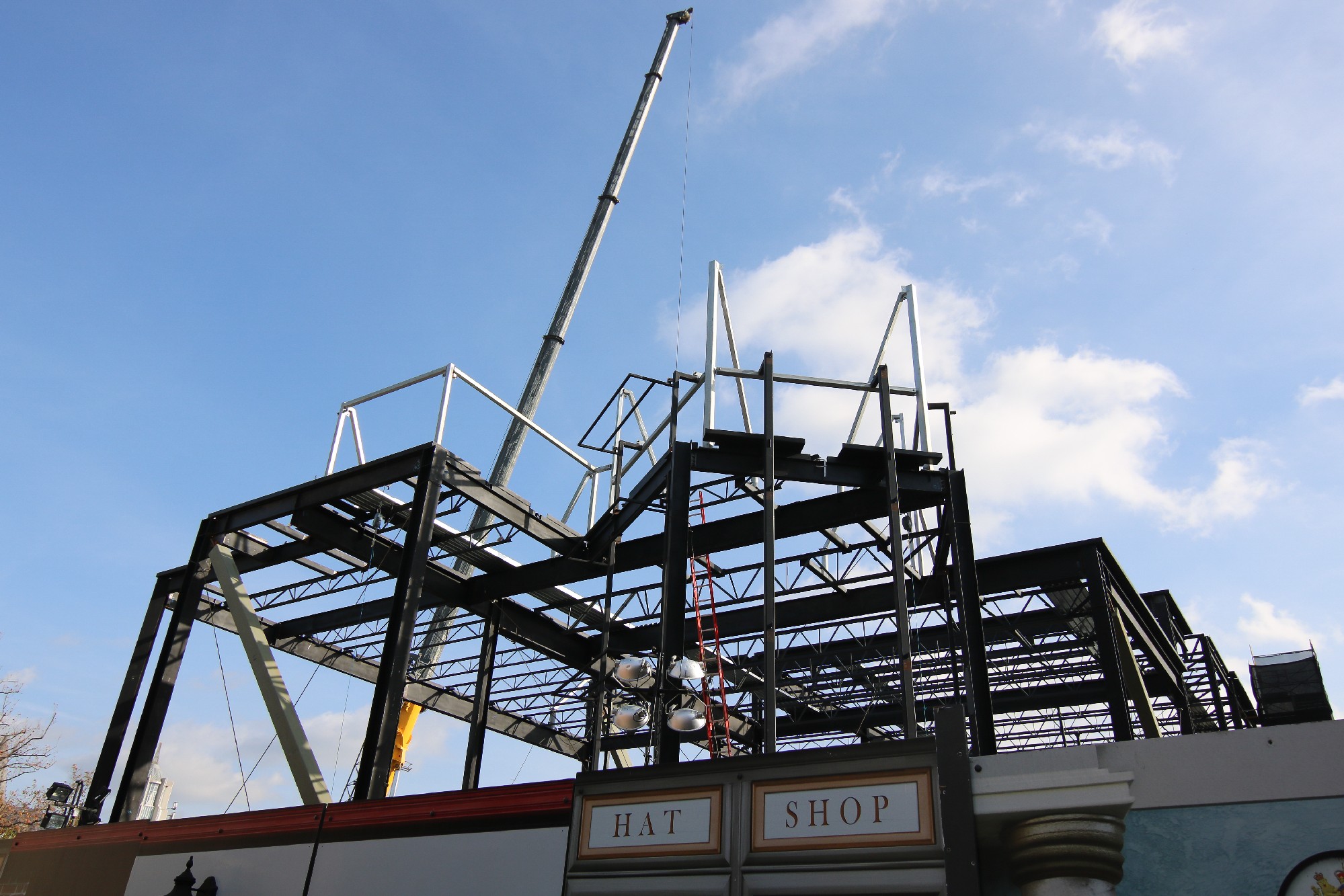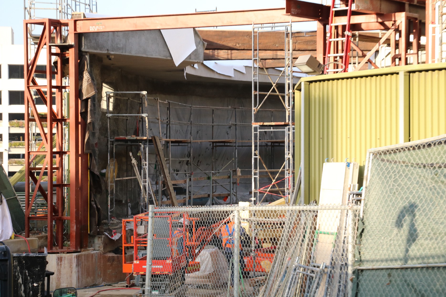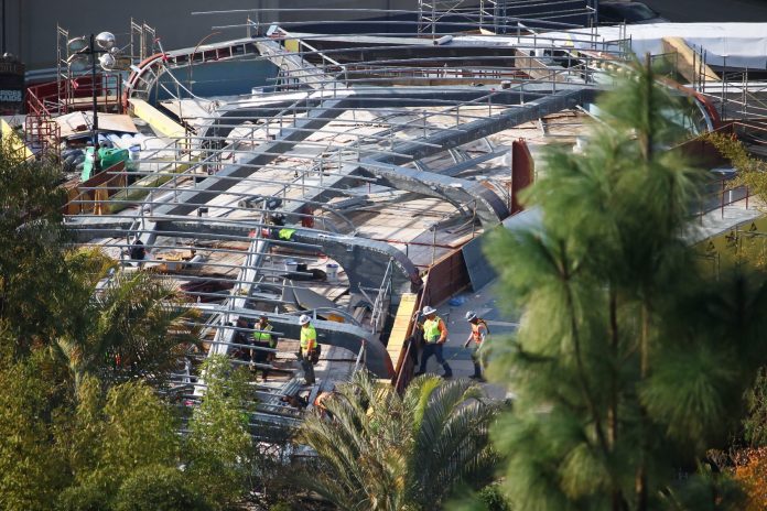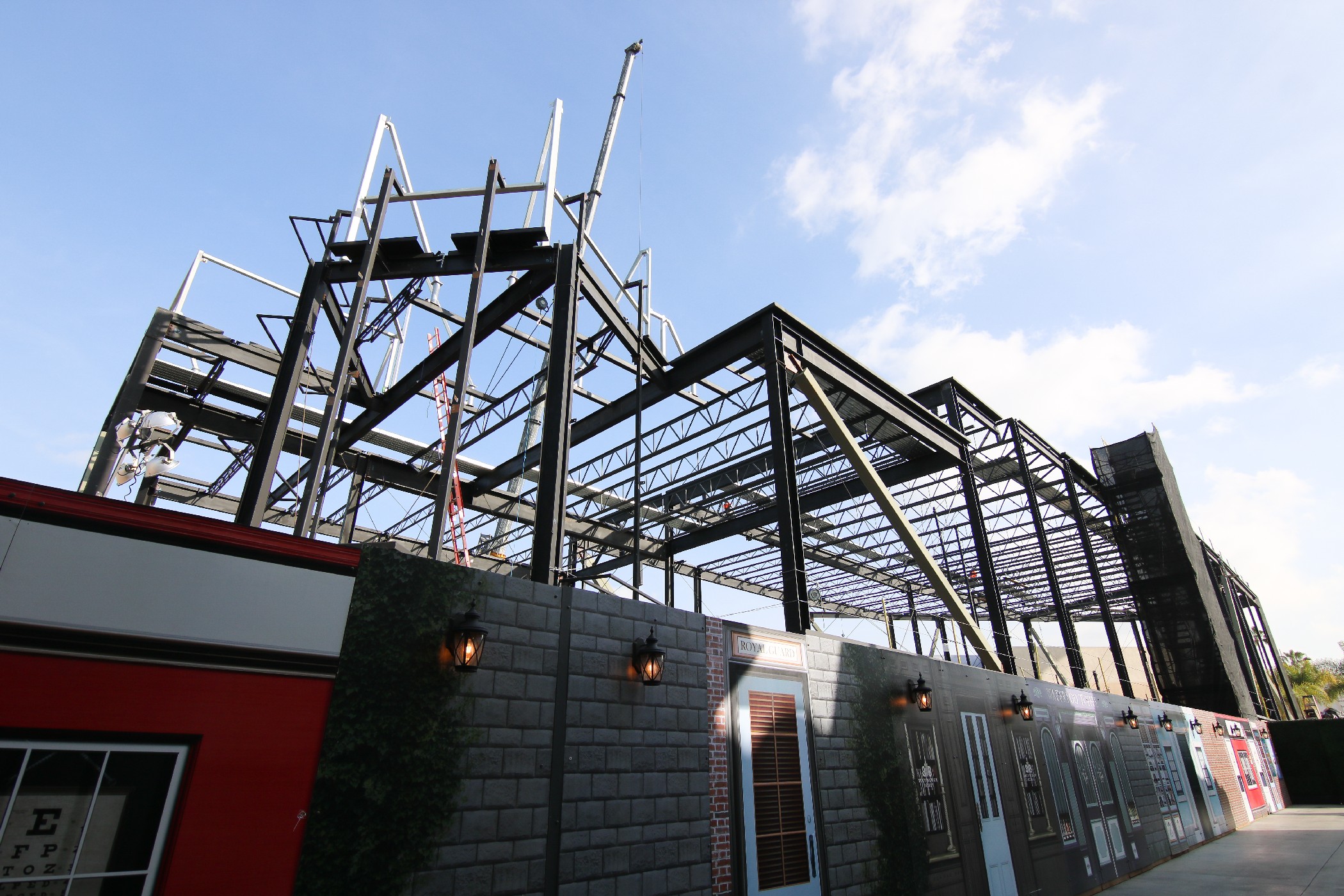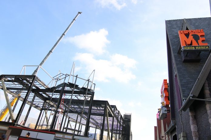 Construction is rapidly progressing on the unannounced attraction being built on the former plot of the Globe Theater. Much structural work has been completed since our most recent update, allowing guests and fans alike to spot the outline of a show building.