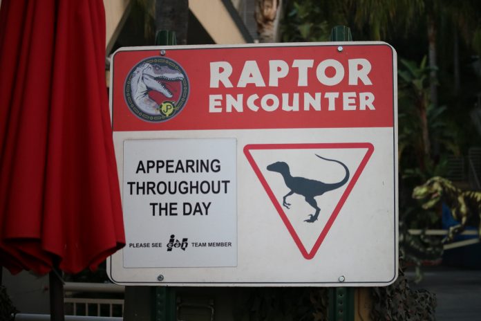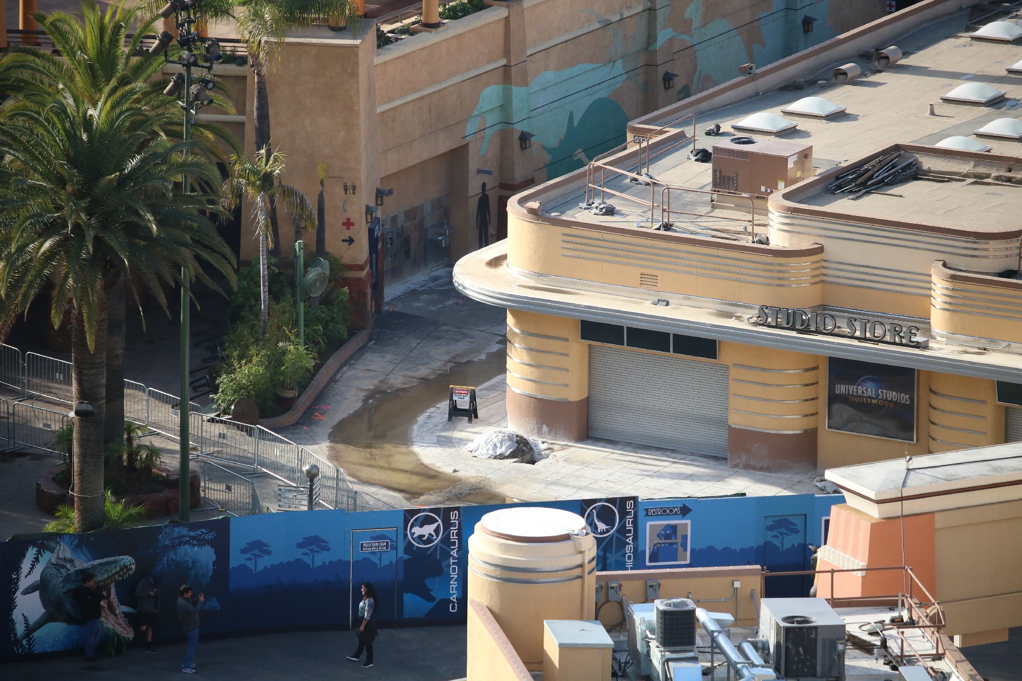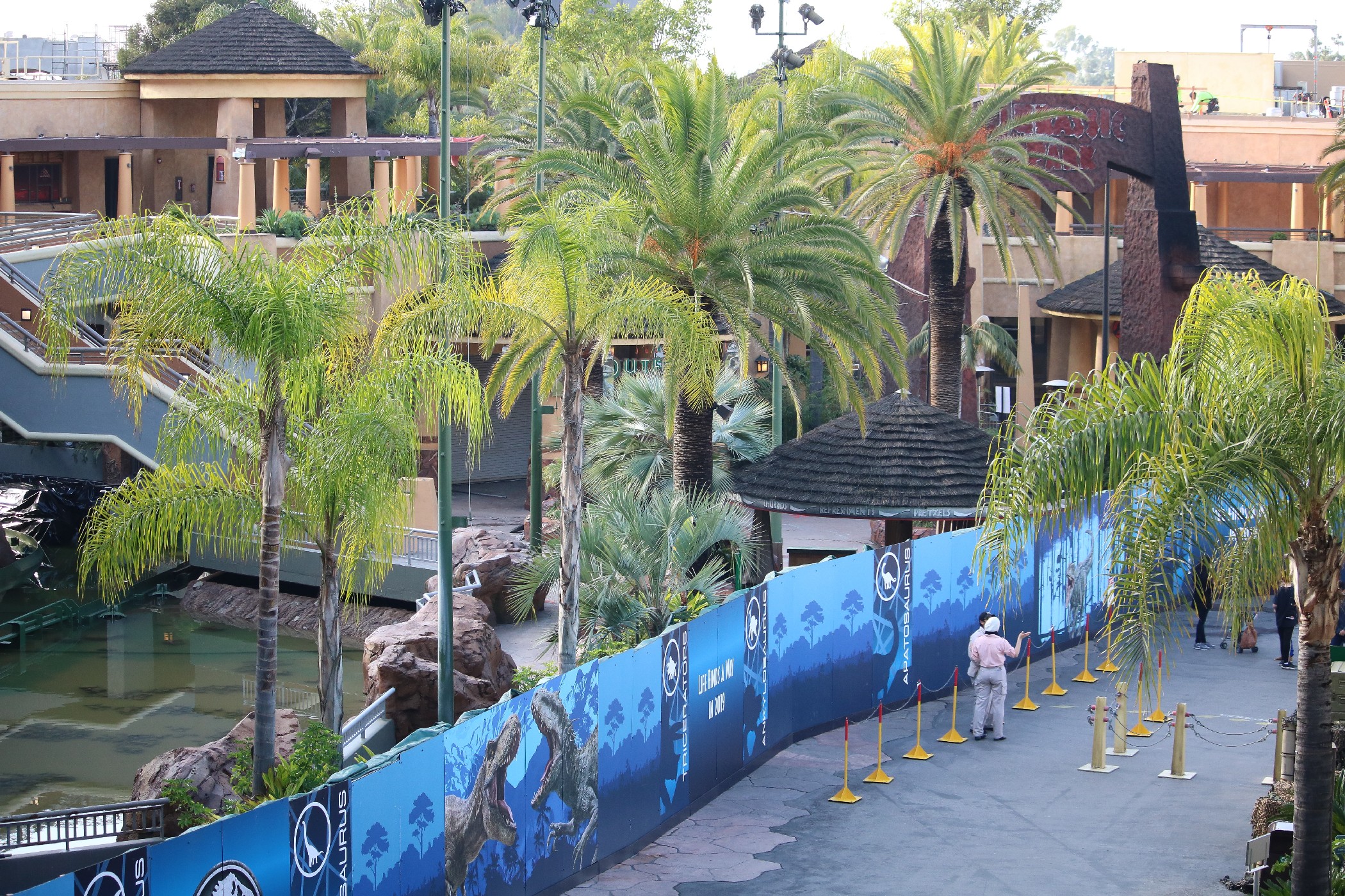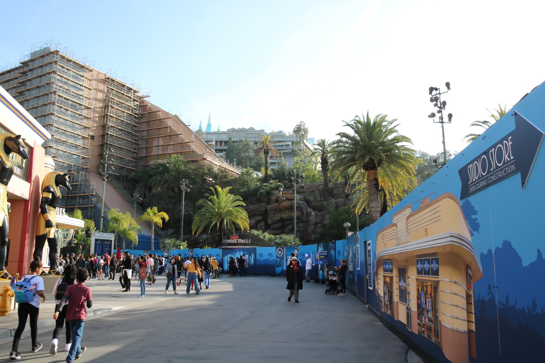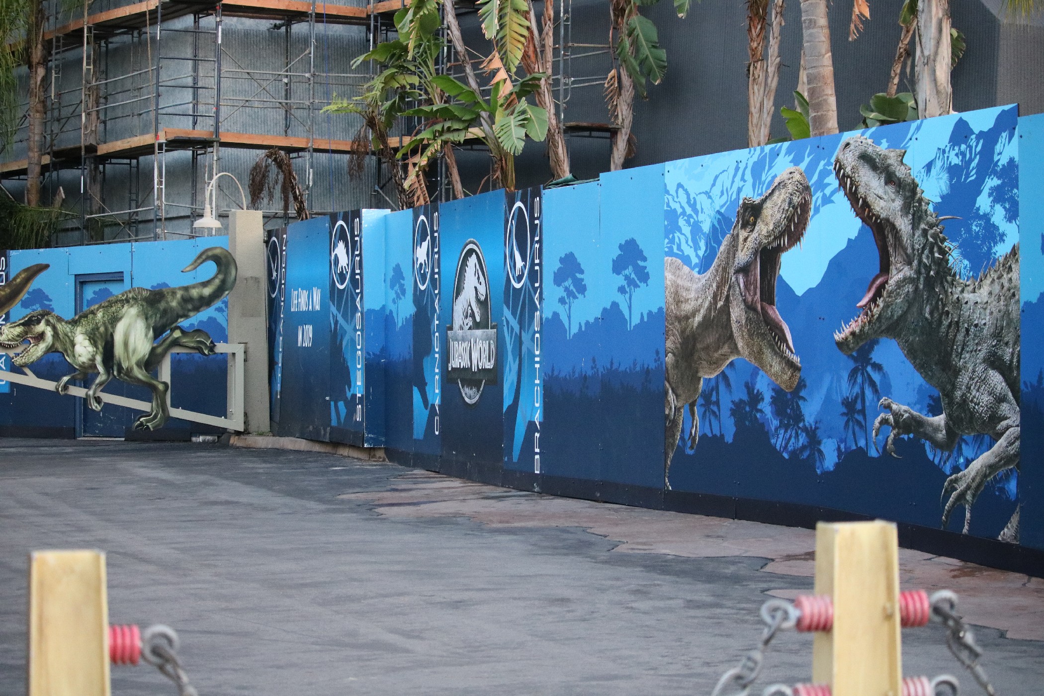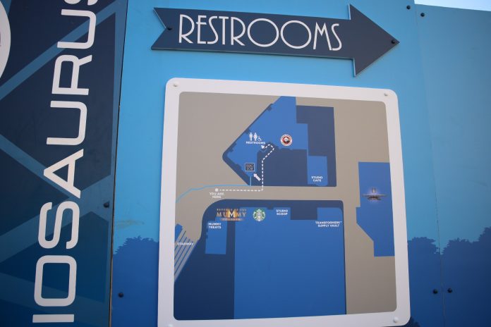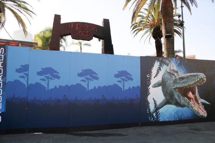 Satisfying the trend of construction progress throughout the park, the transformation of Jurassic Park: The Ride and its surrounding area into Jurassic World is moving at an accelerated pace, with the most significant visible change being the input of walls blocking off the entire Jurassic Park area, as well as the main entrance to the Studio Store and the restrooms, from guest access. As a result, Jurassic Outfitters, Jurassic Café, and Jurassic Falls have been closed, though the Studio Store still remains open through a side entrance to the building, and the Raptor Encounter is still available, though with a slightly different setup. To help guests with the modified layout of the Lower Lot, maps describing the location of everything have also appeared on the themed construction walls.