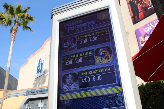 A new digital sign has appeared at the Transformers photo-op location, continuing Universal’s conversion to digital wait time boards.