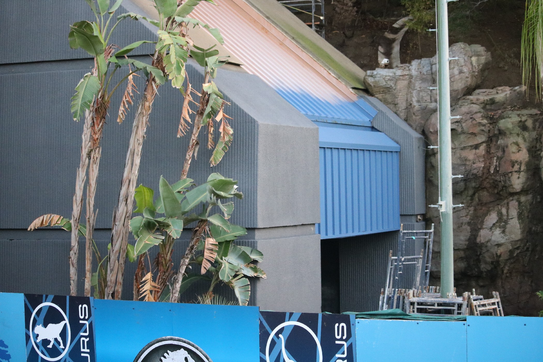 The grey paint job that has recently appeared on the main show building of the former ride is now being applied to the rest of the Jurassic-themed area as well, matching the cool, sleek aesthetic of the Jurassic World franchise. In addition, a portion of the show building covering the ride’s final drop is also receiving a new paint color, donning a Jurassic World blue that pops out to the eyes.