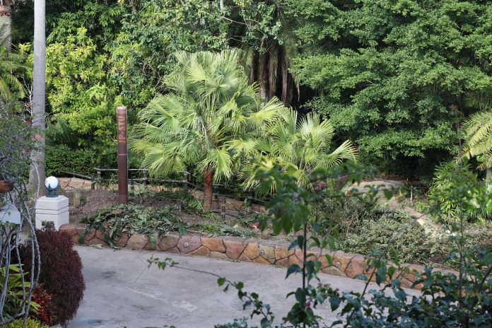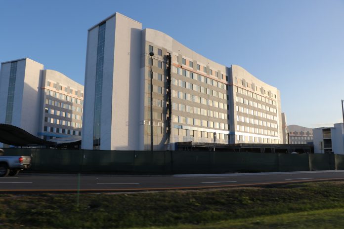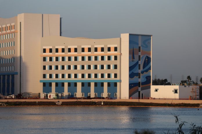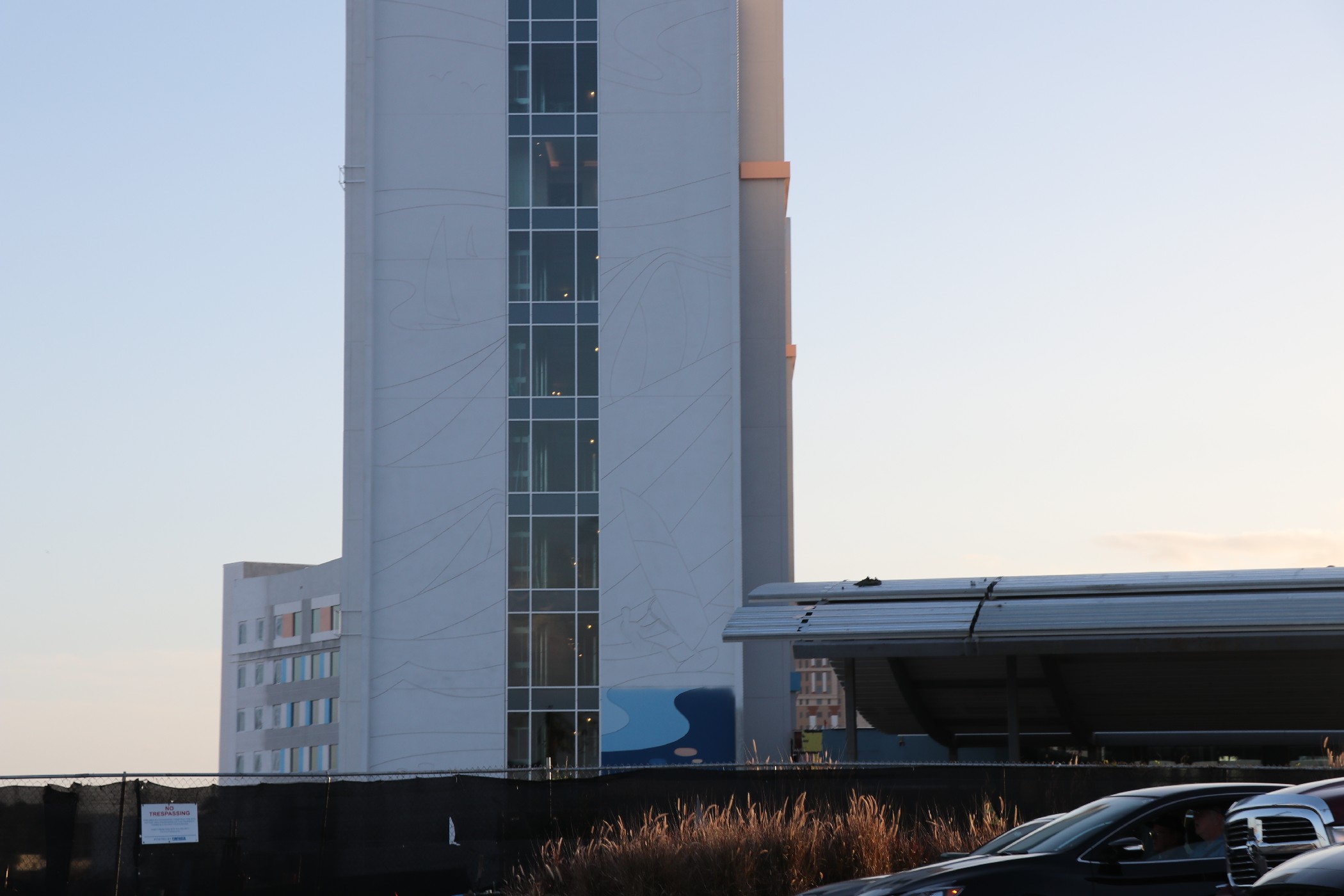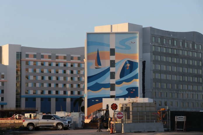 Painting continues on the Surfside Inn side, with one of the murals located at the end of each building being completed this week. The main entrance overhang also continues to be worked on. In addition, works and landscaping have begun around the pool area. A new concept art banner has been hung up around the construction fences showing what the entrance should look like when completed.