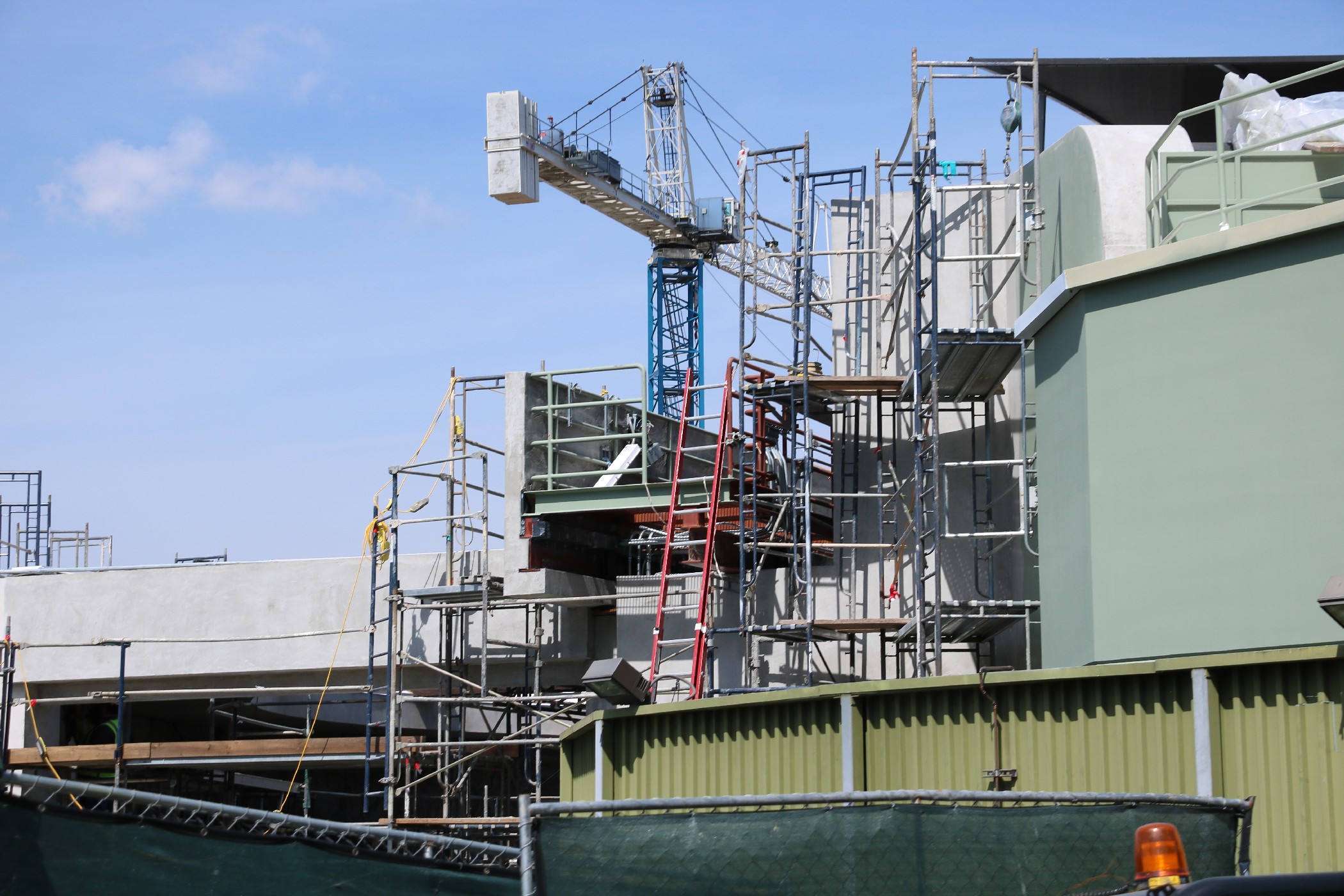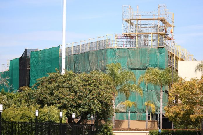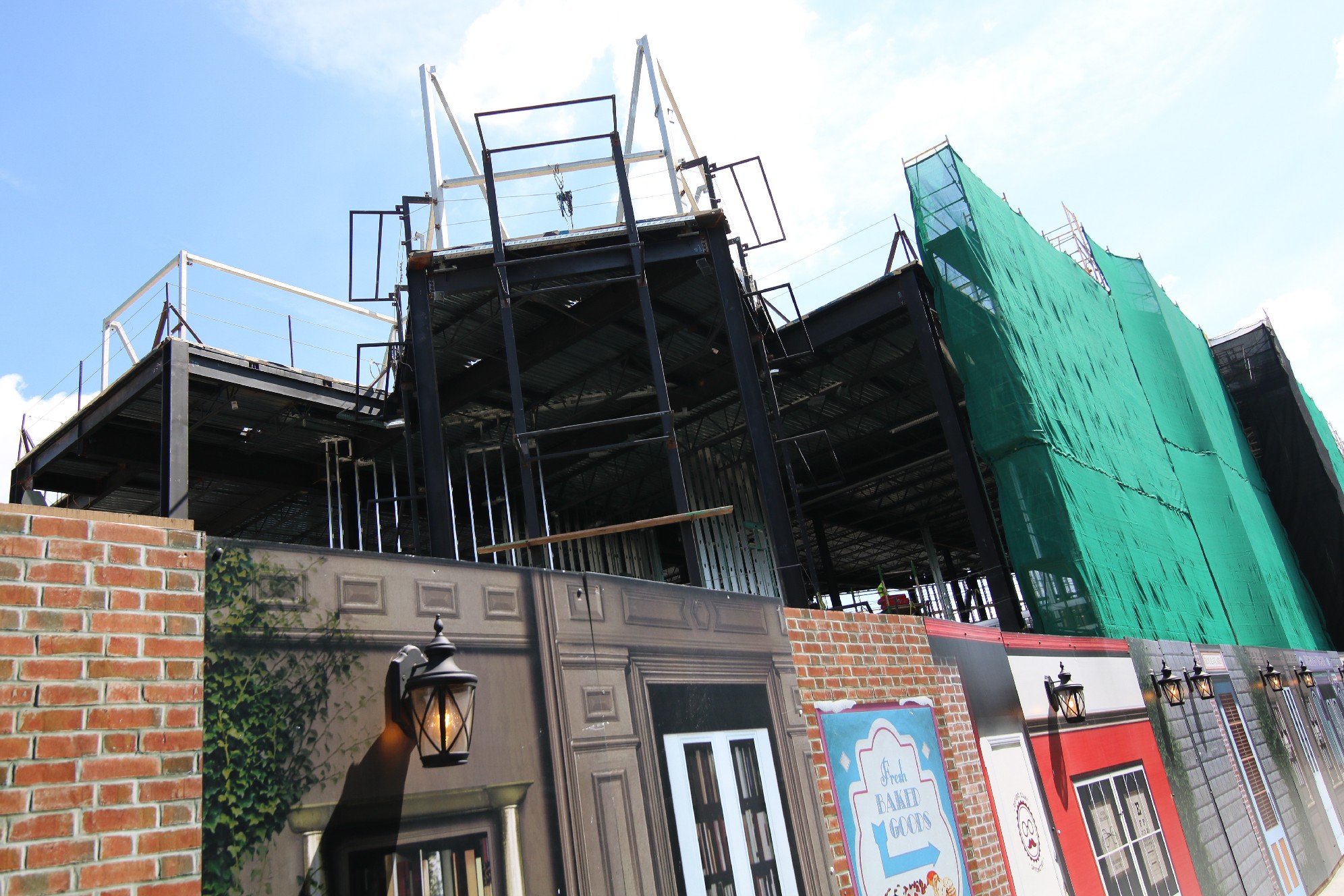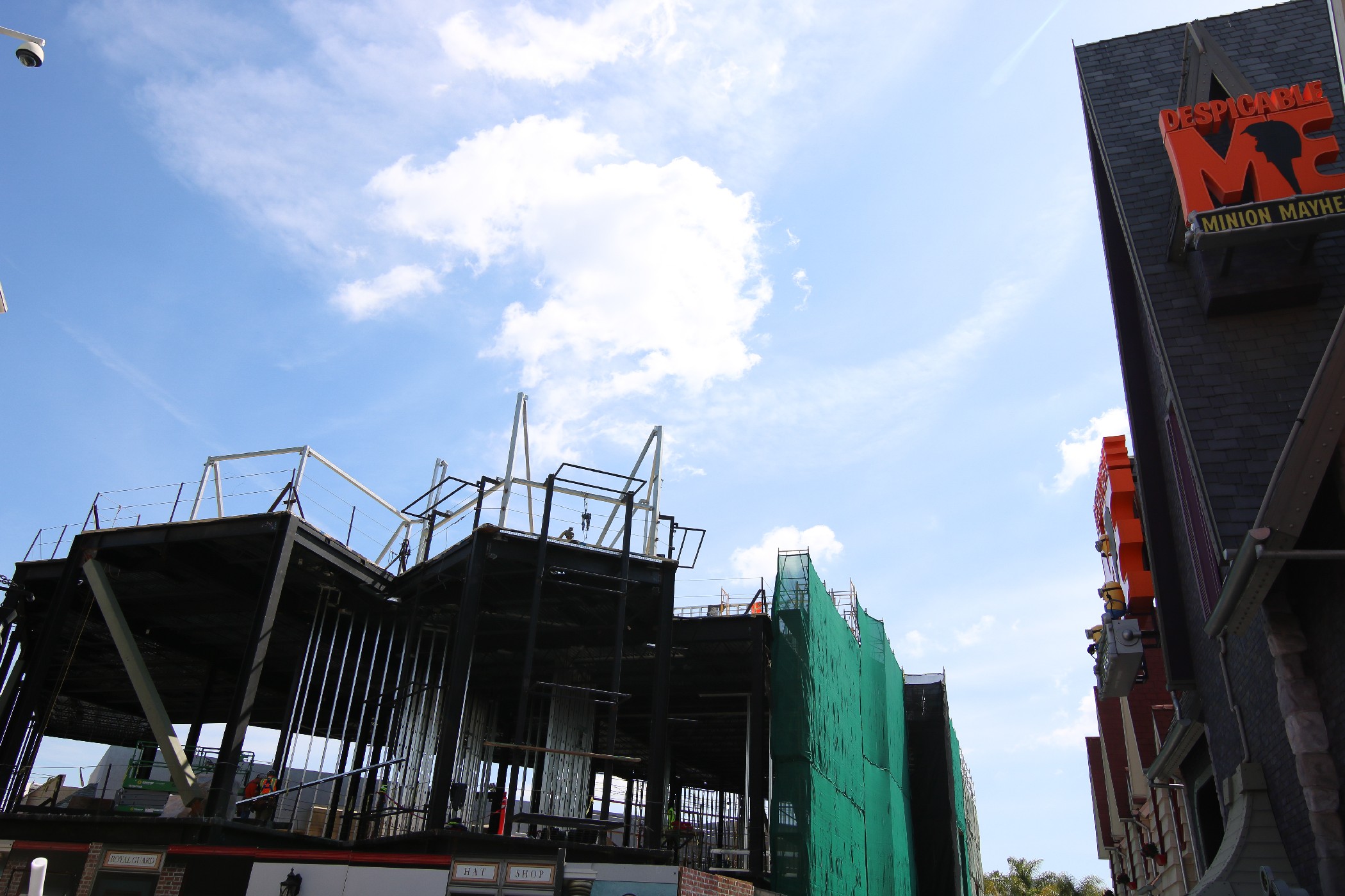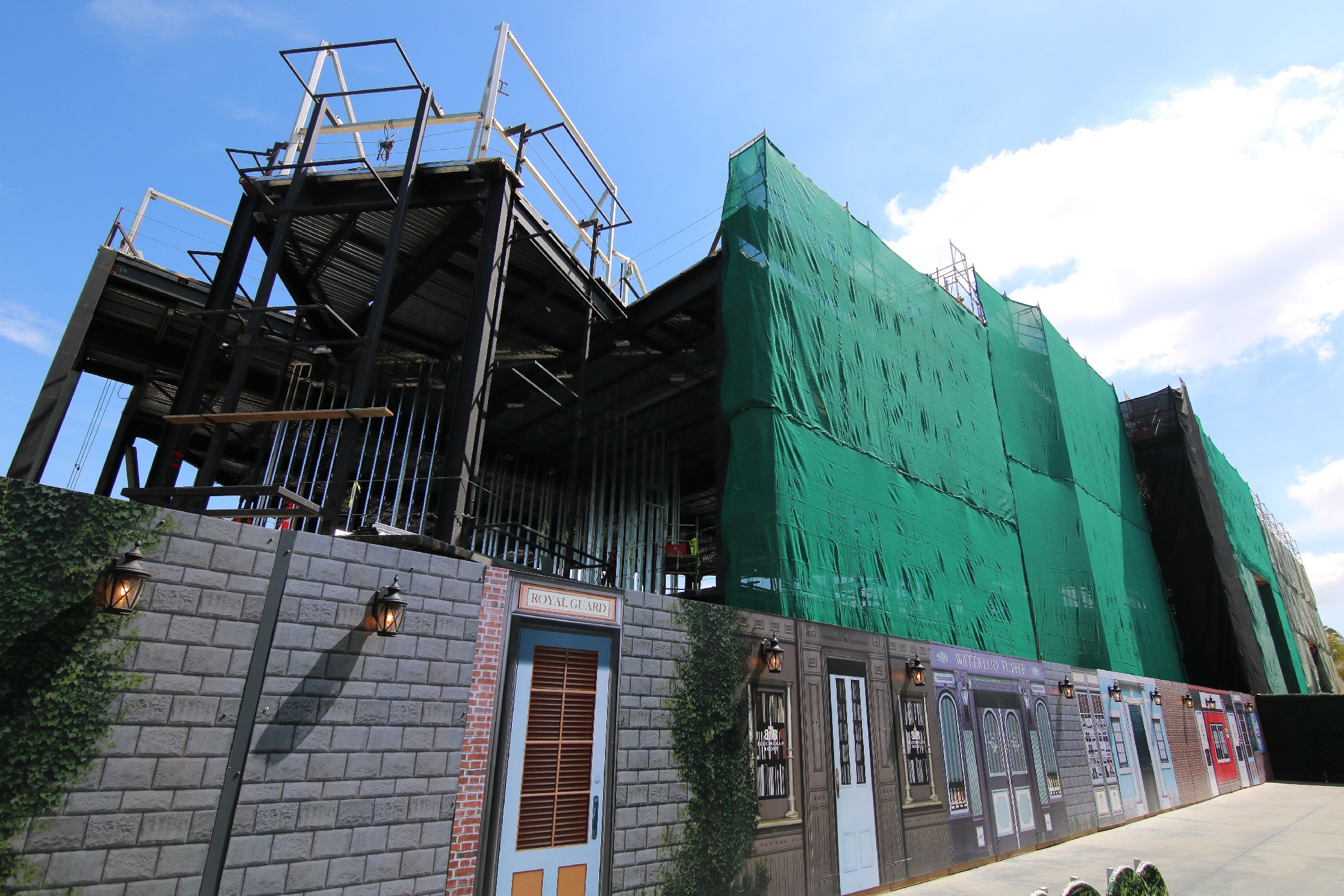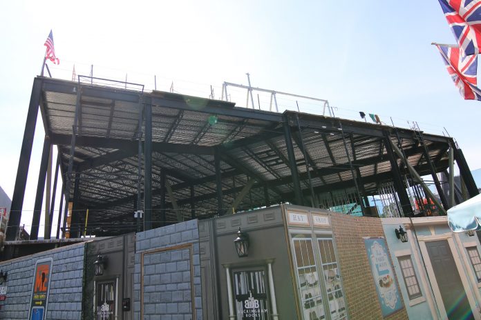 Much progress has occurred on the show building being built on the former plot of the Globe Theatre and half of Baker Street. Beams continue to go up as roofing also is installed across much of the oddly-shaped building. Still, the attraction that the show building belongs to remains unannounced to the public.