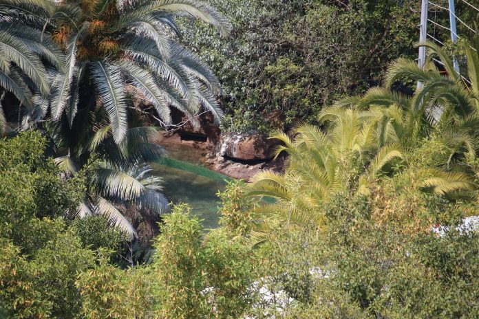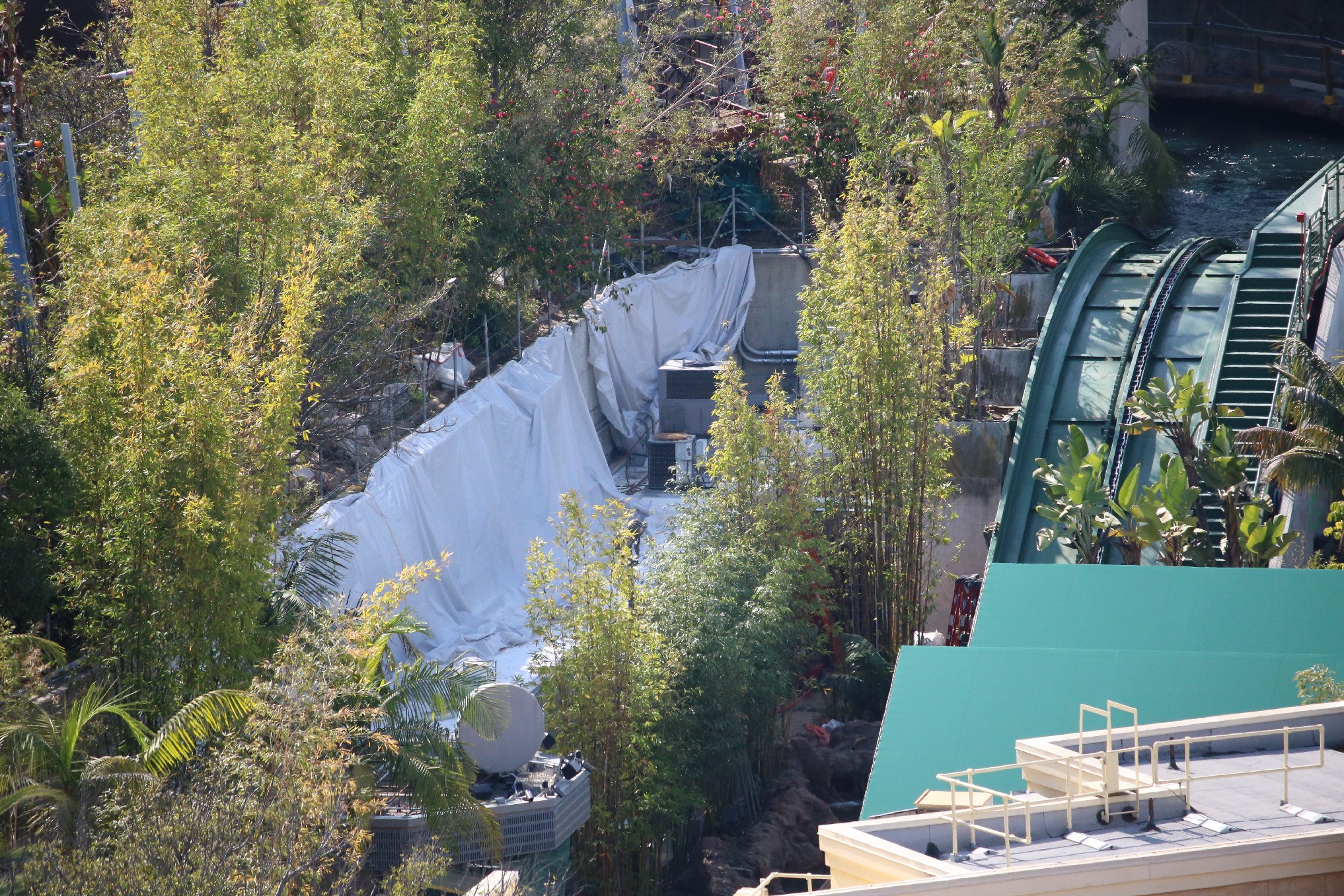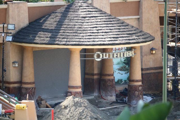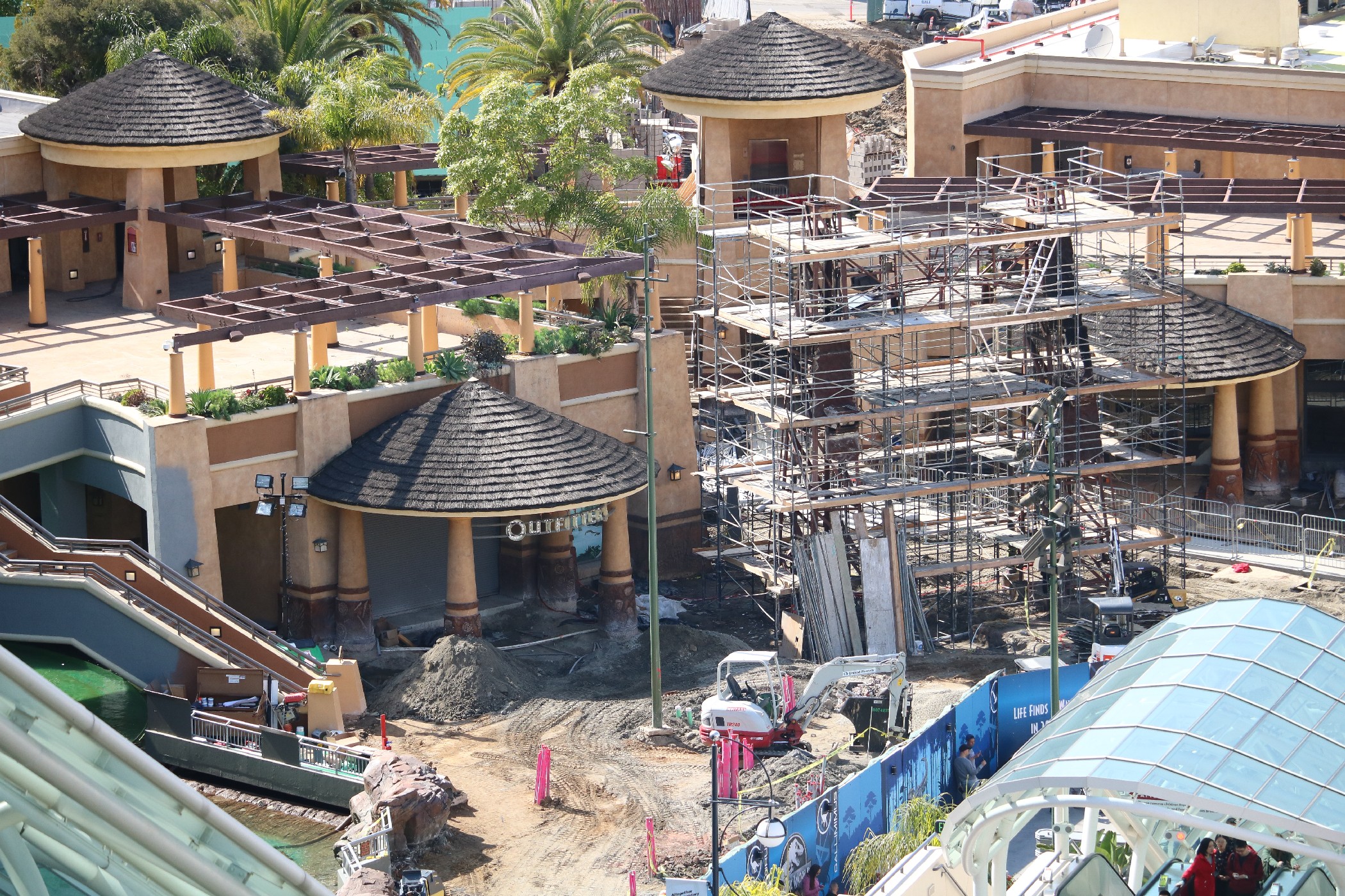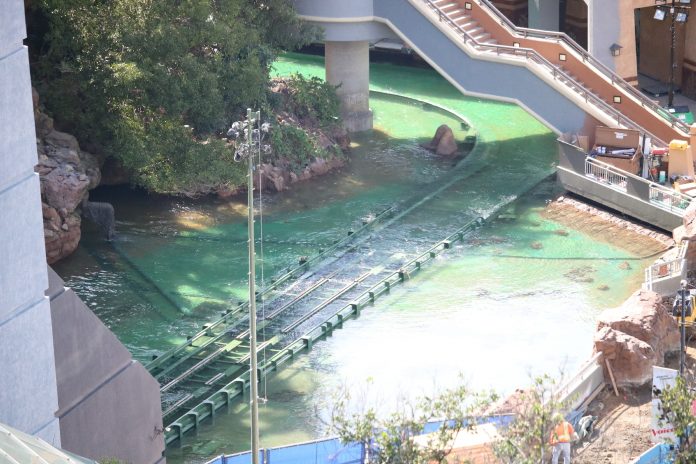 Water now runs through the entire length of the attraction visible from public view as rumors of test runs have arisen among fans and followers of the project. Work continues inside of the show building located just at the top of the initial lift hill as well as along the entire route of the ride. In addition, the Jurassic-themed area surrounding the attraction entrance is currently undergoing much work as a grey paint scheme gradually continues to dominate the previous browns and tans. The massive mural on the side of the main show building featuring the franchise’s widely-recognized icon – the t-rex – appears to have been completed. Still, perhaps one of the more substantial changes since our last update is the removal of the majority of the iconic arch marking the entrance to the attraction, leaving nothing but its framing behind.