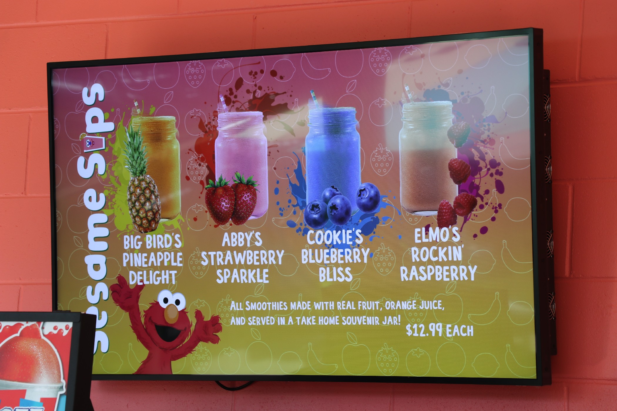 Sesame Street’s themed snacks include the obvious Cookie Monster’s Chocolate Chippy, which are giant blue cookies with white chocolate chips, and fruit smoothies, which are different flavored smoothies that tie to different Sesame characters and are made with real fruit.