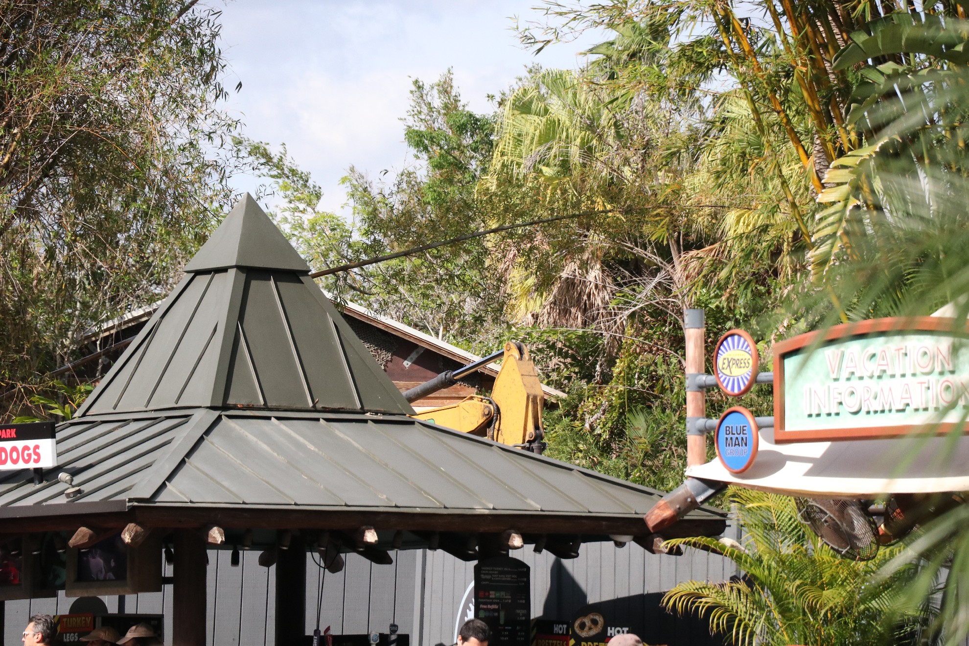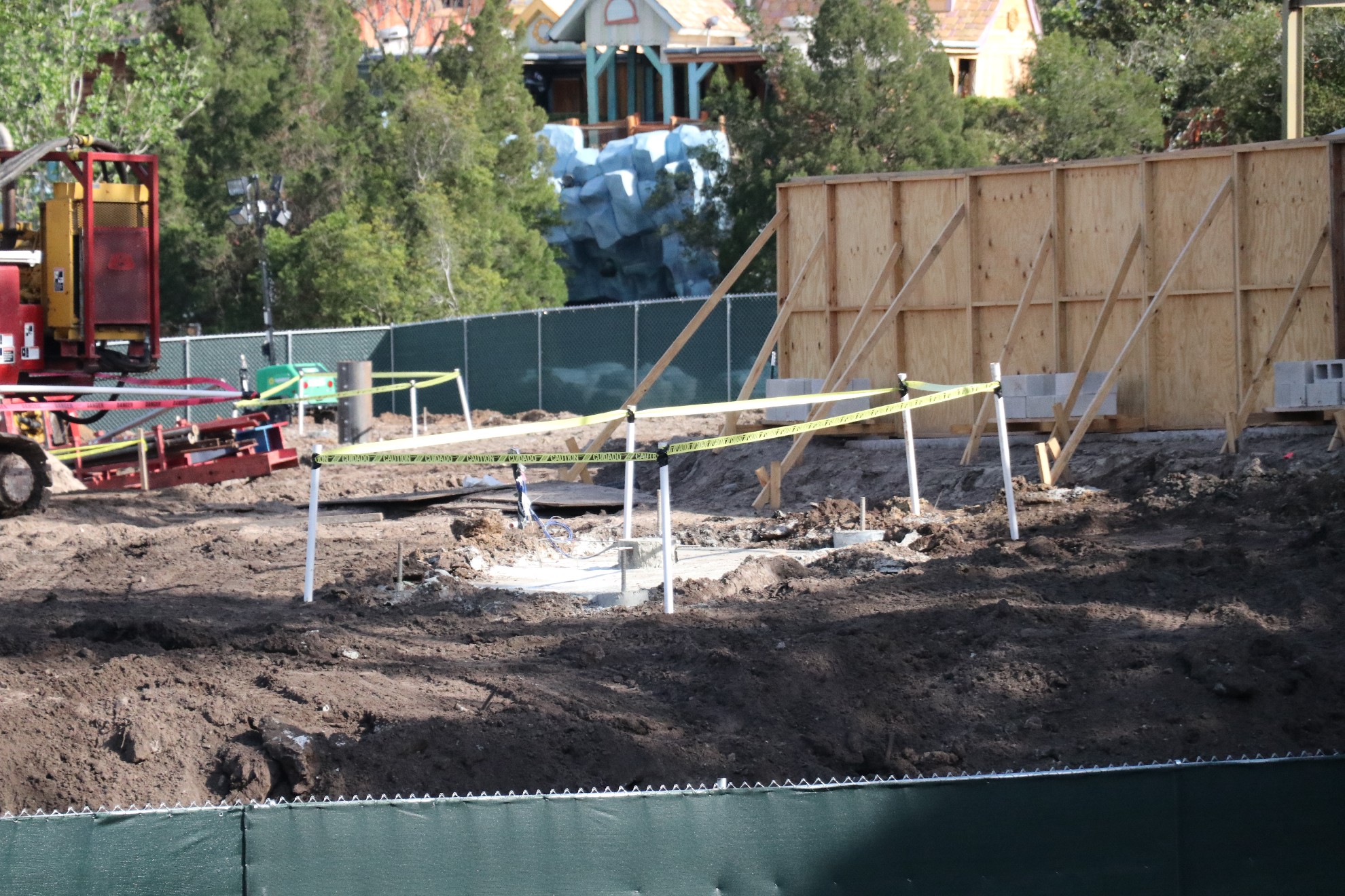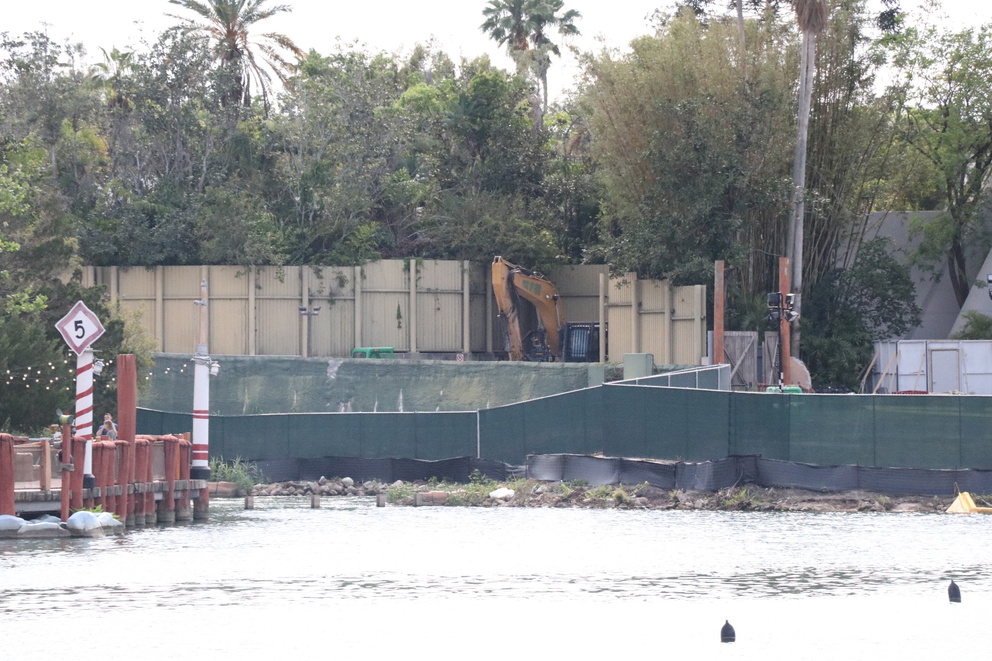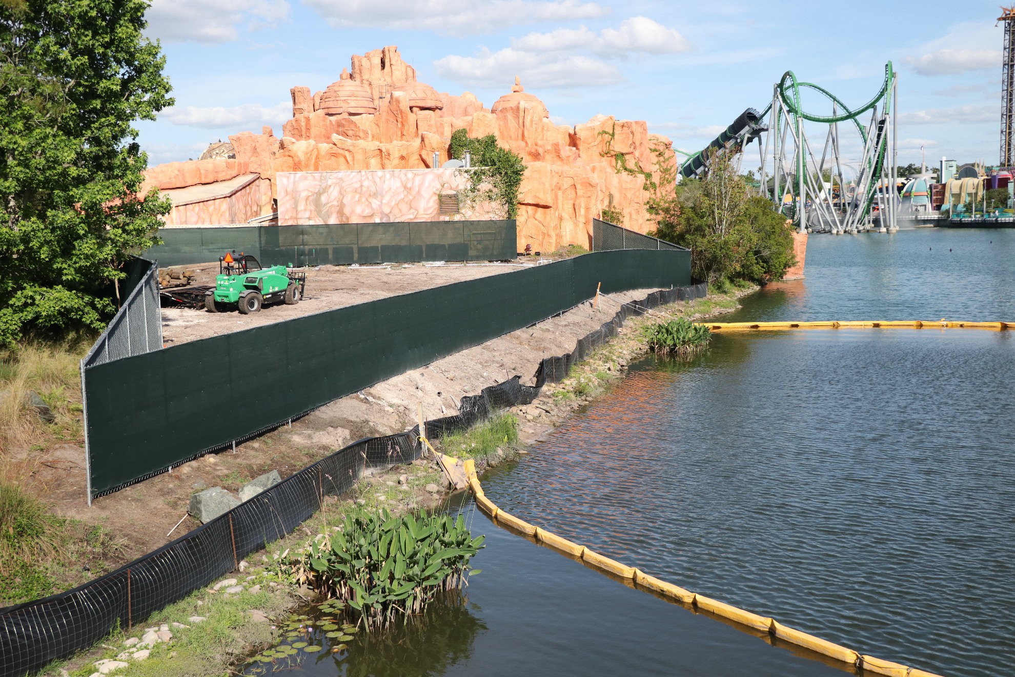 Foundation work has begun on the Jurassic Park waterfront, but it is still unknown as to what Universal’s official plans are for the area. The bypass bridge is completely gone, so we should see that begin construction soon, as it is expected to open by the Summer. Elsewhere around Jurassic Park, more trees have been removed near the old Triceratops Encounter as more land prep occurs. Also, walls have gone around a seating area near Pizza Preddatoria and around the smoking section near the Watering Hole.