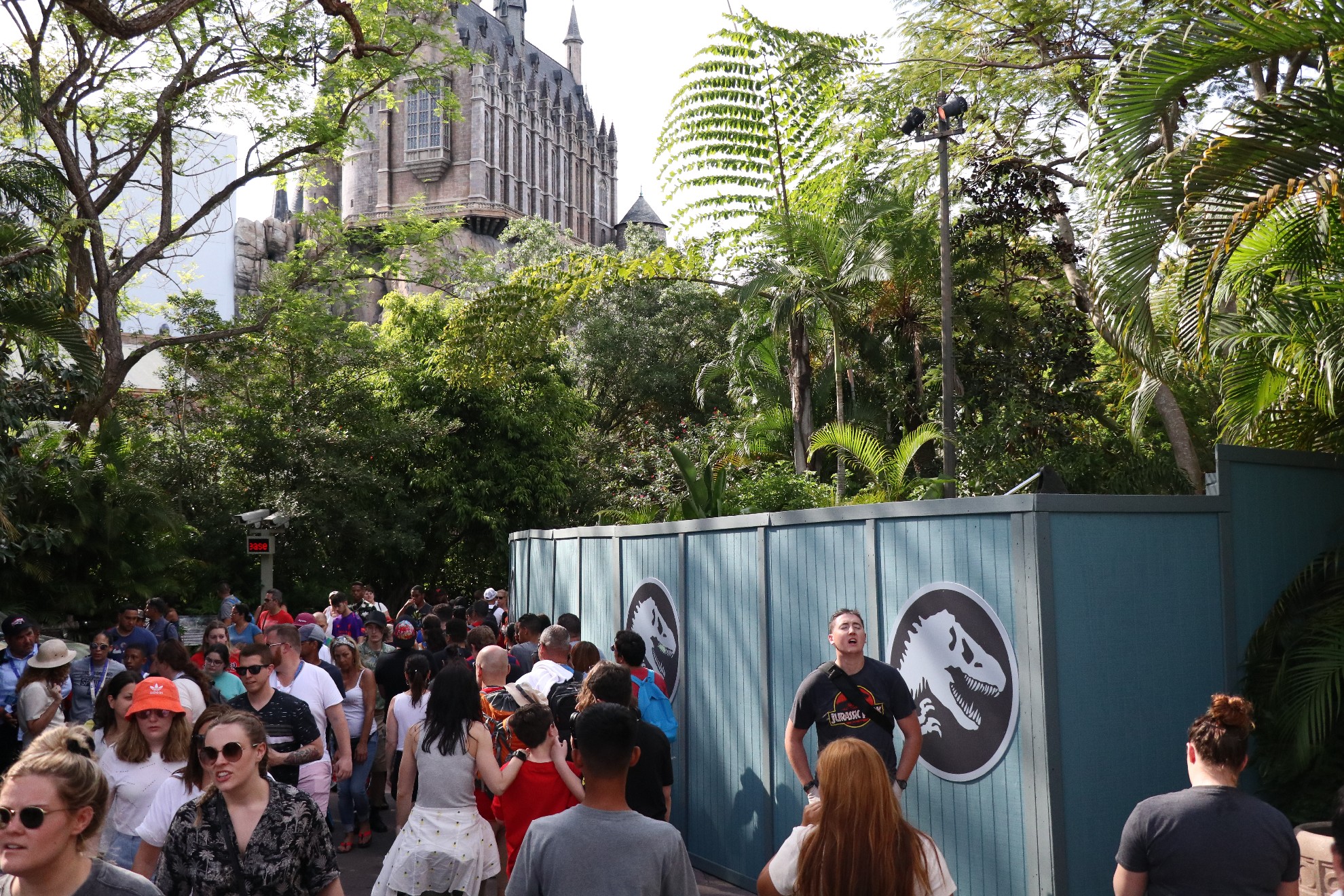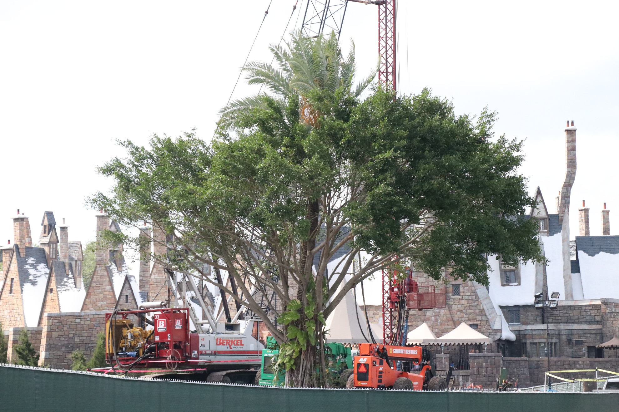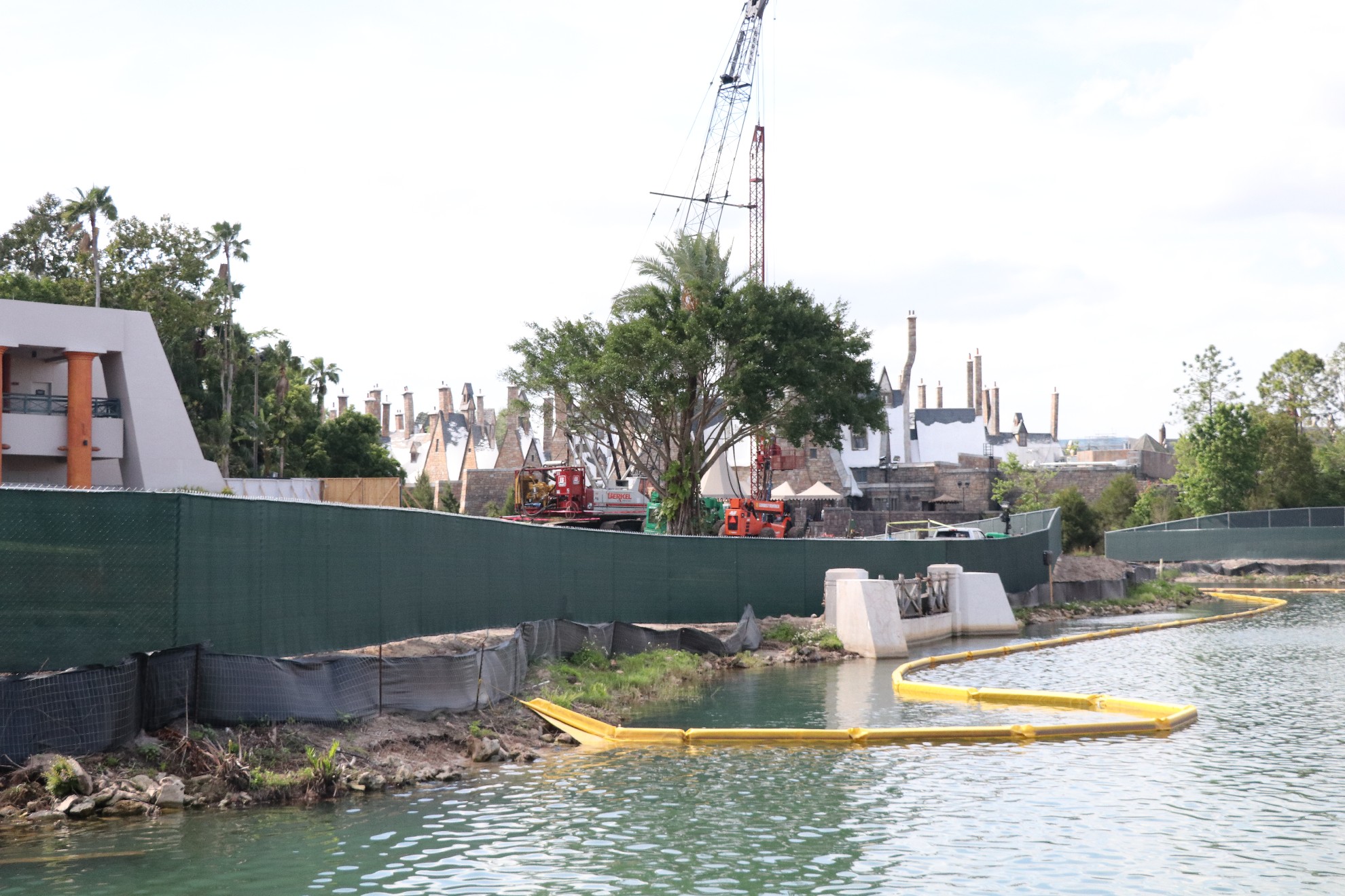 With a little under 2 months to go, the finishing touches are being worked on. The only “big” construction left is re-working the entrance facade. You can see the train testing from certain angles in the Wizarding World. The new building is currently being painted to blend in with the forest. Other than that, much of the work is behind construction walls, which we cannot photograph. Since our visit, we’ve heard that painting has begun on the barrier wall near Turkey Lake Road.