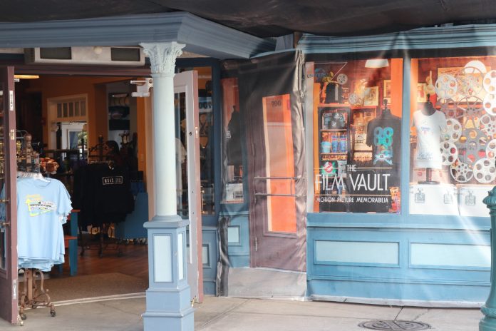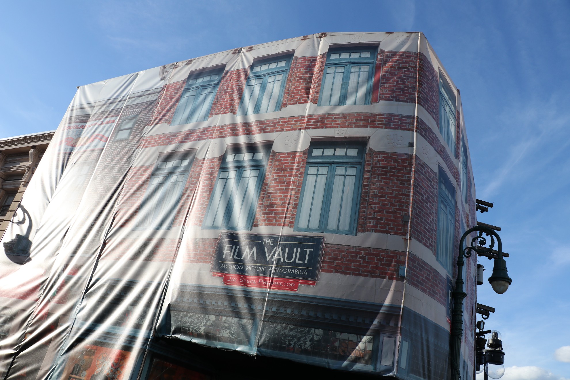The buildings around the Film Vault store are behind scrim as the facade is getting refurbished.