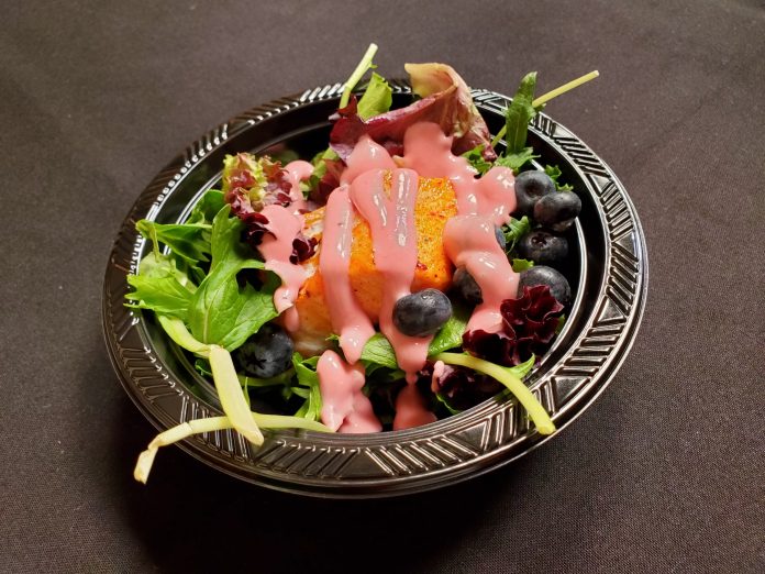 * Boysenberry Glazed Salmon over Mixed Greens and topped with a Boysenberry Vinaigrette