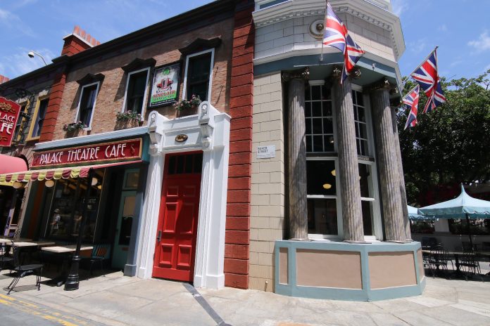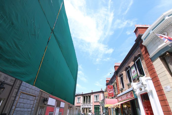Fulfilling its trend of rapid progress, the towering show building for the future family-friendly ride continues to take shape, though with most changes hidden from guest view behind scaffolding and scrim. Construction walls now sport the new logo for the attraction taking after that of the films, as well as its scheduled year to open – 2020. Due to the building’s substantial indent on the width of Baker Street, the additional seating found on the street corner adjacent to the Palace Theatre Café has been removed to create more walking space.
