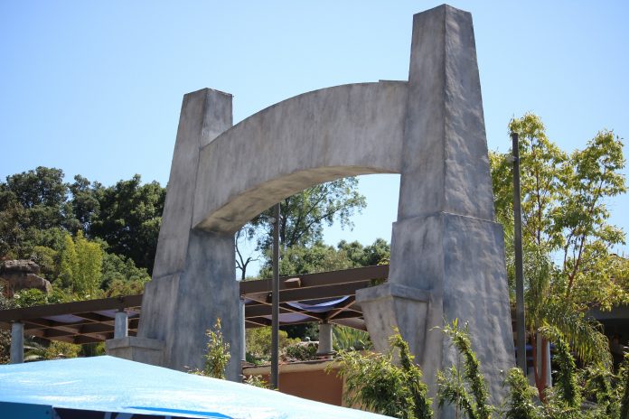 Construction on the transformation of Jurassic Park: The Ride and its respective area into Jurassic World has profoundly progressed. The blue and gray color scheme from the films continues to dominate with the disappearance of the previously red shades in favor of a bright blue, as well as the near-completion of the new aged gray arch marking the entrance to the ride. Additional rock formations surrounding the new planters and palm trees continue to appear throughout the mini land. The new Raptor Encounter building continues to take shape as well with the appearance of new fencing by its entrance and exit.
