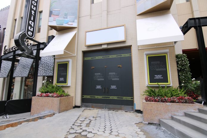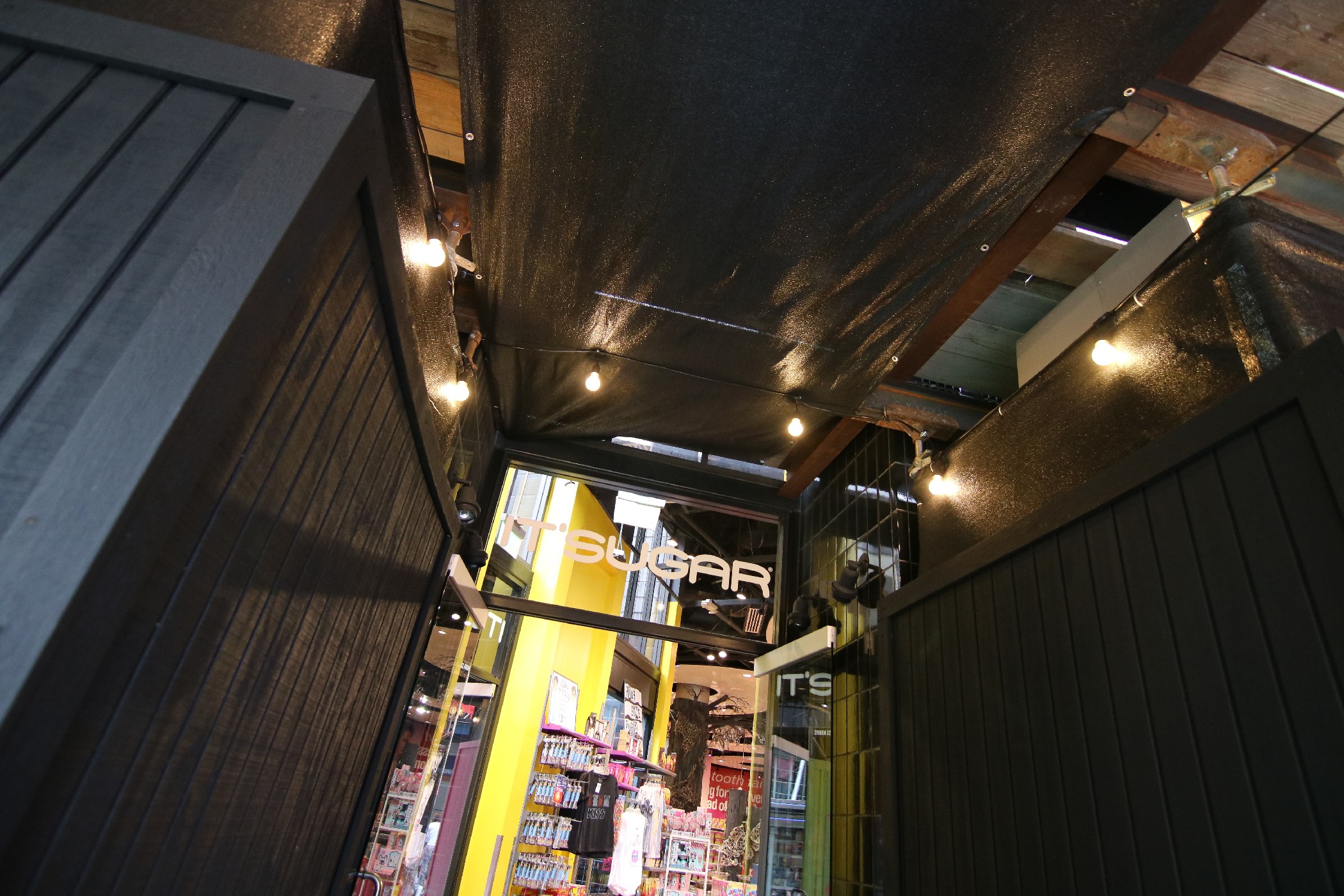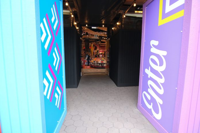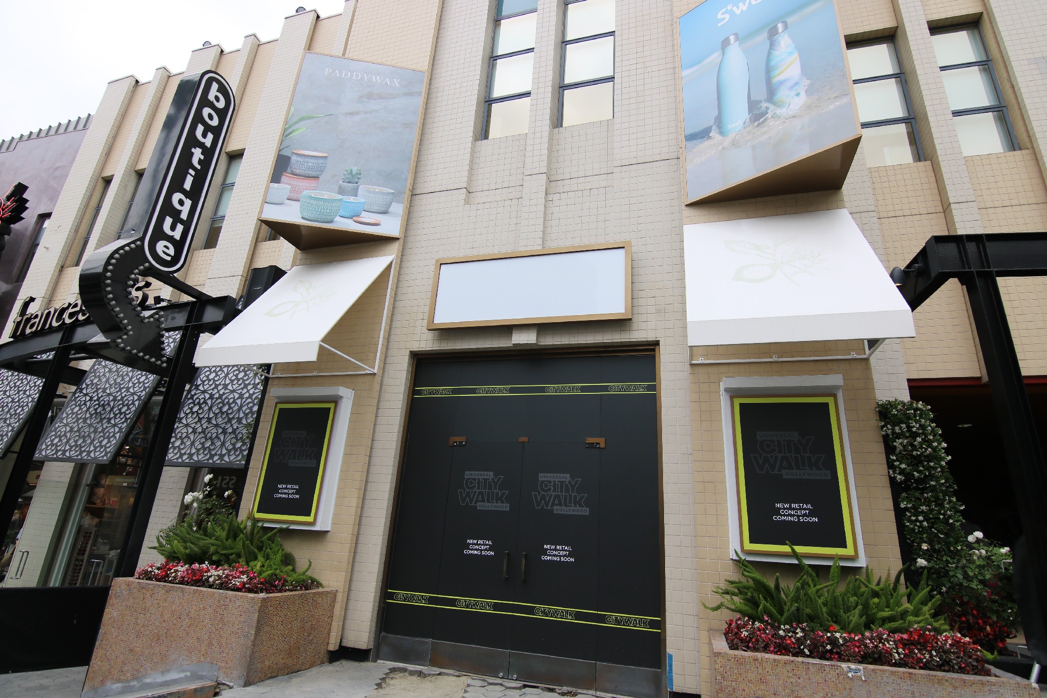IT’SUGAR continues its refurbishment on the outside of the candy store, though looks mostly the same as when we visited for our most recent update. Bright columns sporting advertisements for the store distract from the black scrim just above.