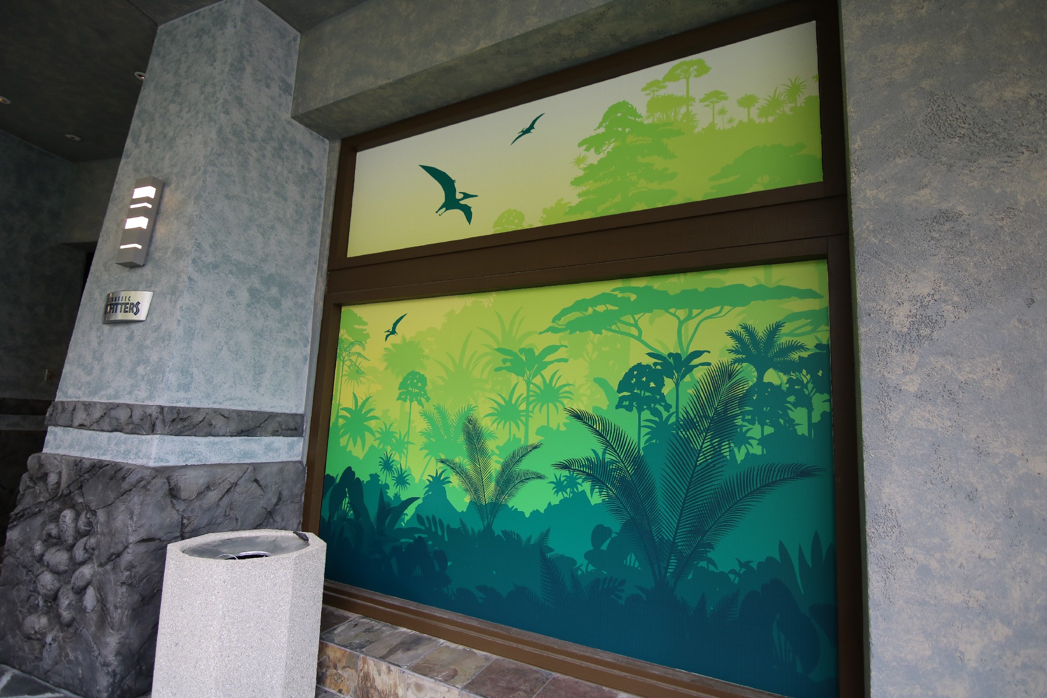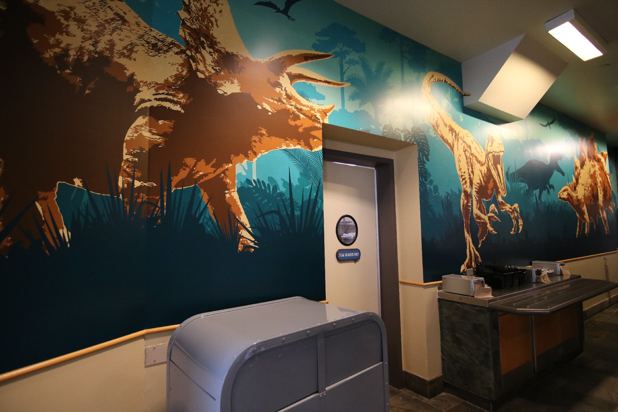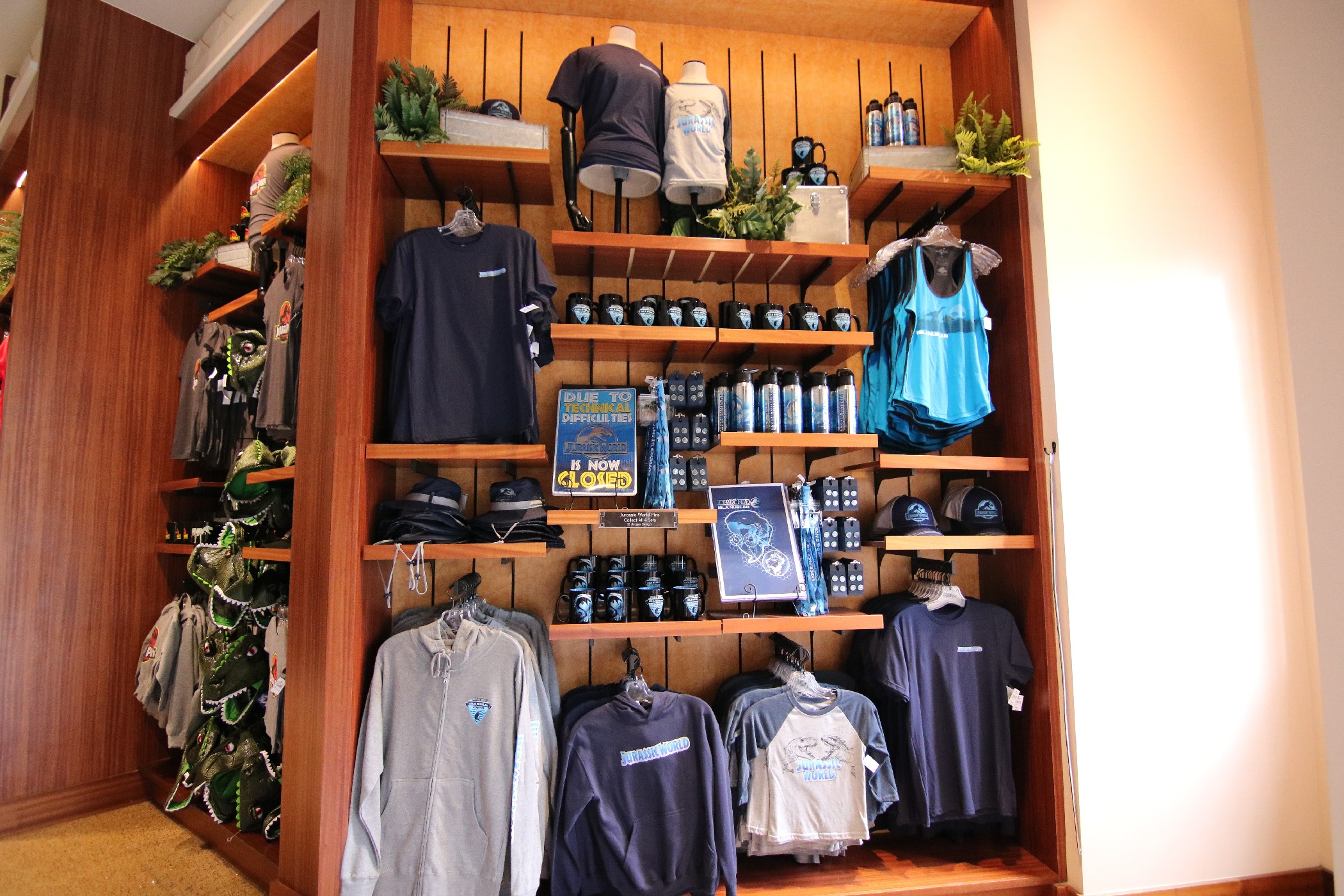 On the inside of the store, new tile work, as well as modern-looking shelves and registers, give Jurassic Outfitters a refreshing yet similar look to the days of Jurassic Park: The Ride. A handful of new merchandise specifically made for the new ride is available for purchase, though many of the previous Jurassic Park and Jurassic World items and displays still remain. The photo pick-up location has also been revamped, sporting a sleek style fitting with the rest of the Jurassic World theme.