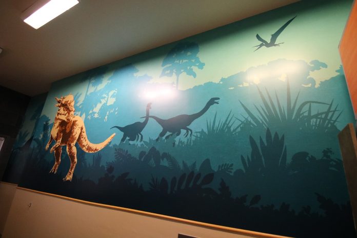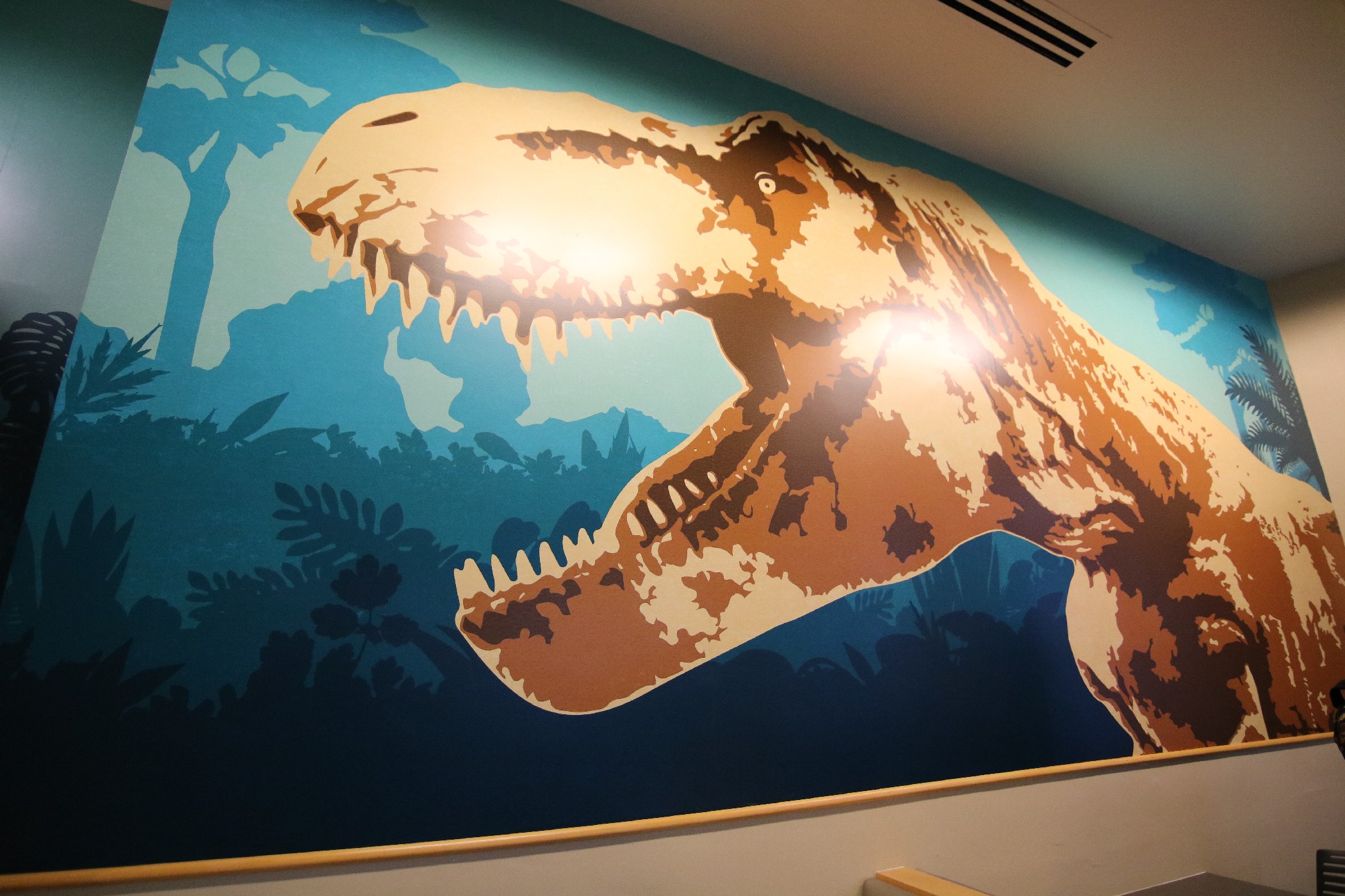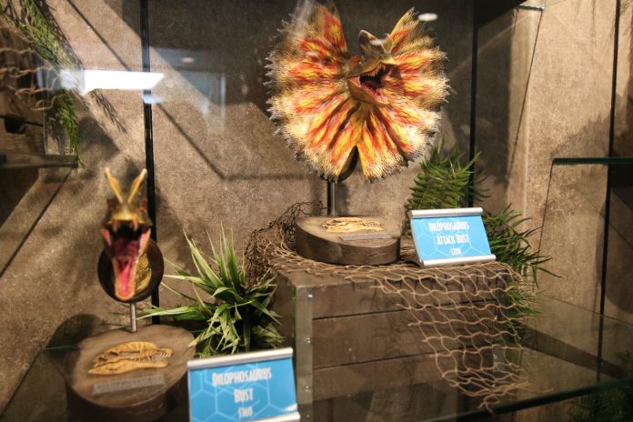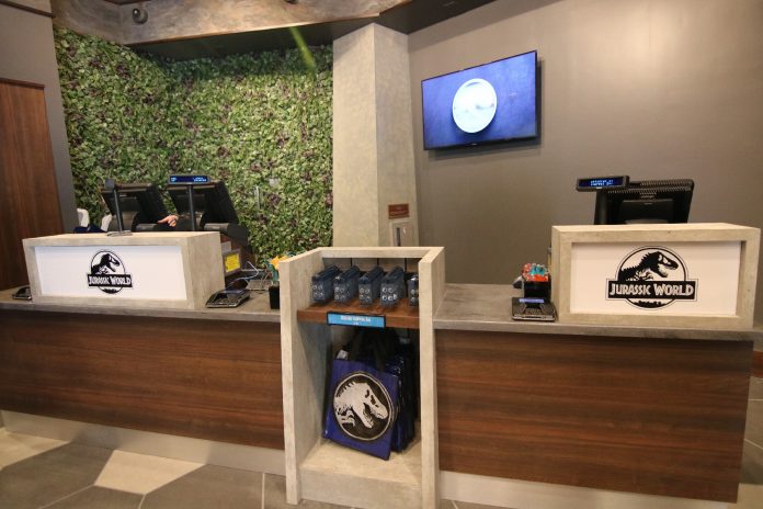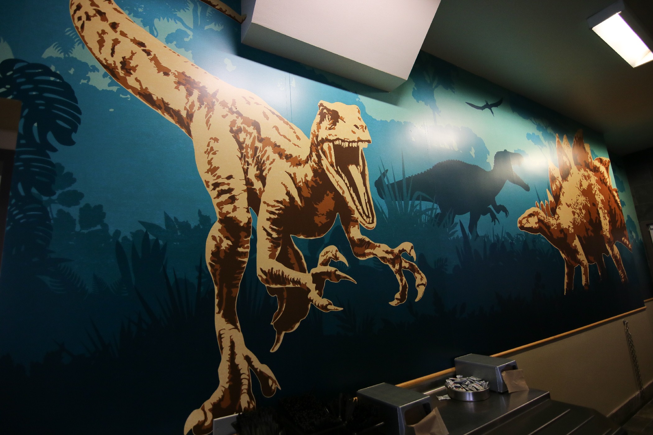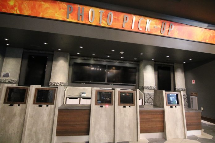 On the inside of the store, new tile work, as well as modern-looking shelves and registers, give Jurassic Outfitters a refreshing yet similar look to the days of Jurassic Park: The Ride. A handful of new merchandise specifically made for the new ride is available for purchase, though many of the previous Jurassic Park and Jurassic World items and displays still remain. The photo pick-up location has also been revamped, sporting a sleek style fitting with the rest of the Jurassic World theme.