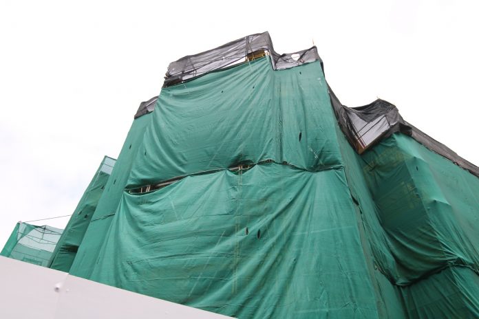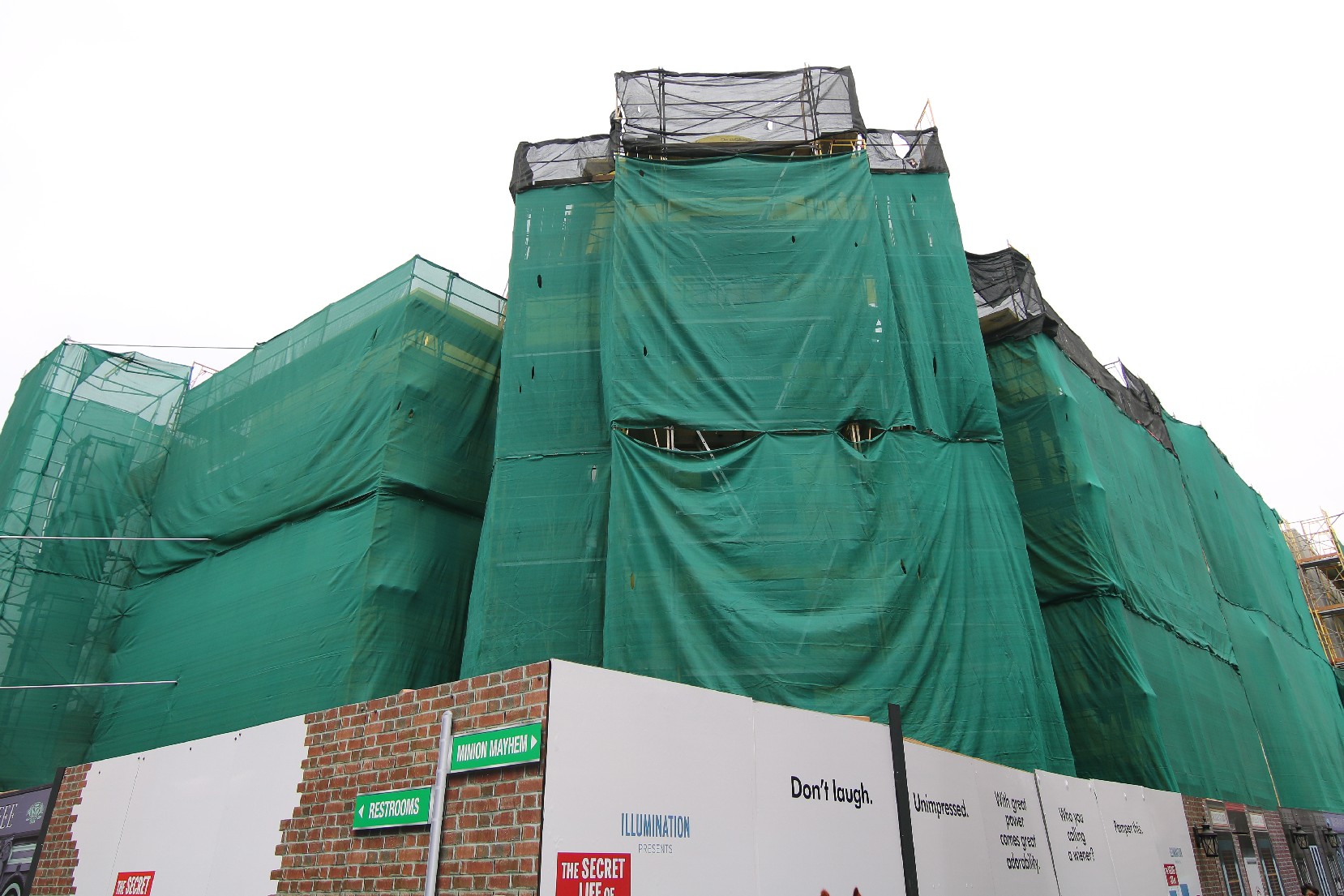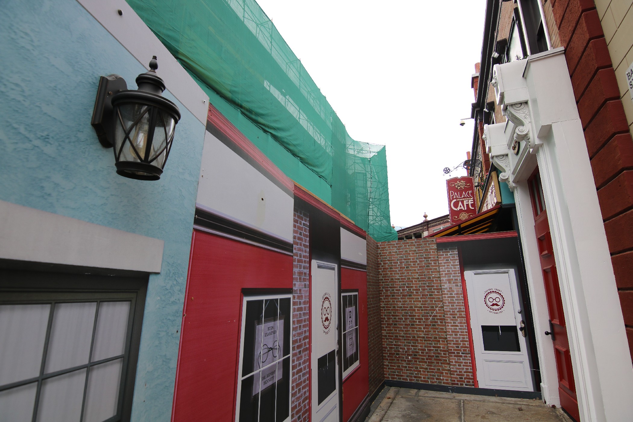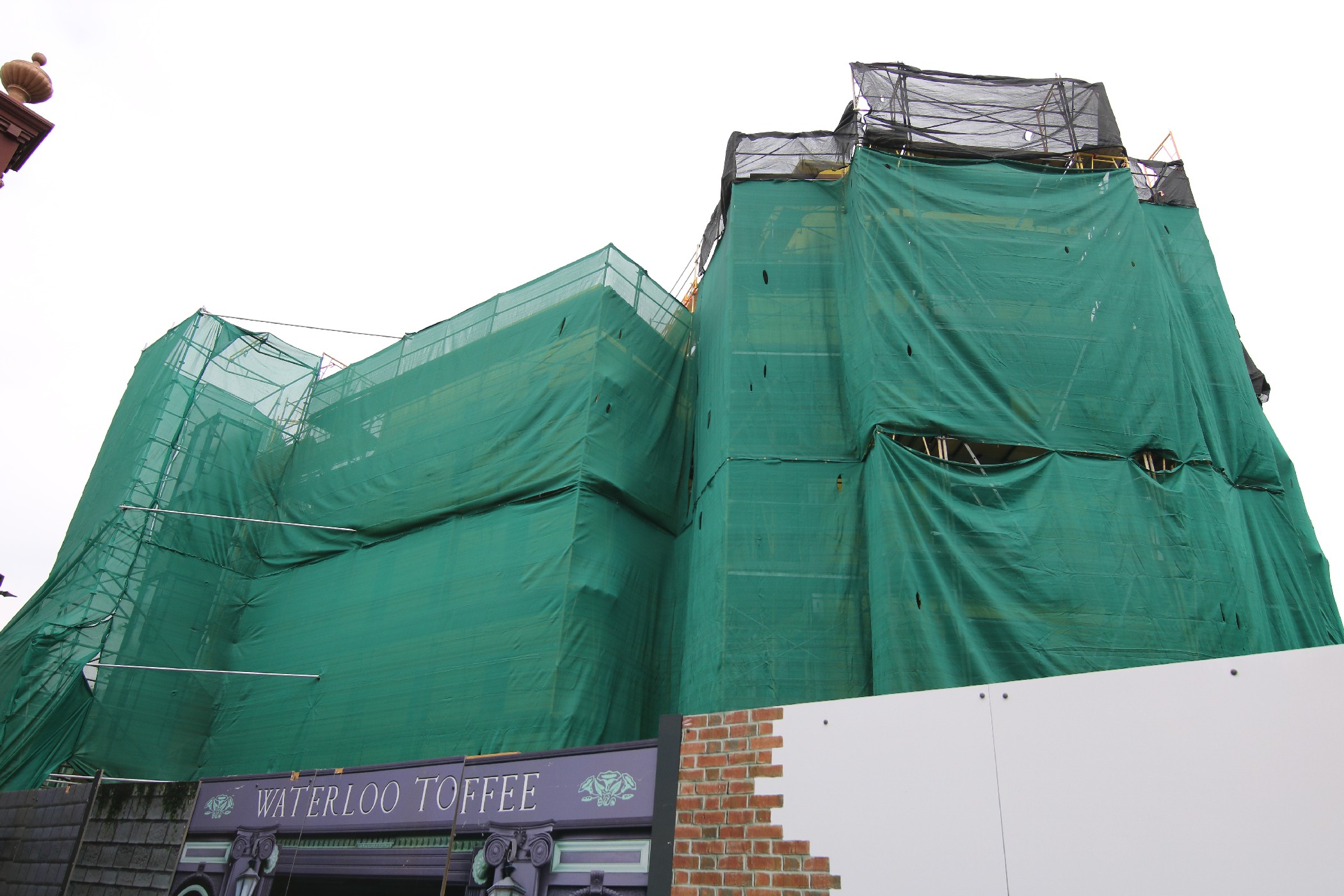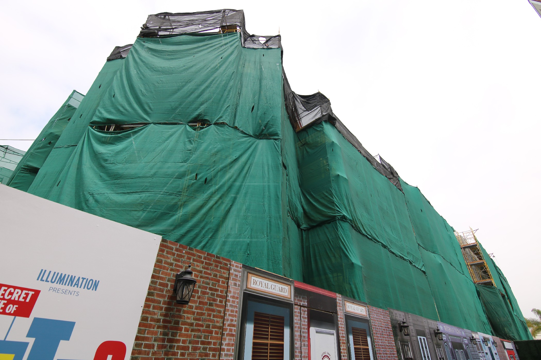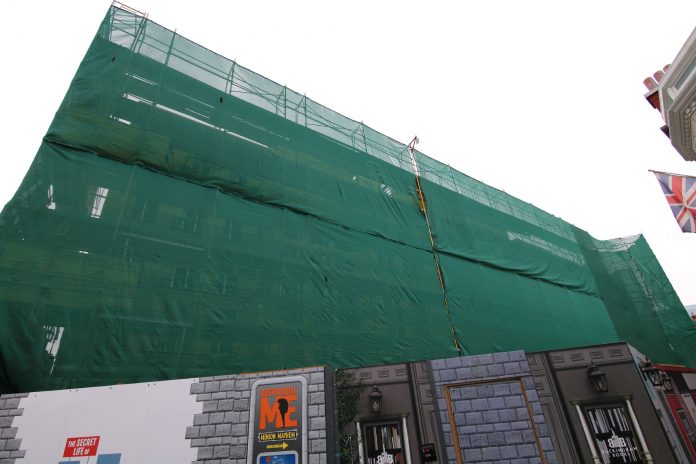 Though most of the show building remains covered by scaffolding and scrim, views from particular angles reveal its tan and grey sides, as well as an idea of just how quickly construction continues to progress on the ride opening in early 2020. Baker Street has been closed off once again – despite the growing summer crowds – due to scaffolding extending too far out into the walkway.
