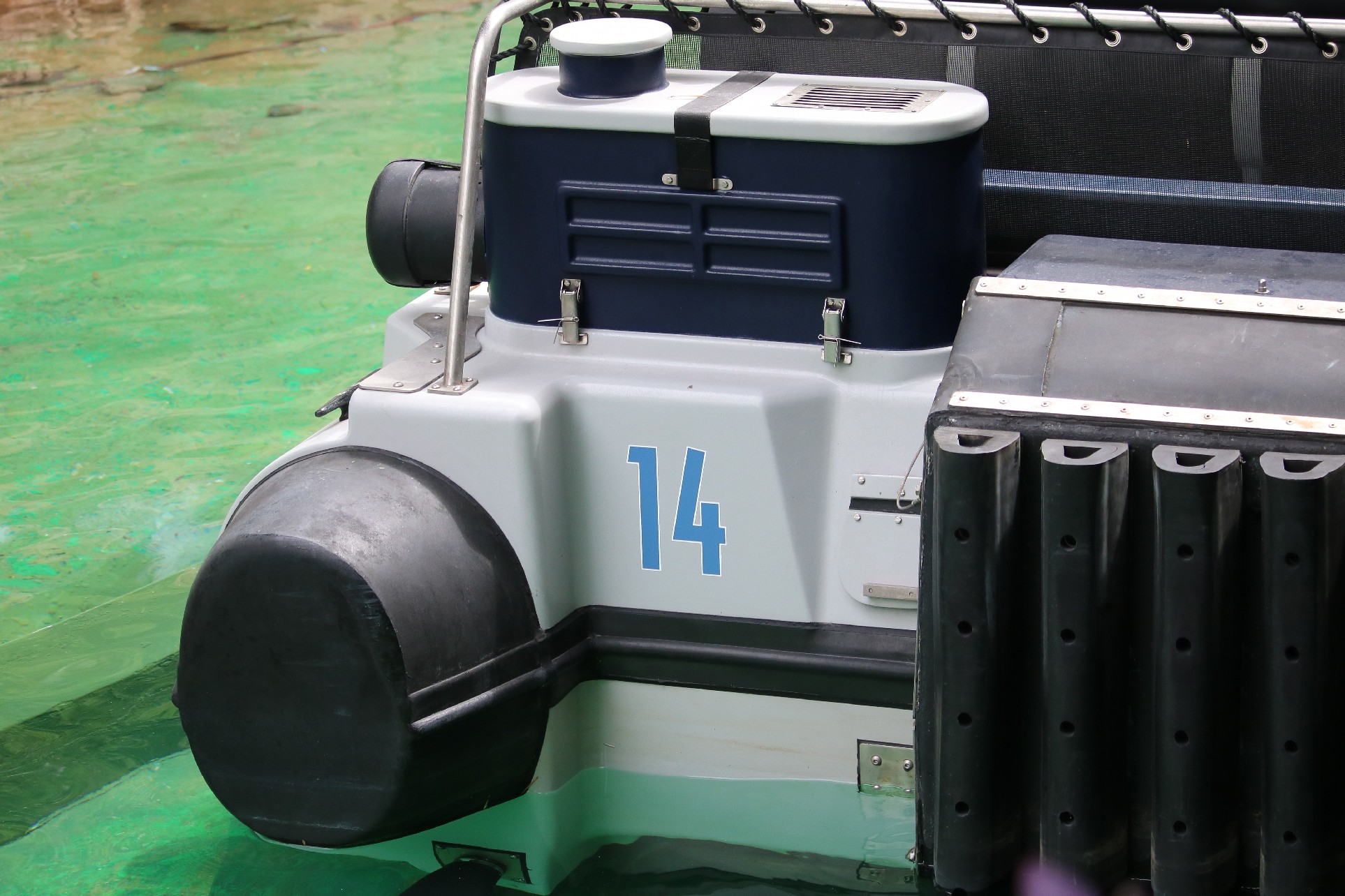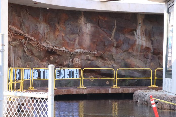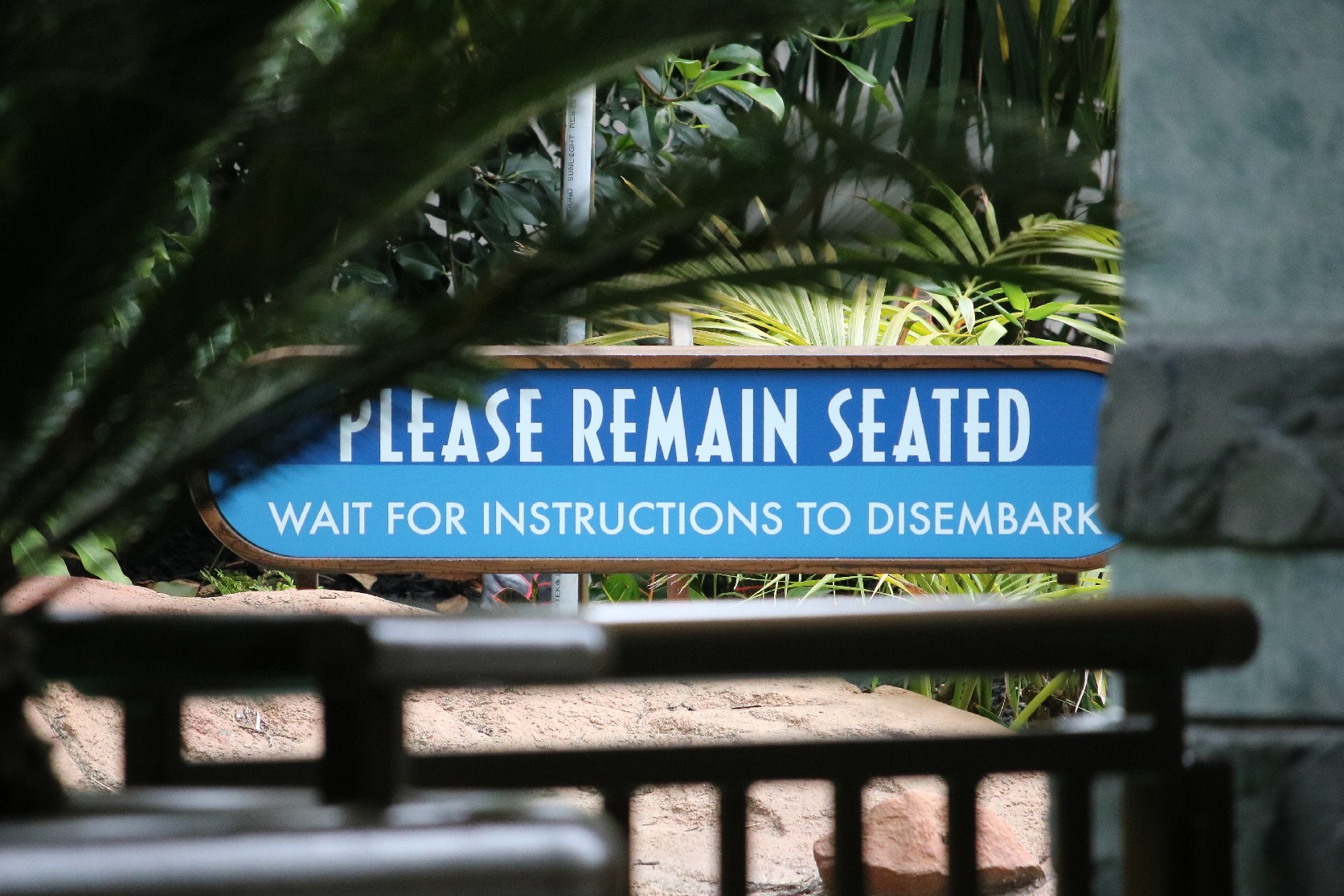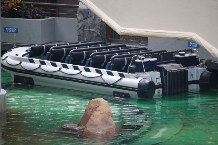 While the waterfall flows into the lagoon for Jurassic World: The Ride and breathes life into the area, the boats for the ride did, however, remain stationary during our most recent visit, granting us the opportunity to get our closest look yet at the ride vehicle. The boats are the same ones previously used in the former Jurassic Park: The Ride, though have been repainted with a light grey and black color scheme to better fit the aesthetic of Jurassic World.