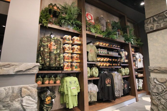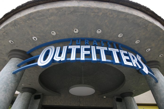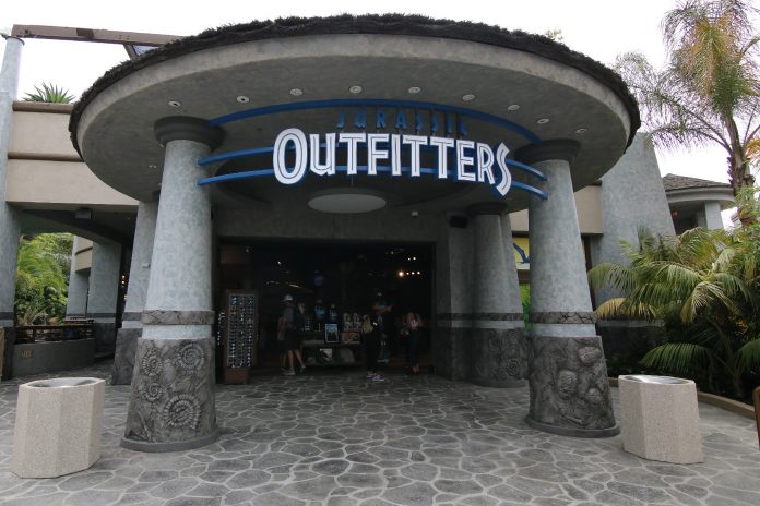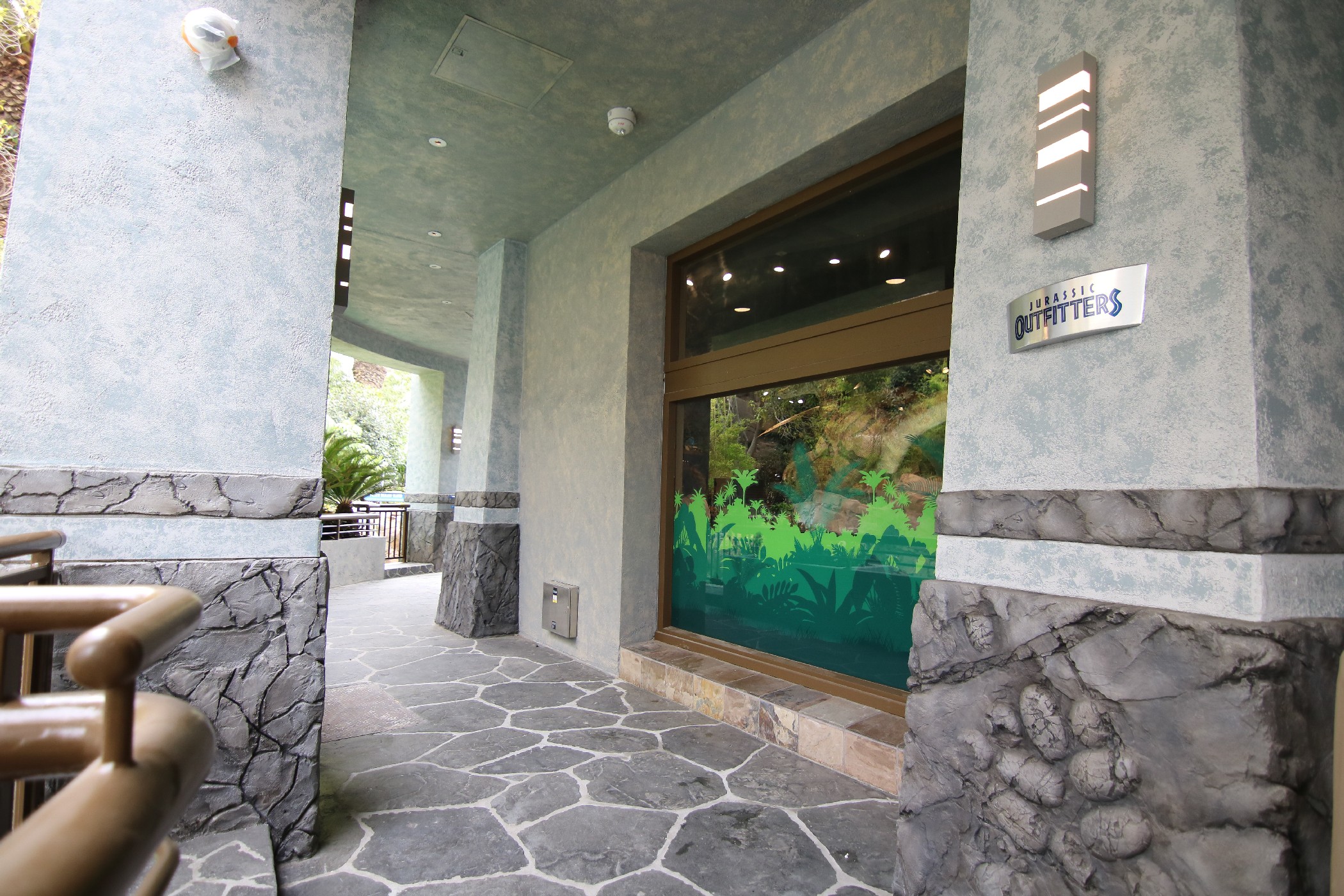 Jurassic Outfitters looks mostly the same as when it was previously themed to Jurassic Park, though has adapted the grey color scheme found all throughout the rest of the mini-land. The faux dinosaur fossils decorating the outside of the store still remain along with the building’s structural framework, though a new mural has been placed on the side of the store facing Jurassic World: The Ride.