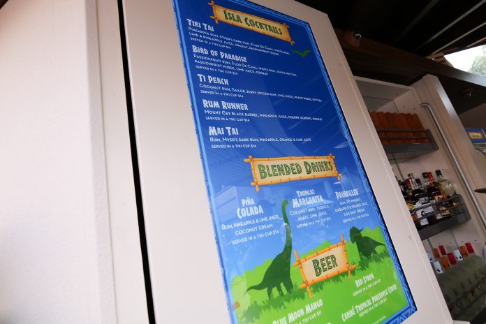 Close to the entrance of the Jurassic World arch is the new Isla Nu-Bar selling a variety of tropical-themed alcoholic beverages.