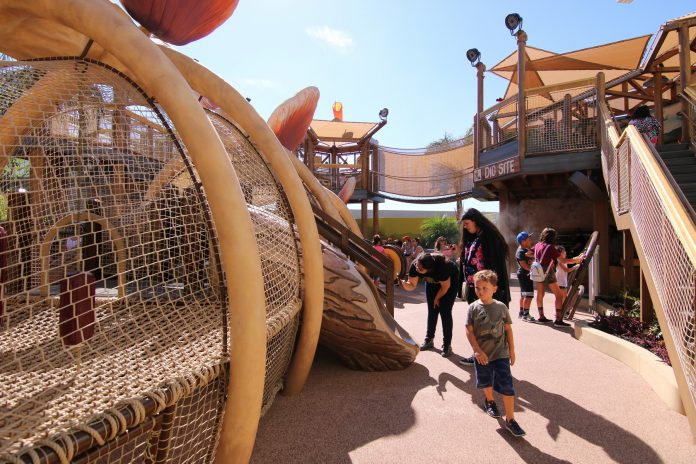 Following the initial soft opening of the ride, Dino Play in addition to the Jurassic World upper seating area have reopened. Dino Play now features additional structures expanding the playground vertically as well as introducing new displays of dinosaur and paleontology related tools and facts to make the experience more interactive for children to enjoy. The upper seating area remains mostly the same aside from the new color scheme matching the greys and blues of the Jurassic World aesthetic.