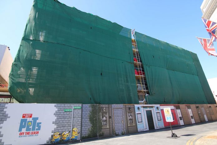 The temporary ceiling above the outside queue for The Walking Dead Attraction is gradually being removed as construction finishes up on the adjacent exterior of “The Secret Life of Pets: Off the Leash!”.