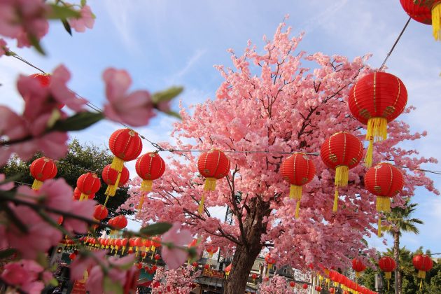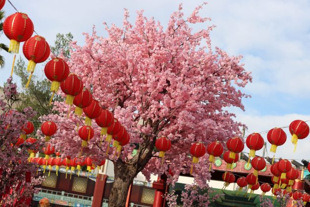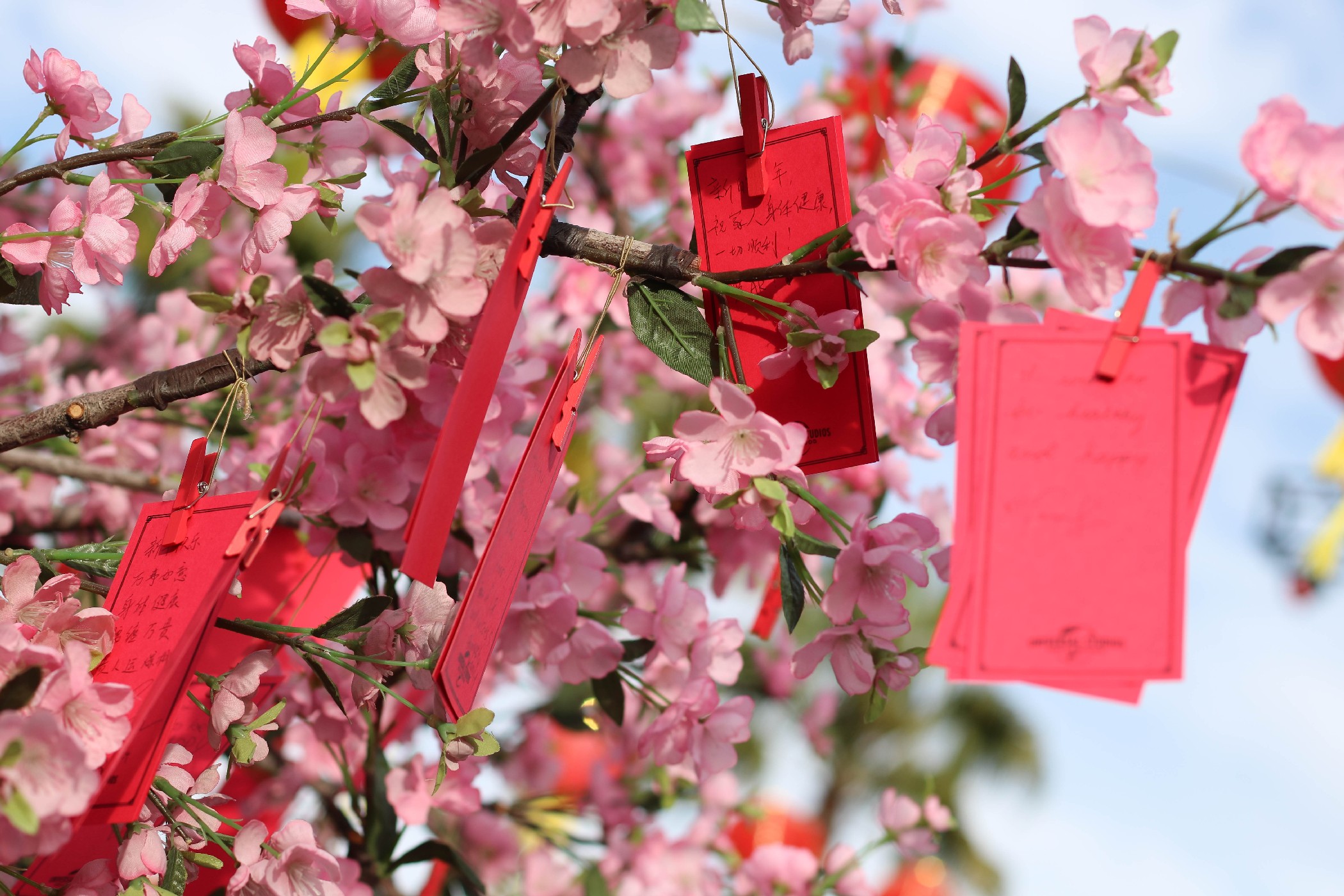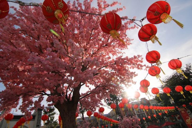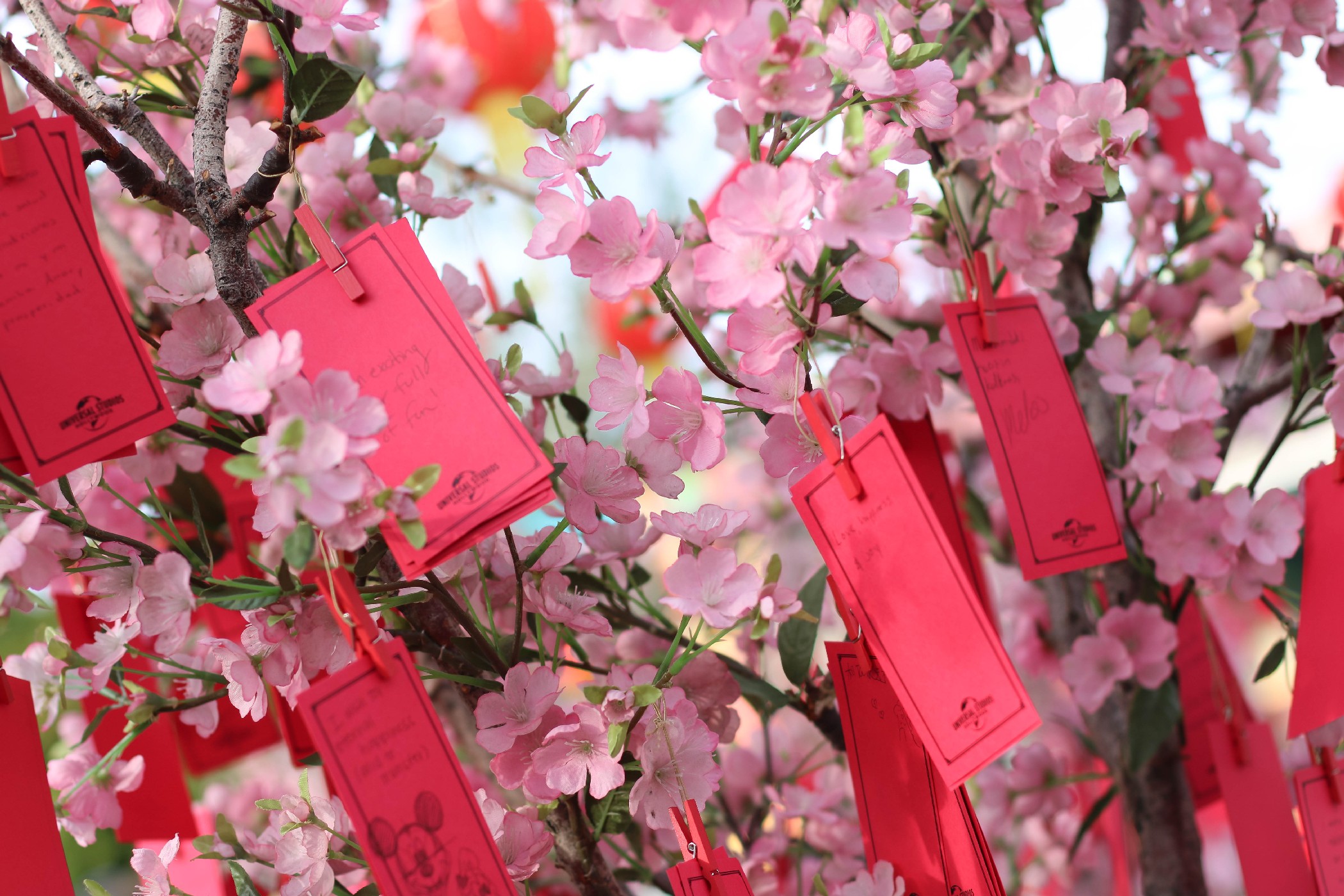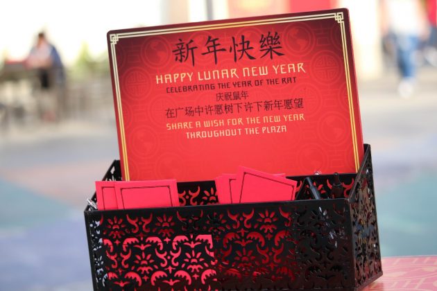 Customary red Chinese lanterns and cherry blossom wishing trees add beauty to Universal Plaza as lovely music echoes throughout in the background. Here, at the center of the Plaza, guests are once again encouraged to write their wishes for 2020 on small red cards and then hang them on the branches of the wishing trees as customary tradition.