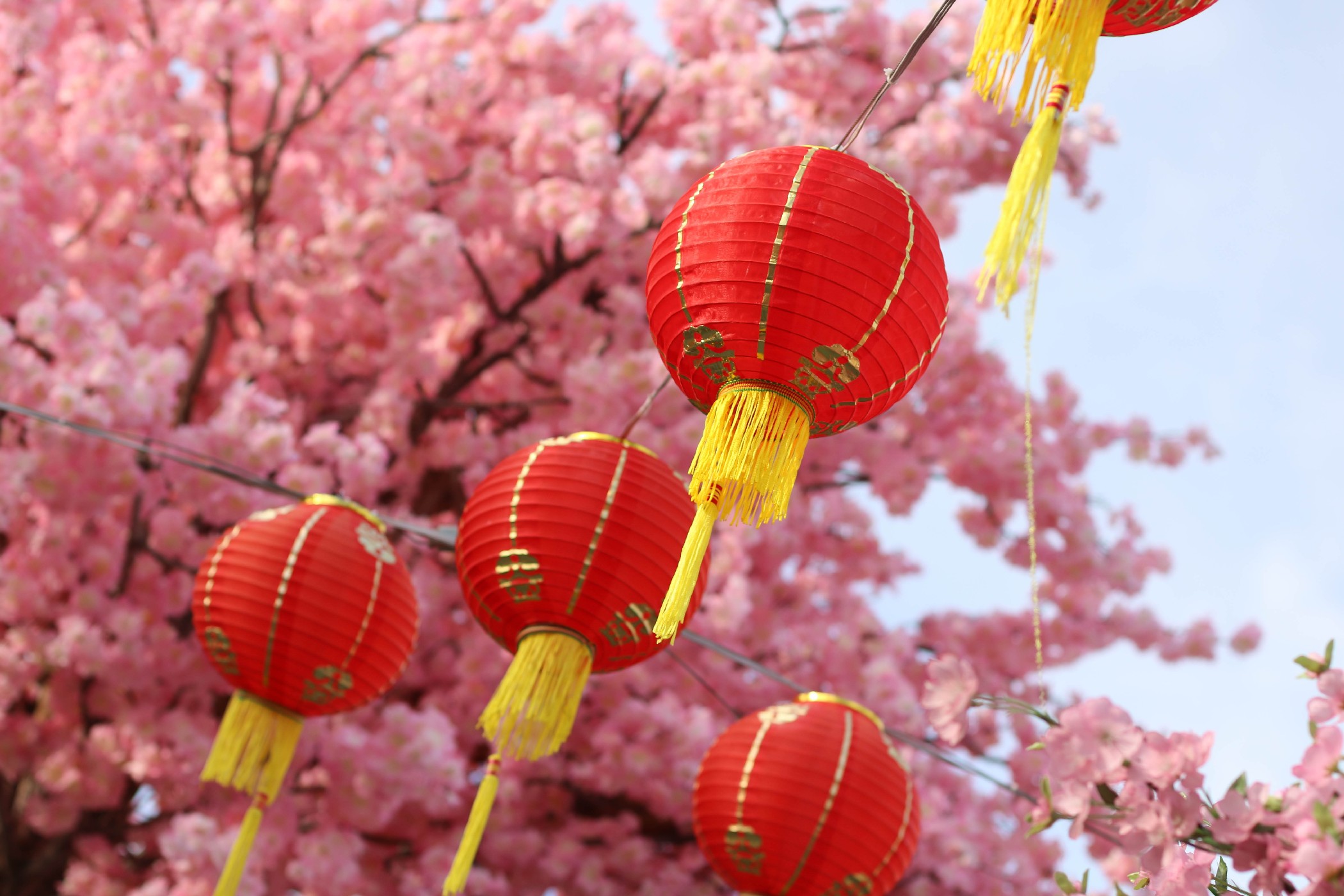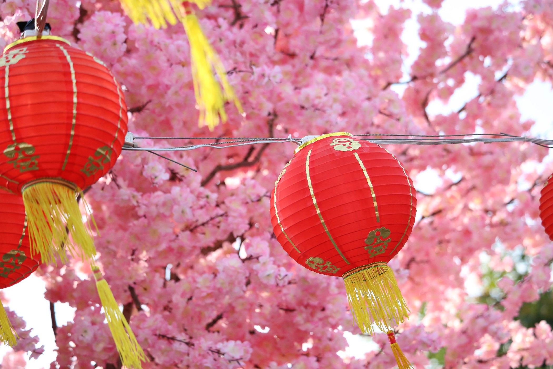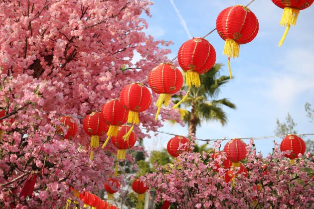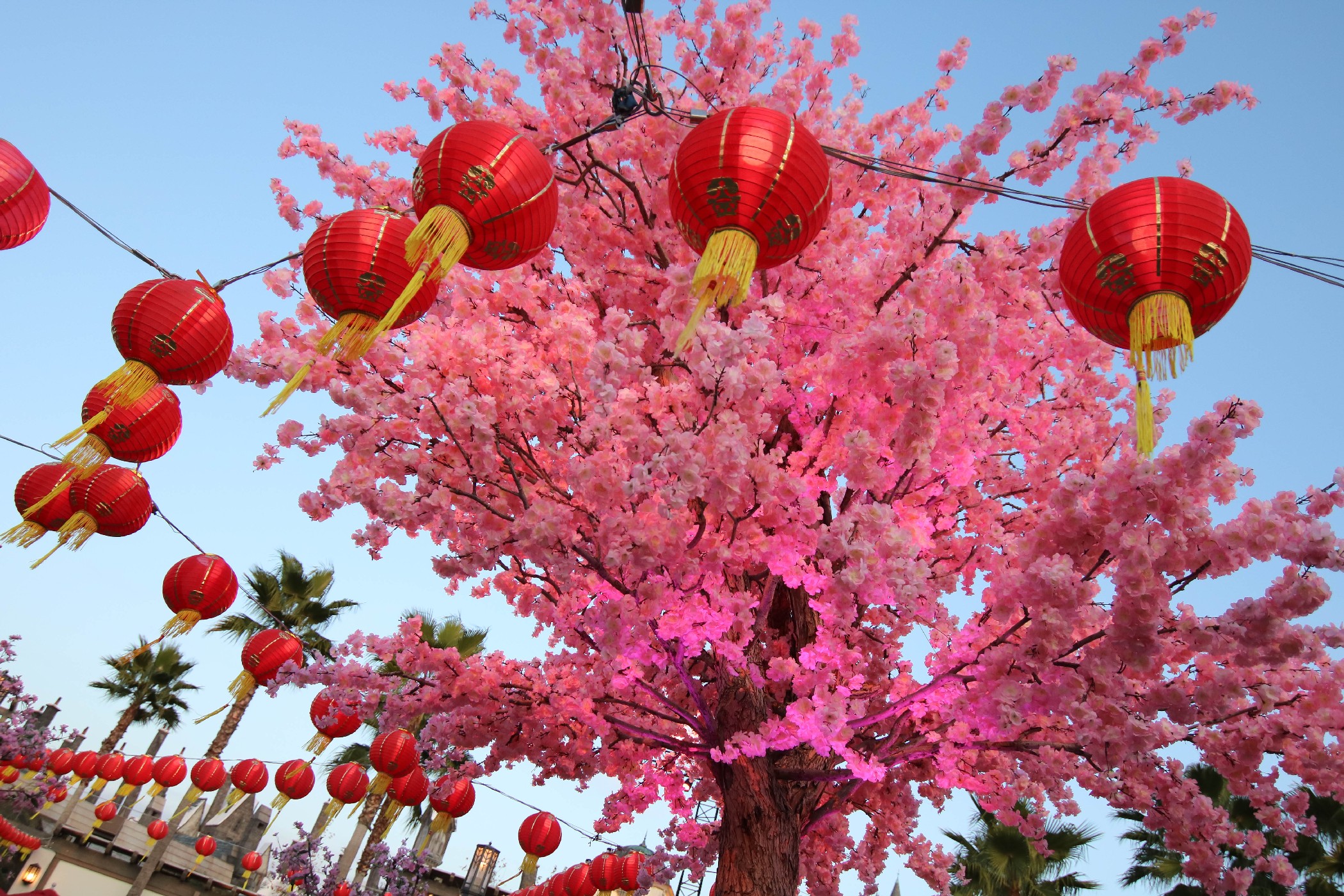 Customary red Chinese lanterns and cherry blossom wishing trees add beauty to Universal Plaza as lovely music echoes throughout in the background. Here, at the center of the Plaza, guests are once again encouraged to write their wishes for 2020 on small red cards and then hang them on the branches of the wishing trees as customary tradition.