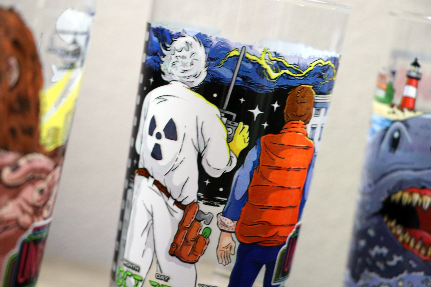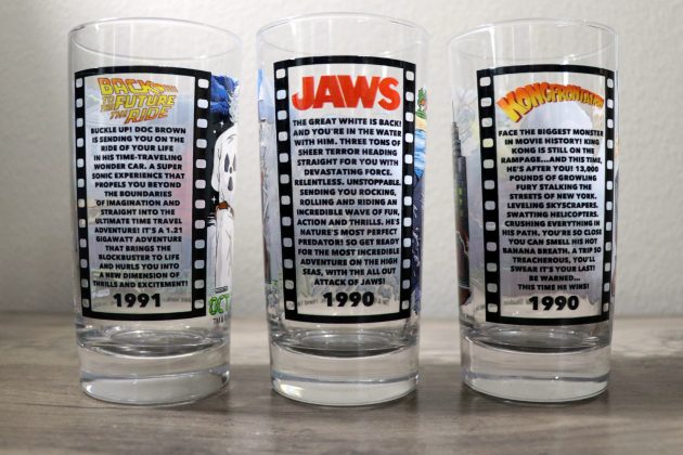 The retired attractions are represented in a set of glasses – featuring Back to the Future: The Ride, Jaws, and Kongfrontation. The E.T. Adventure, the park’s lone Opening Day attraction still in operation, is also available. The glassware features artwork and descriptions of the attraction, along with the year it opened. Each glass retails for $10.