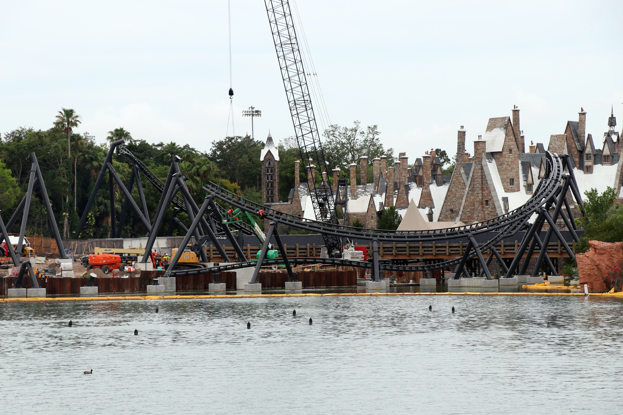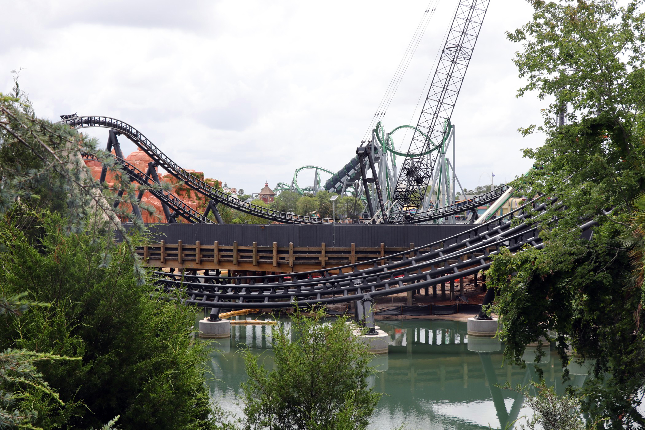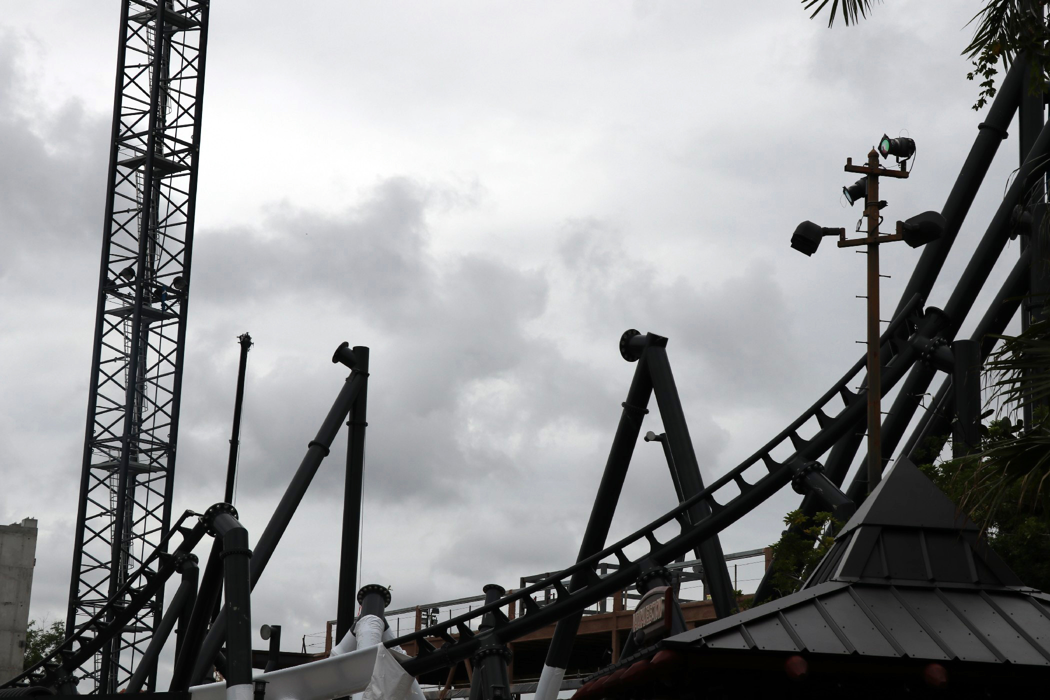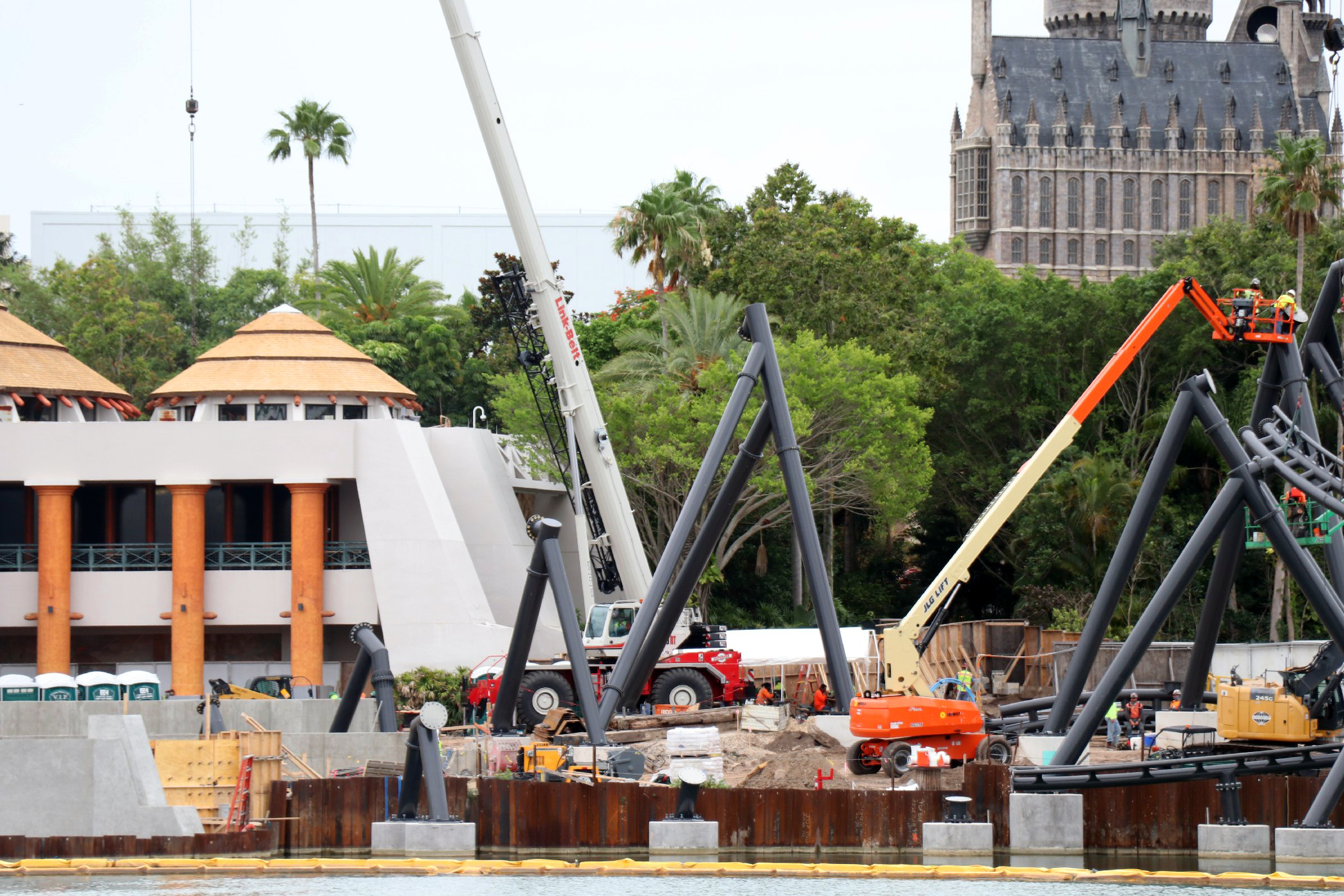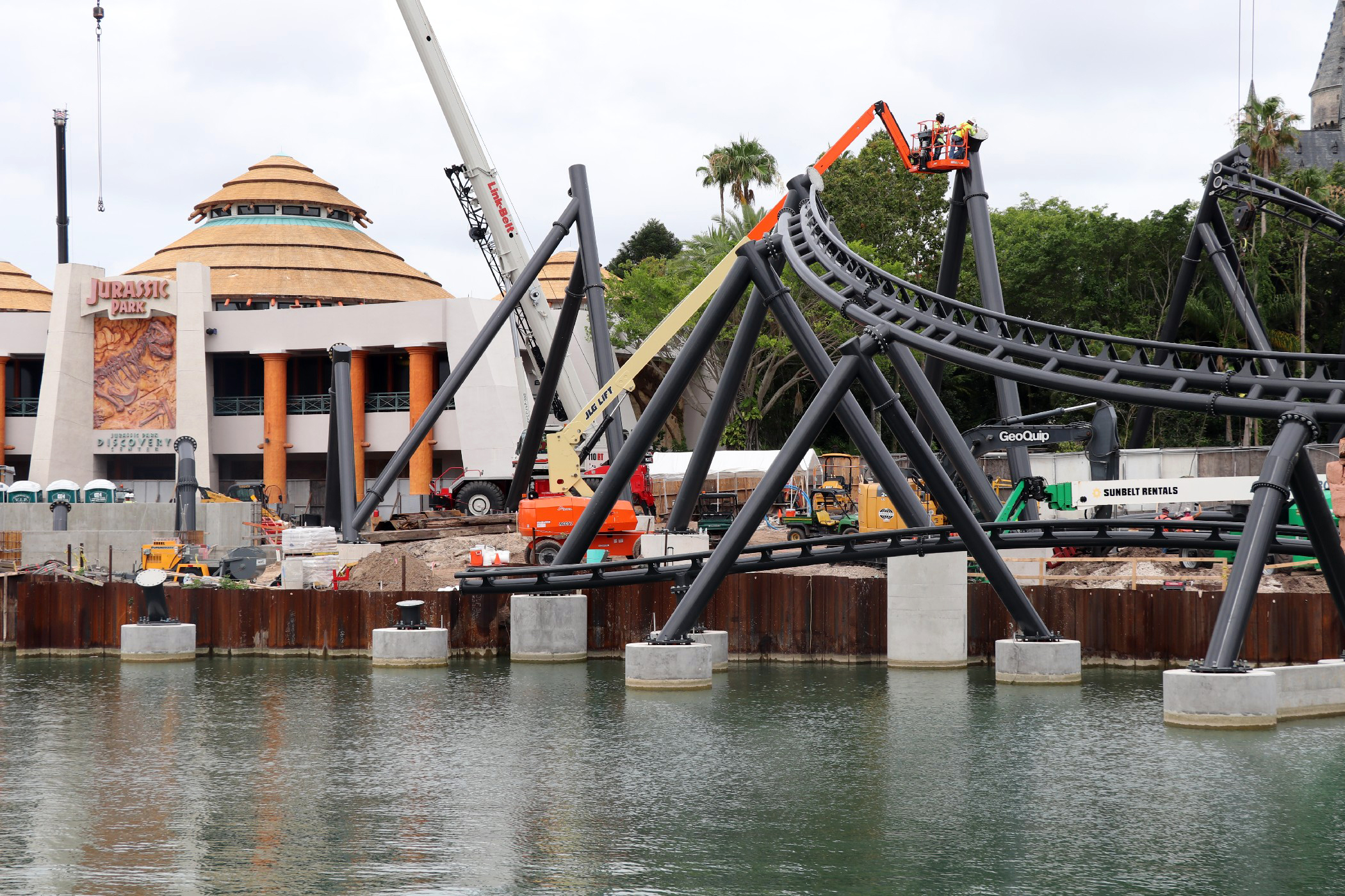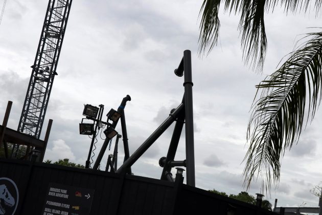 The coaster stretches across the coast of Jurassic Park, from Popeye & Bluto’s Bilge Rat Barges in Toon Lagoon running all the way near the outside area of the Three Broomsticks in the Wizarding World – Hogsmeade. The most noticeable aspect of the construction is the huge support to the left of the Visitor Center that towers into the sky. A bulk of the track has been installed in the helix near the Three Broomsticks. Other track pieces have been installed throughout the project’s construction area near Jurassic Park River Adventure, with the initial construction of thematic rockwork also beginning to appear.