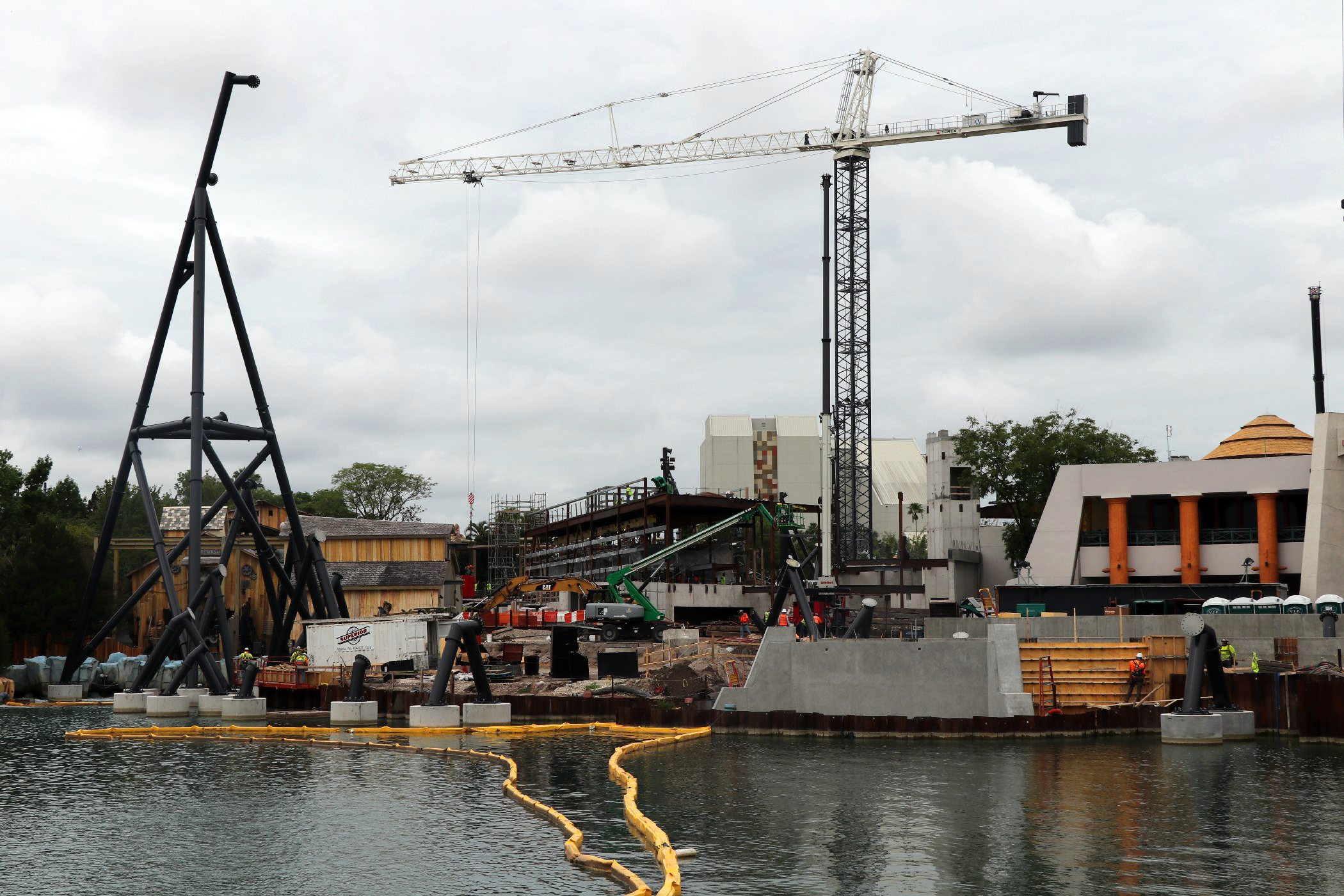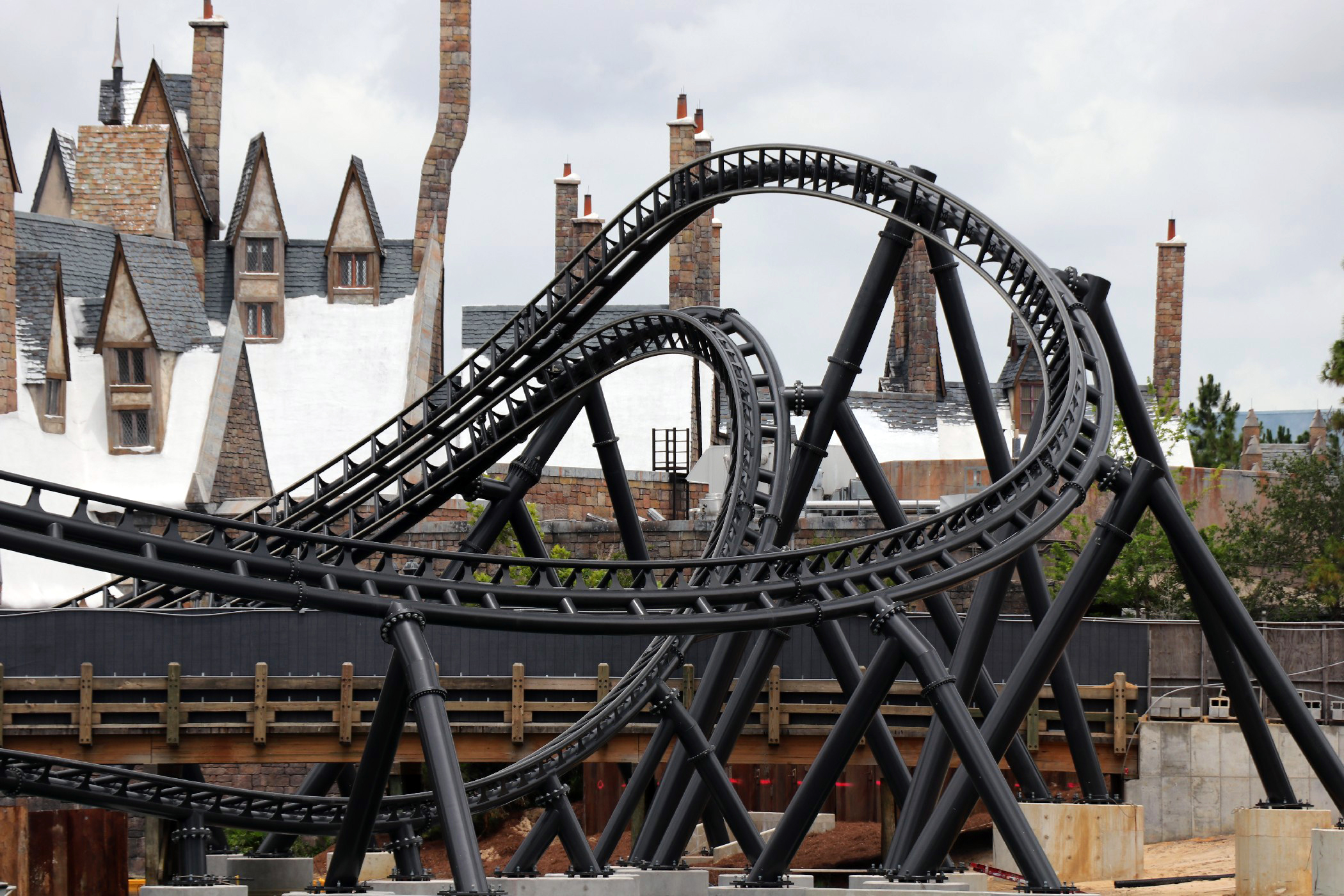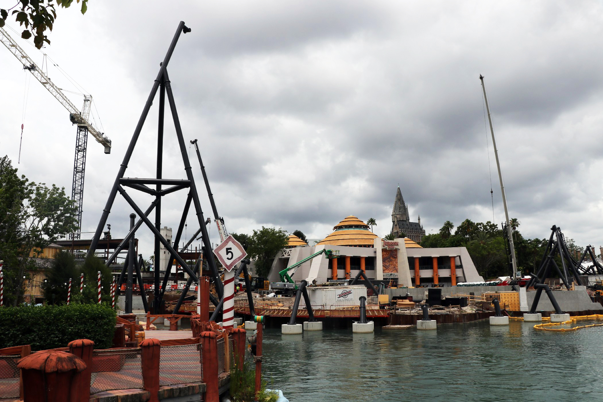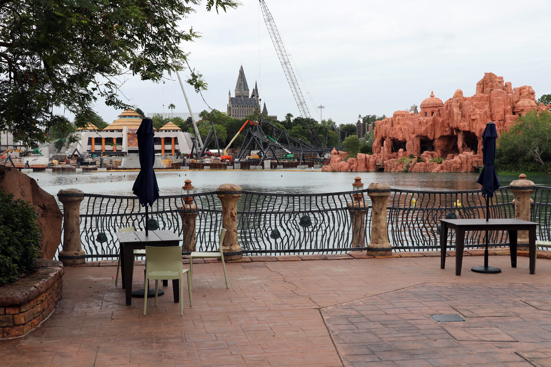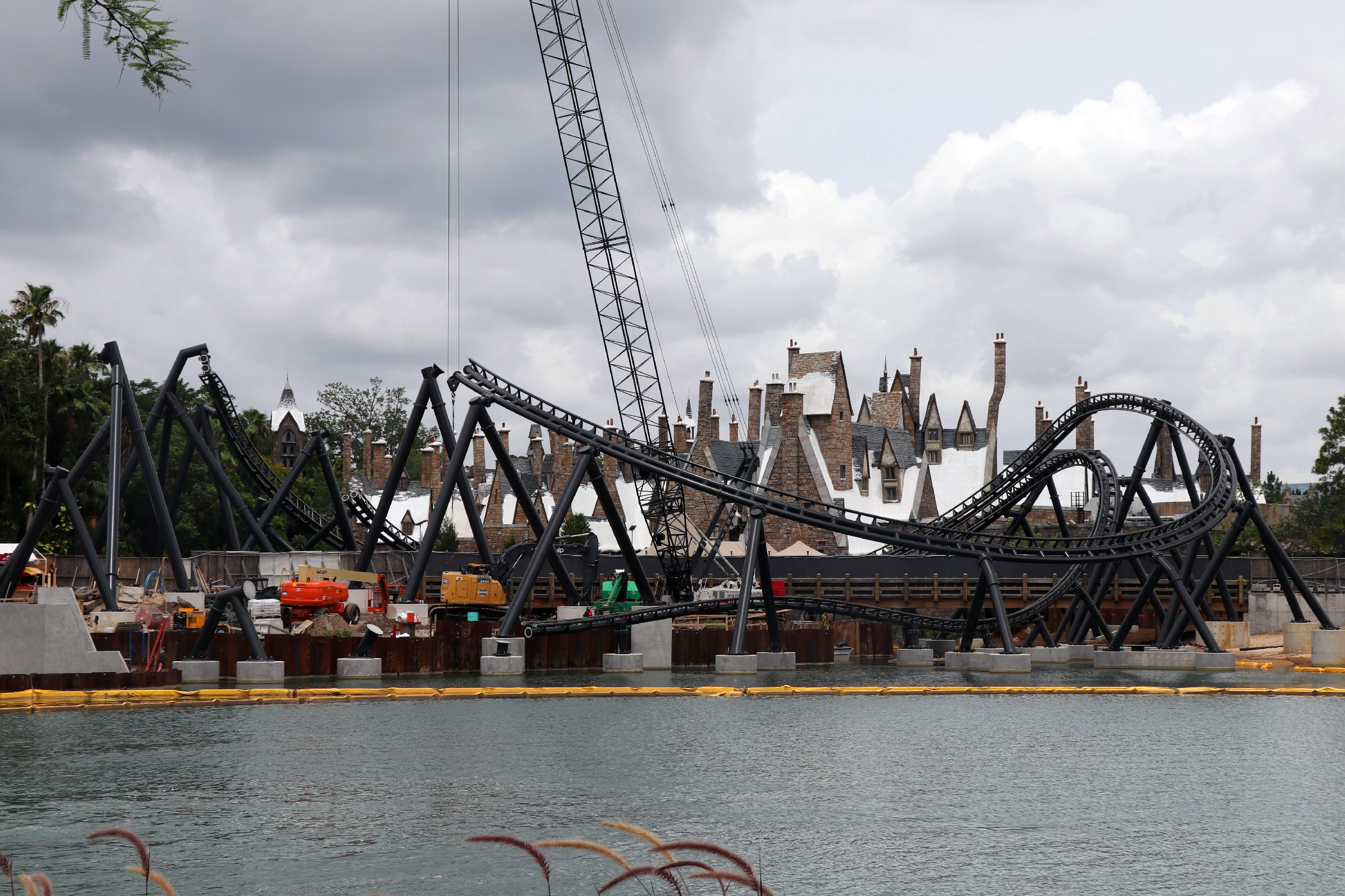 The coaster stretches across the coast of Jurassic Park, from Popeye & Bluto’s Bilge Rat Barges in Toon Lagoon running all the way near the outside area of the Three Broomsticks in the Wizarding World – Hogsmeade. The most noticeable aspect of the construction is the huge support to the left of the Visitor Center that towers into the sky. A bulk of the track has been installed in the helix near the Three Broomsticks. Other track pieces have been installed throughout the project’s construction area near Jurassic Park River Adventure, with the initial construction of thematic rockwork also beginning to appear.