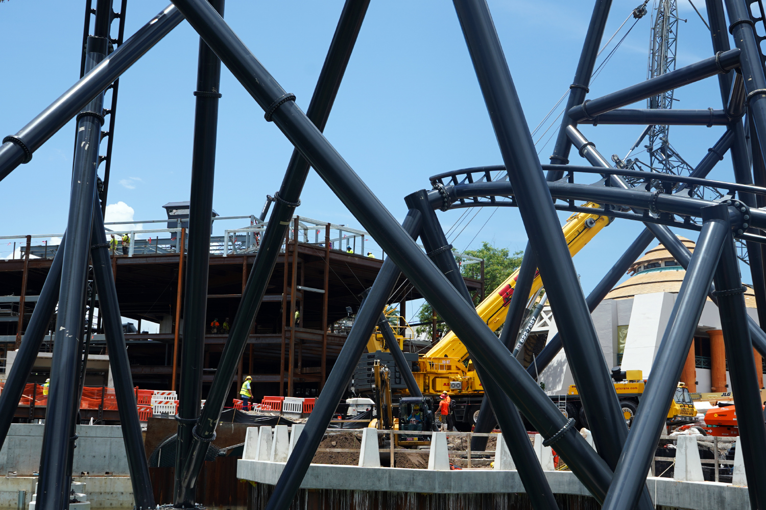 Construction continues on the Jurassic Park coaster, as track was installed at the highest point, “topping off” the top hat element of the coaster. A Jurassic Park/World flag was hung up on the track to celebrate the moment, as is the tradition in coaster construction. The height of the top hat element is rumored to be around 160-170ft tall.