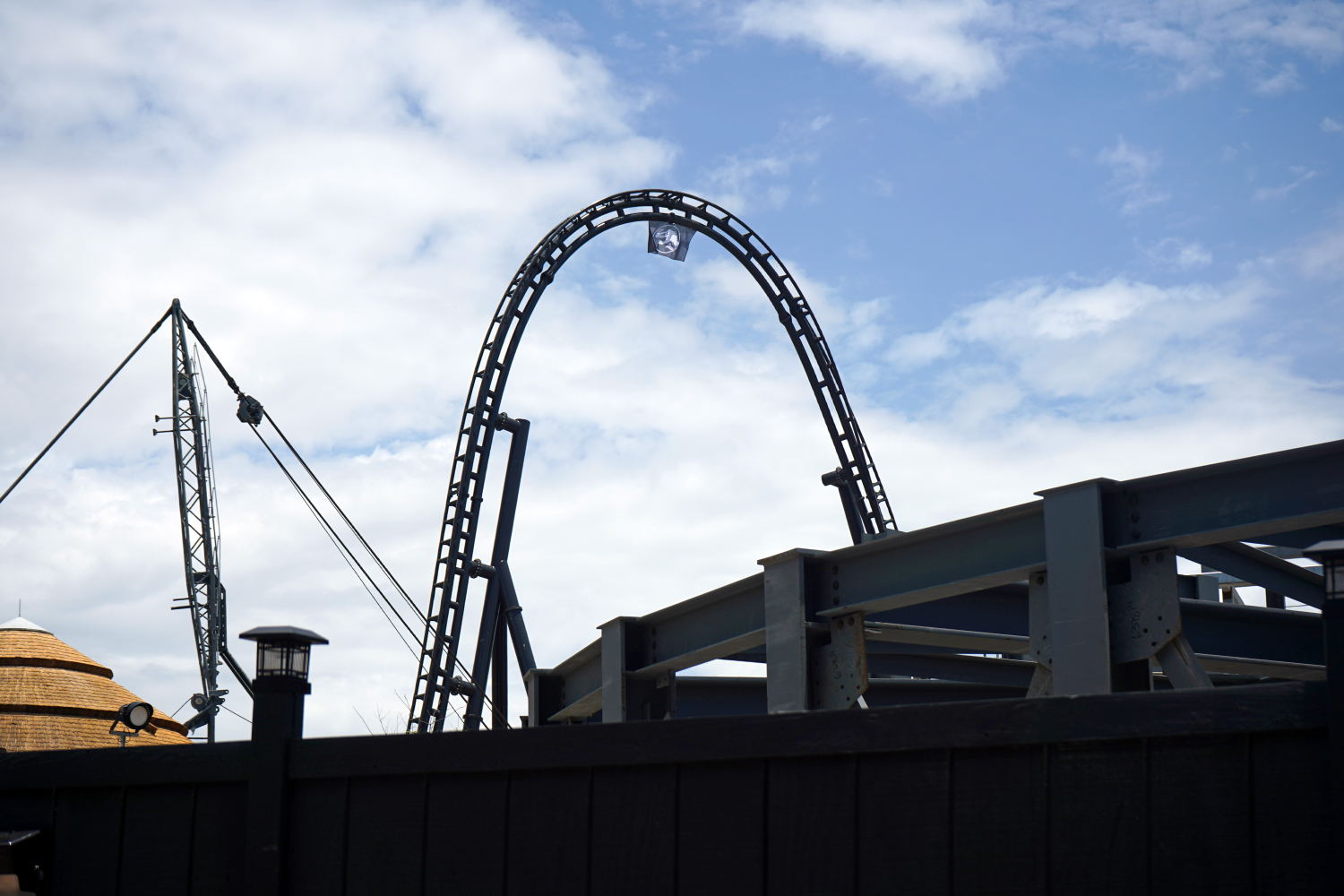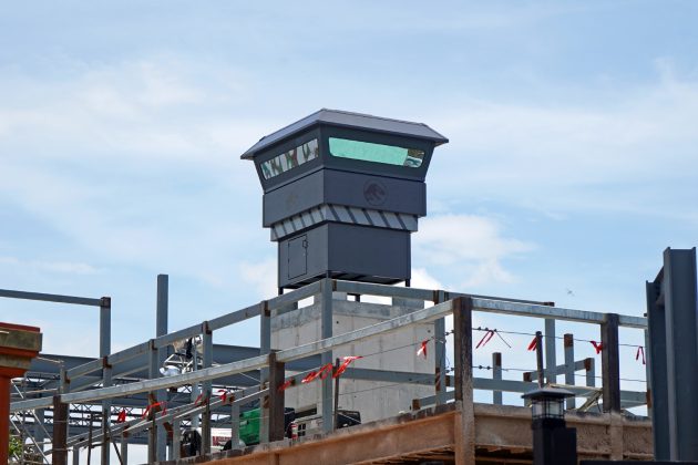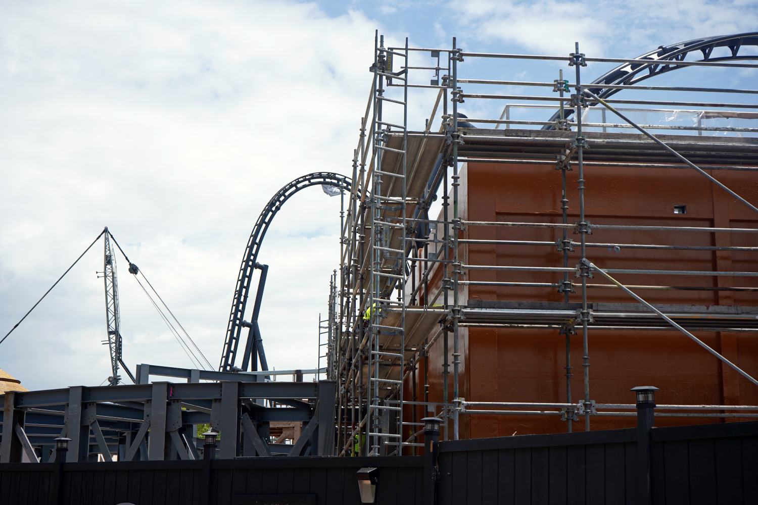 Once the track is finished, work will move on to themeing the surrounding area, including rockwork. Recently, a watchtower thematic prop was added in between all the twisting steel.
