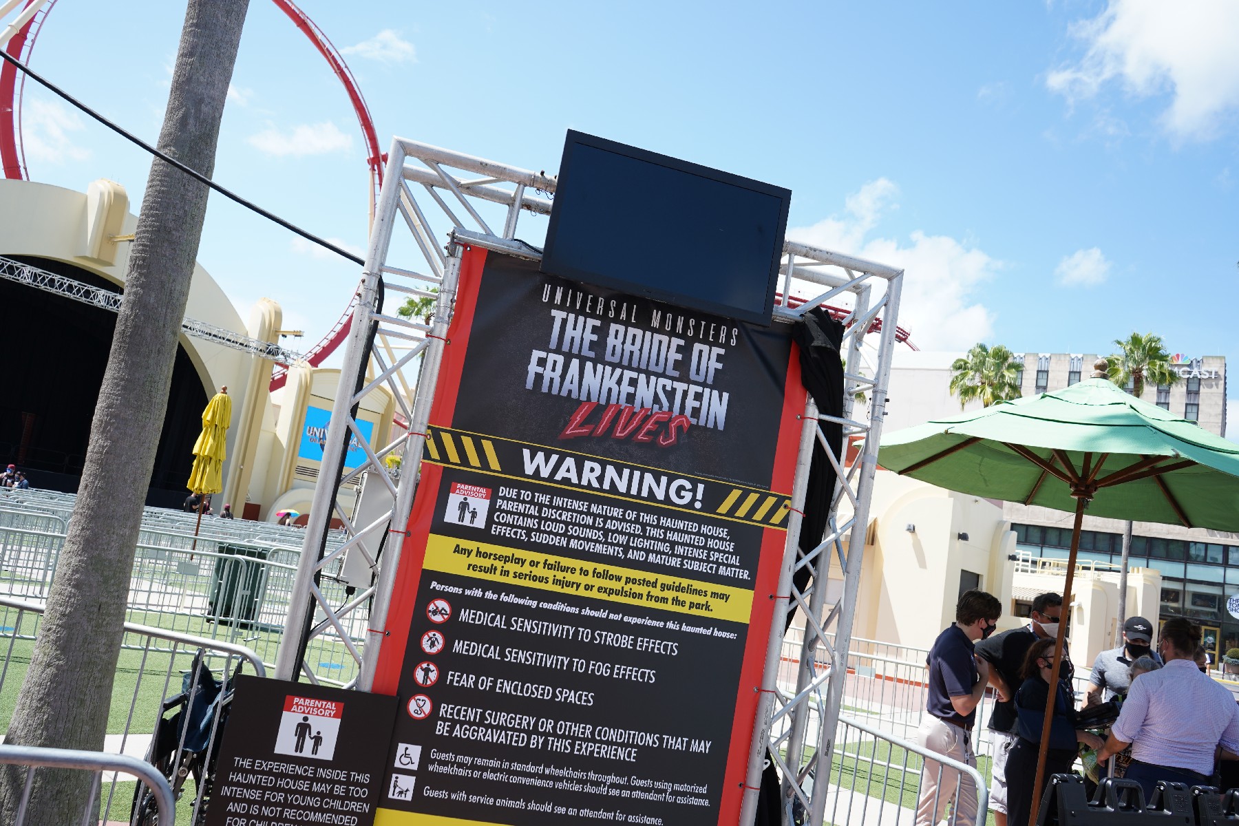 Both houses have been altered to adhere to the new pandemic safety guidelines, which makes the experience a lot different than your traditional Horror Nights house run. The “SiF” (Stuff in Face) is gone, plexiglass has been installed to separate actors from guests, and guests are now pulsed to help keep social distancing enforced.