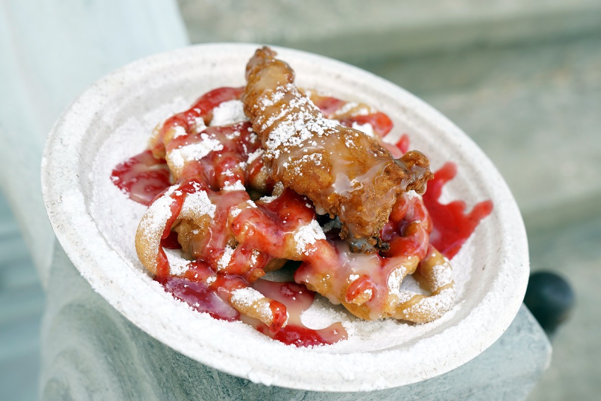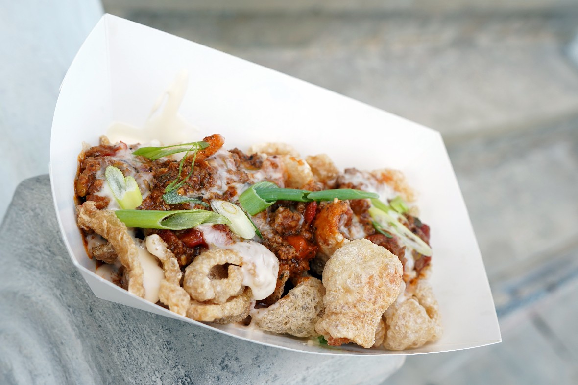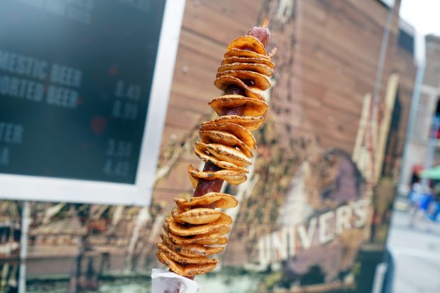 Universal also added 2 food trucks that featured some crazy twists on food, including Twisted Tater Hot Dogs, Pork Rind Nachos, and Fried Chicken and Funnel Cake. Of the three, we really enjoyed the sweet and salty combo of the Fried Chicken and Funnel Cake, officially called Franken Fried Chicken and Funnel Brains. The strawberry sauce surprisingly pairs well with the chicken, which is something I would have never expected to say. The Twisted Tater Hot Dog comes as a basic tater wrapped around the dog, with the option to add “Blood and Guts” aka cheese and chili. The Pork Rind Nachos, aka the Electrofied Skin and Guts, had good flavor but was a tough chew.