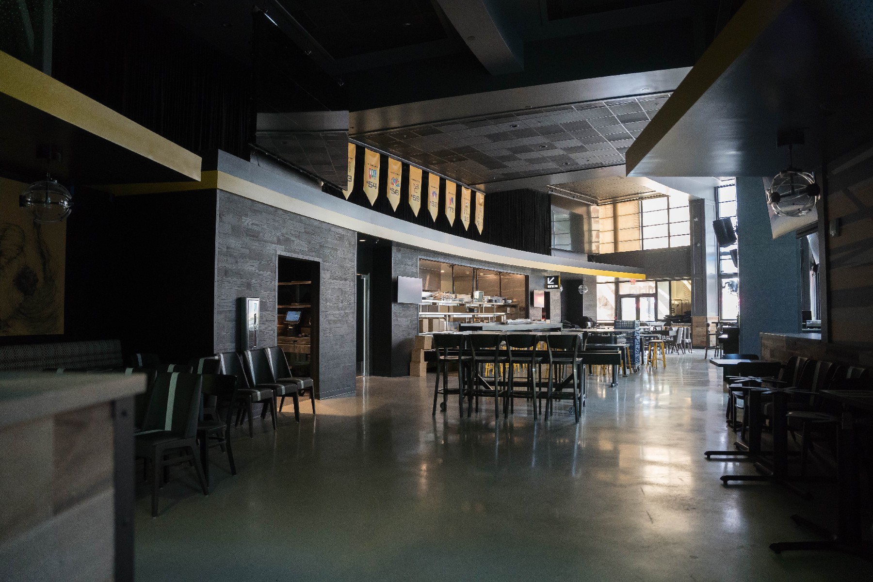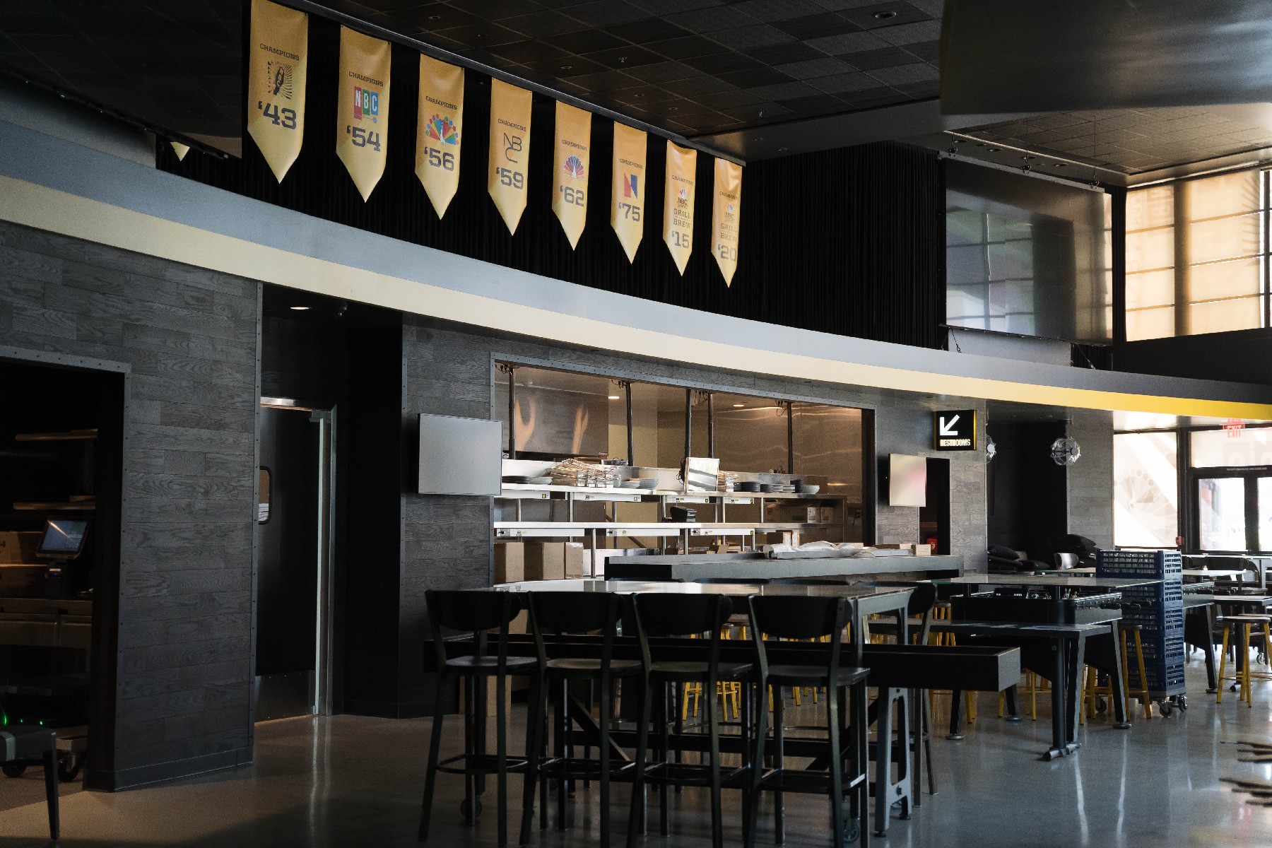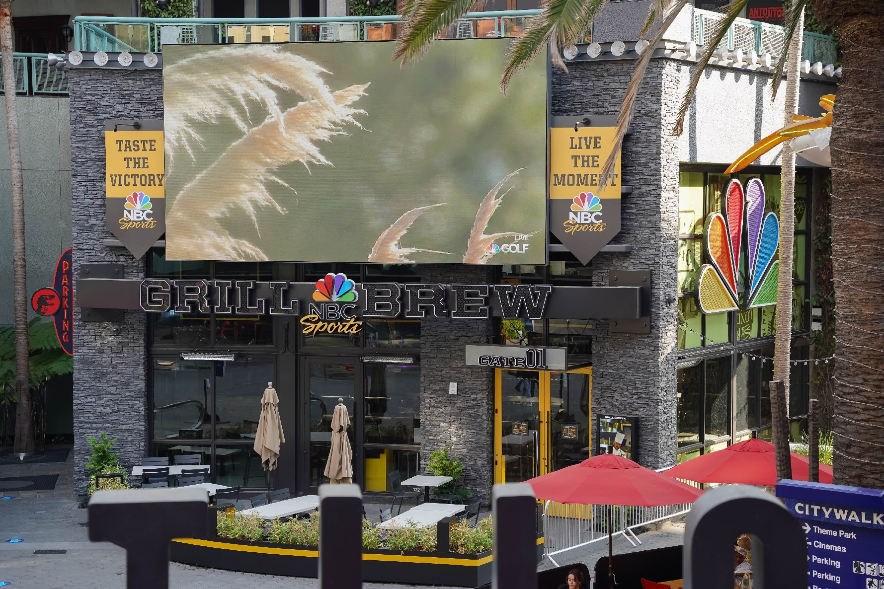 As construction appears to have completed on the new NBC Sports Grill & Brew, the restaurant remains dark on the inside while the big screen on the front of the building continues to play a loop of sports clips. No opening date has been announced as of this update as the location’s front patio continues to be used as overflow seating for Antojitos.