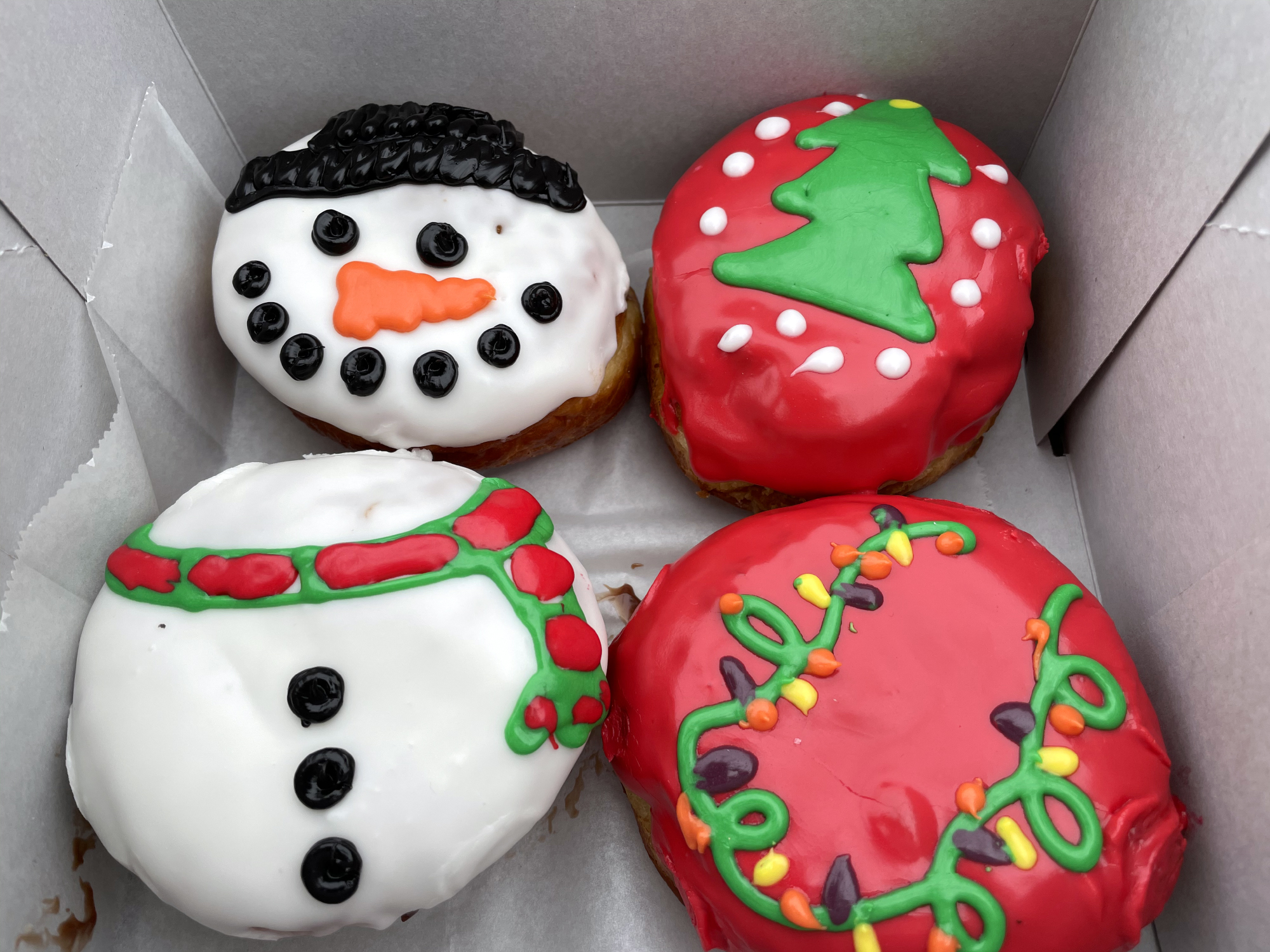 The Holiday Ornament Doughnut comes in 2 designs, but both are dipped in vanilla icing, filled with gingerbread cheesecake.